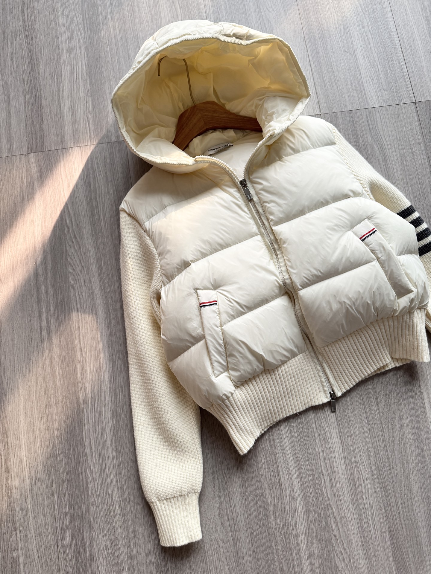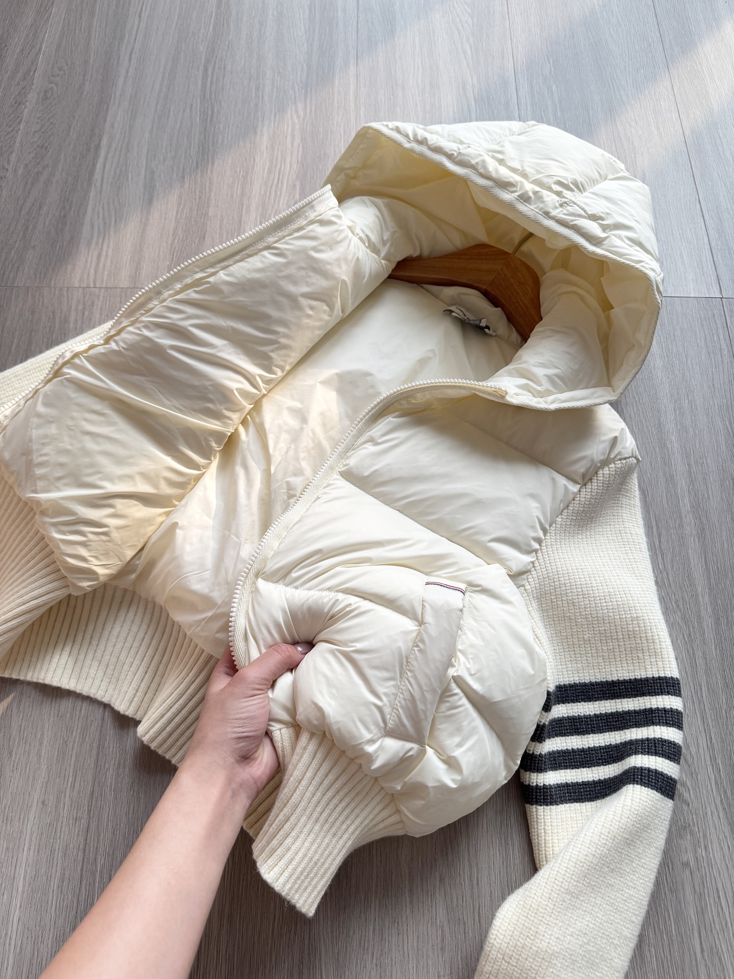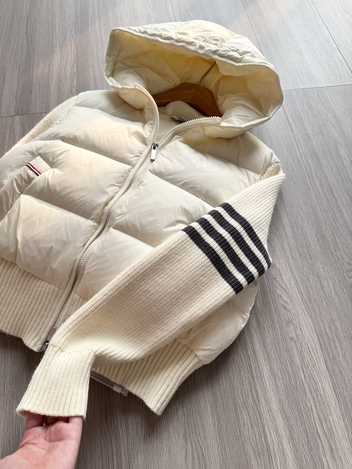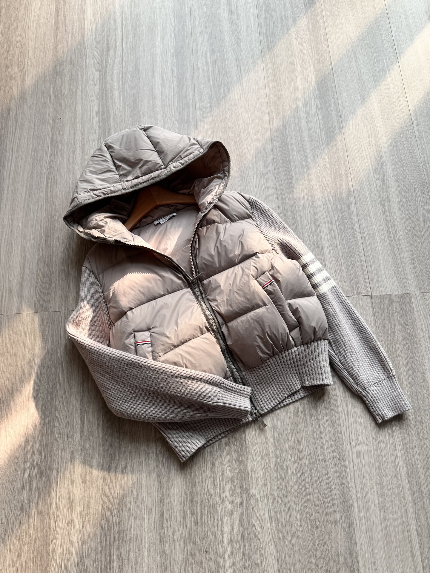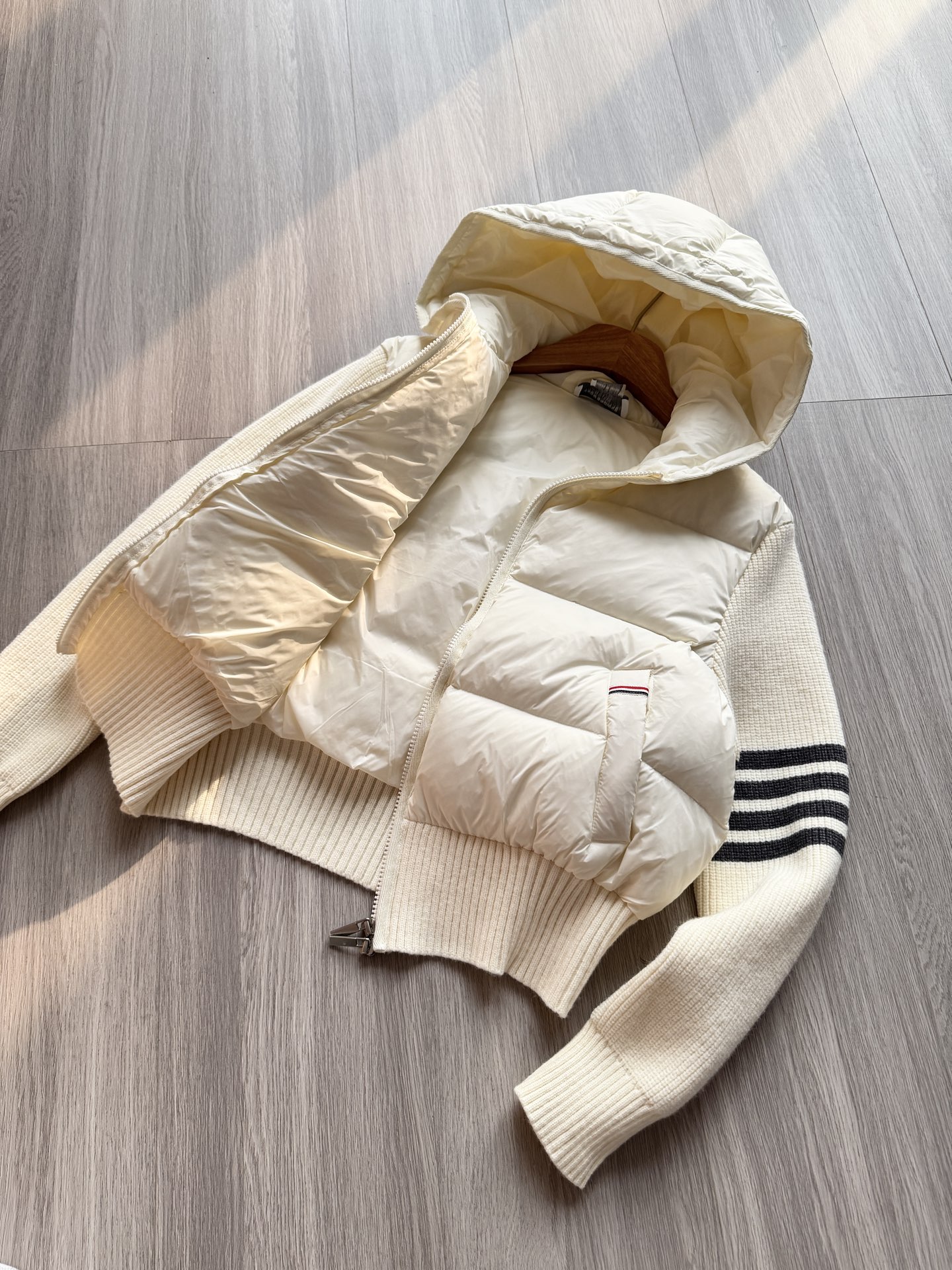 TB 25Ss秋冬最新款羊毛拼接羽绒服外套 国标进口90白鸭绒填充,轻盈舒适自带发热保暖功能 拼接美利奴羊毛舒适厚实的手感 !气质连帽双拉链设计 ,极简休闲收腰版型 ,不挑人上身超显瘦 ,休闲百搭神器 !意式优雅高级感随性又大气