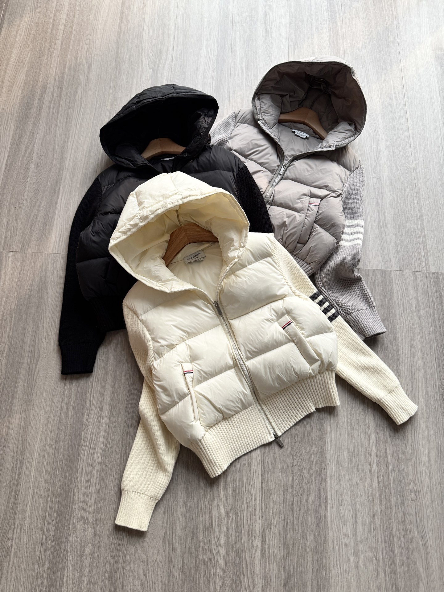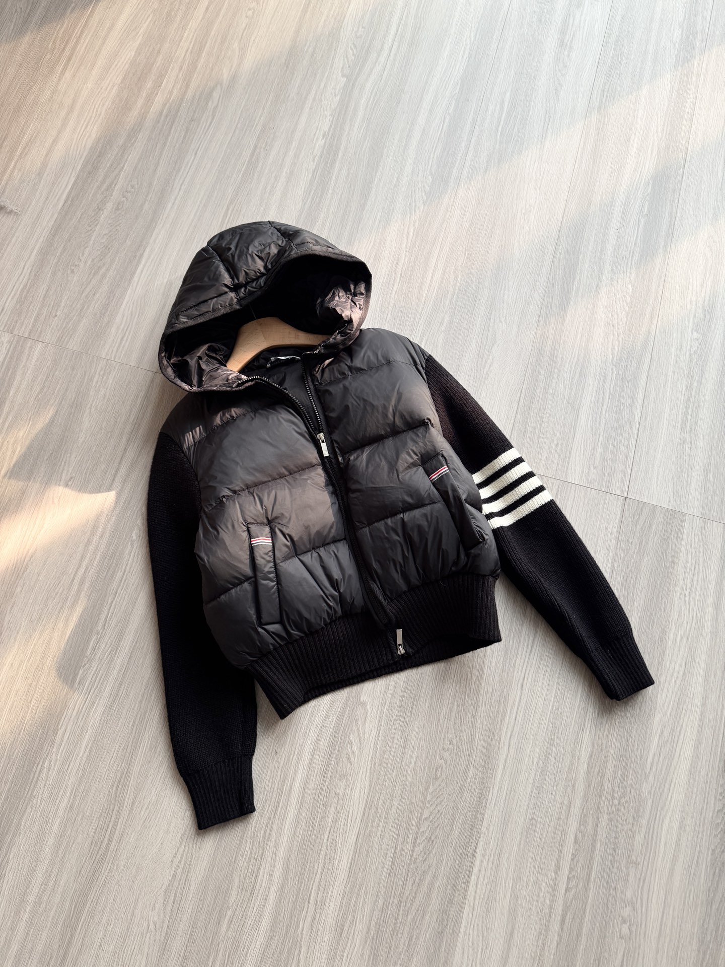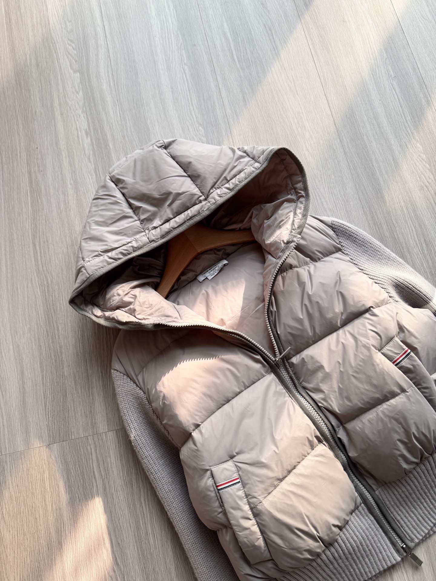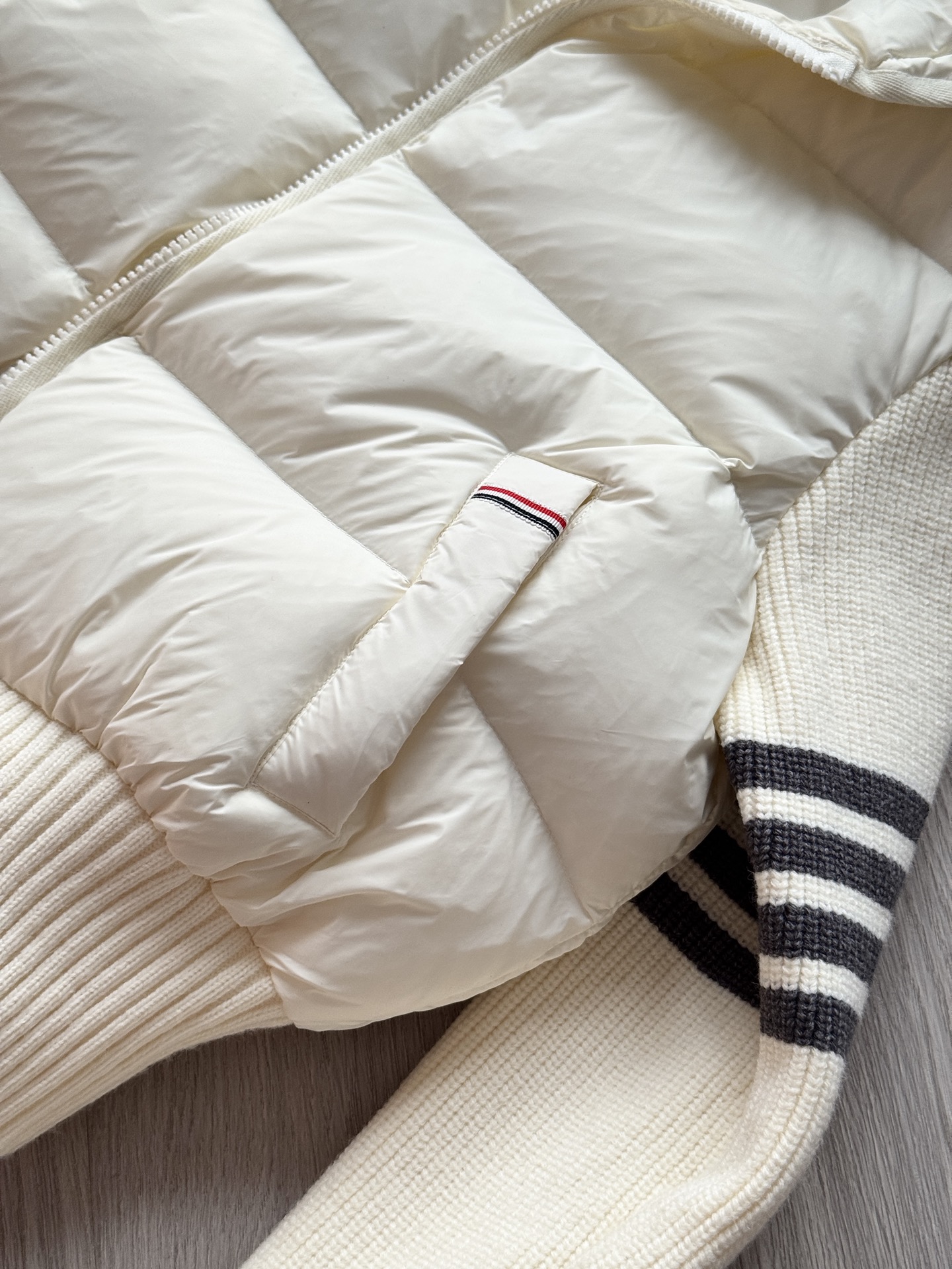 TB 25Ss秋冬最新款羊毛拼接羽绒服外套 国标进口90白鸭绒填充,轻盈舒适自带发热保暖功能 拼接美利奴羊毛舒适厚实的手感 !气质连帽双拉链设计 ,极简休闲收腰版型 ,不挑人上身超显瘦 ,休闲百搭神器 !意式优雅高级感随性又大气