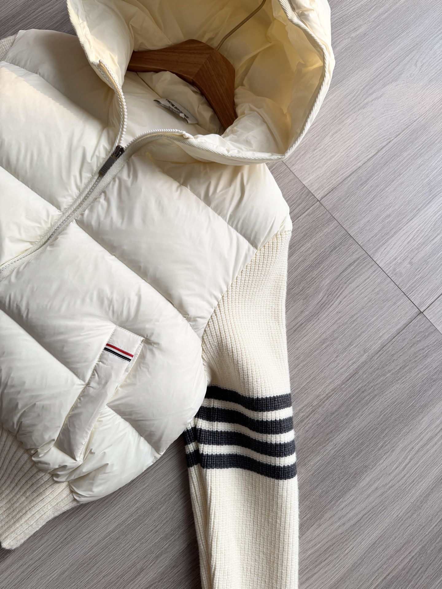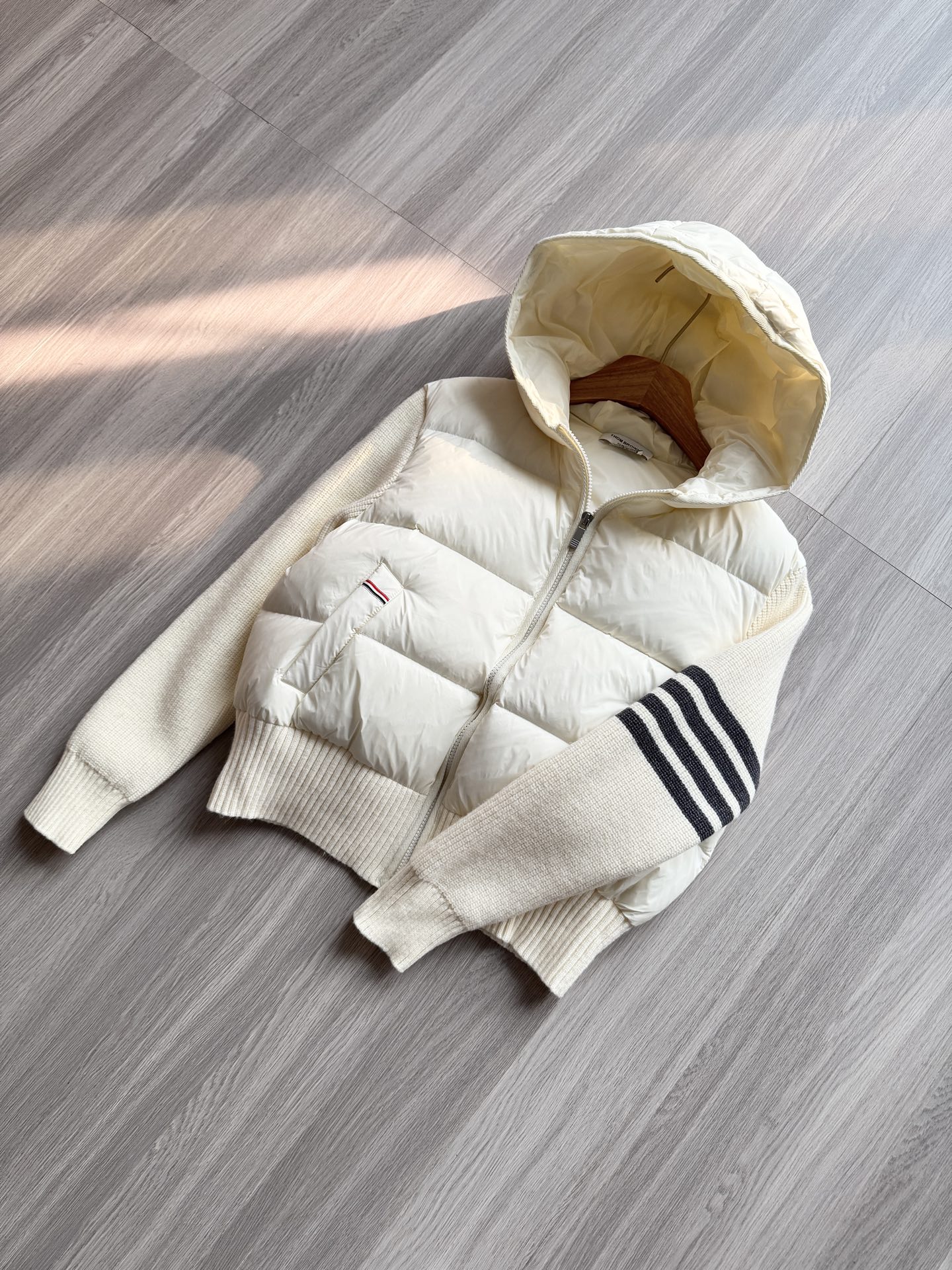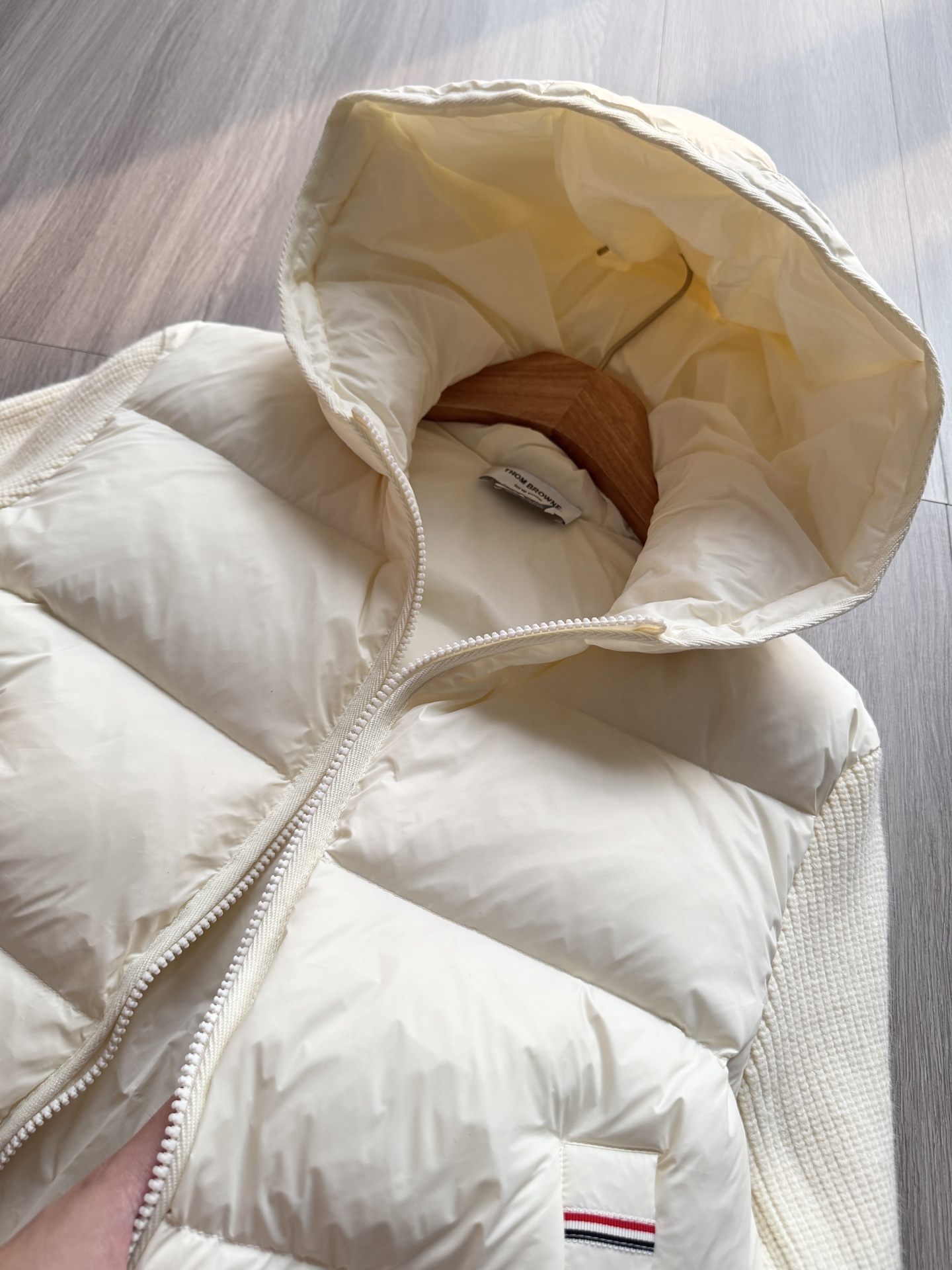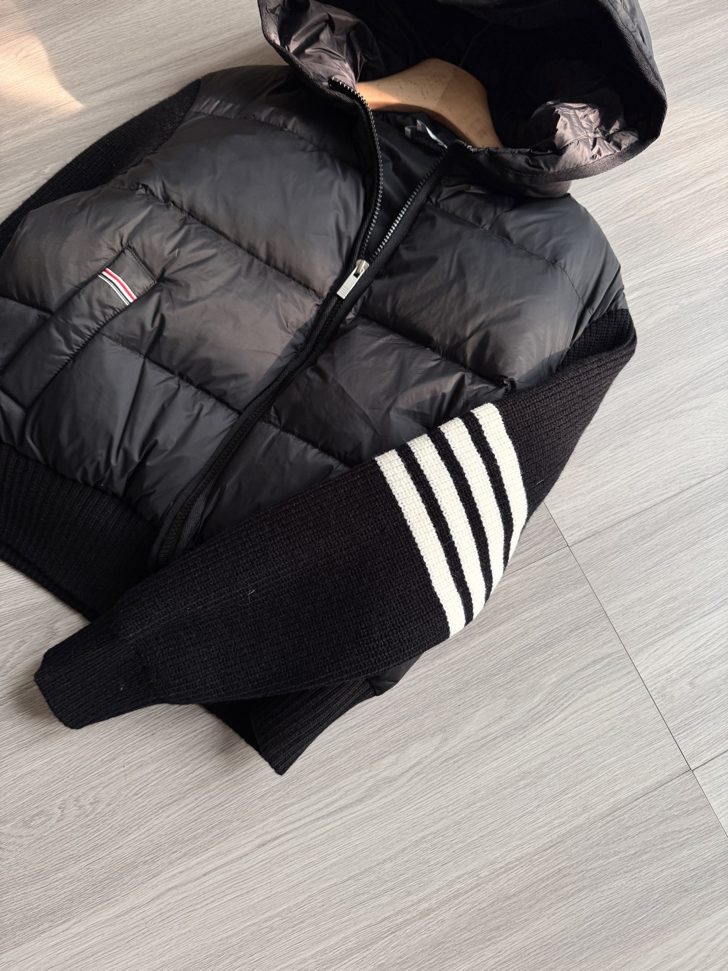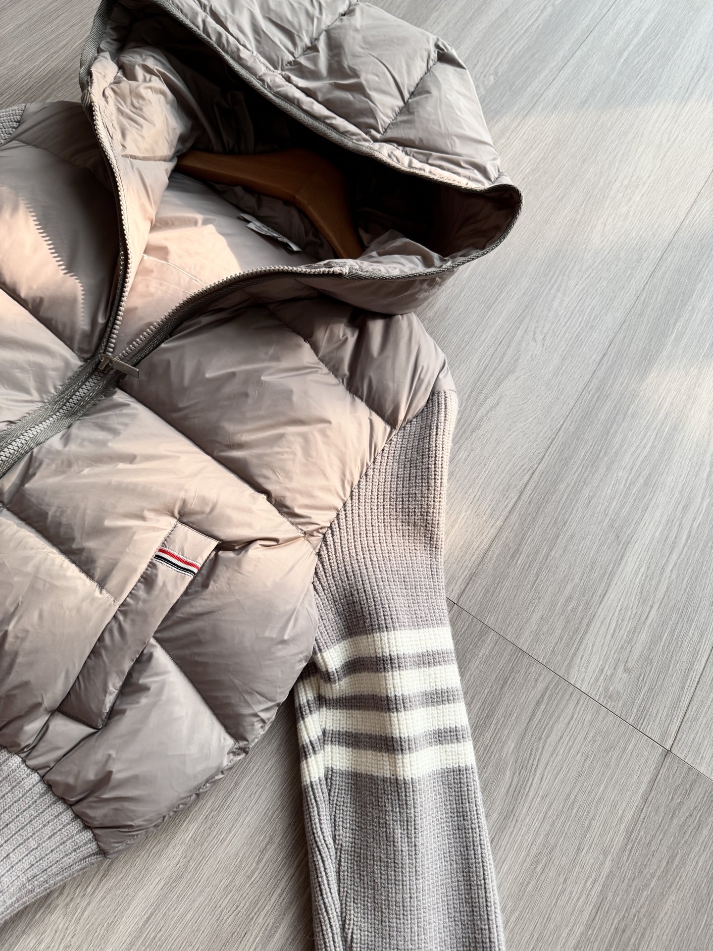 TB 25Ss秋冬最新款羊毛拼接羽绒服外套 国标进口90白鸭绒填充,轻盈舒适自带发热保暖功能 拼接美利奴羊毛舒适厚实的手感 !气质连帽双拉链设计 ,极简休闲收腰版型 ,不挑人上身超显瘦 ,休闲百搭神器 !意式优雅高级感随性又大气