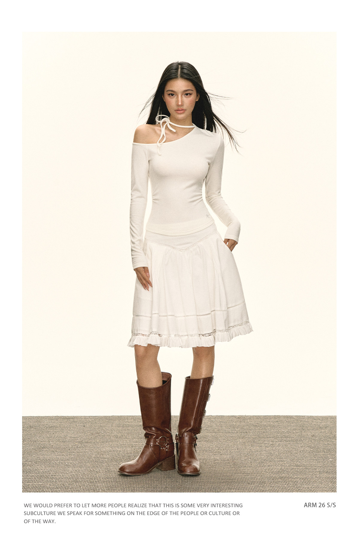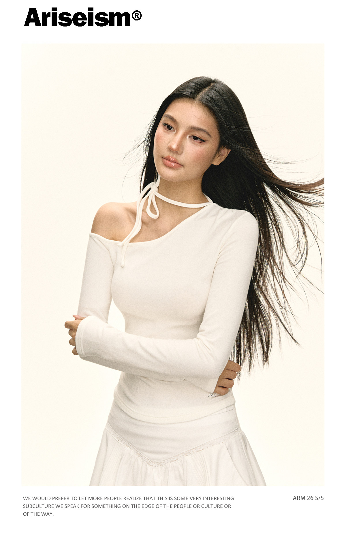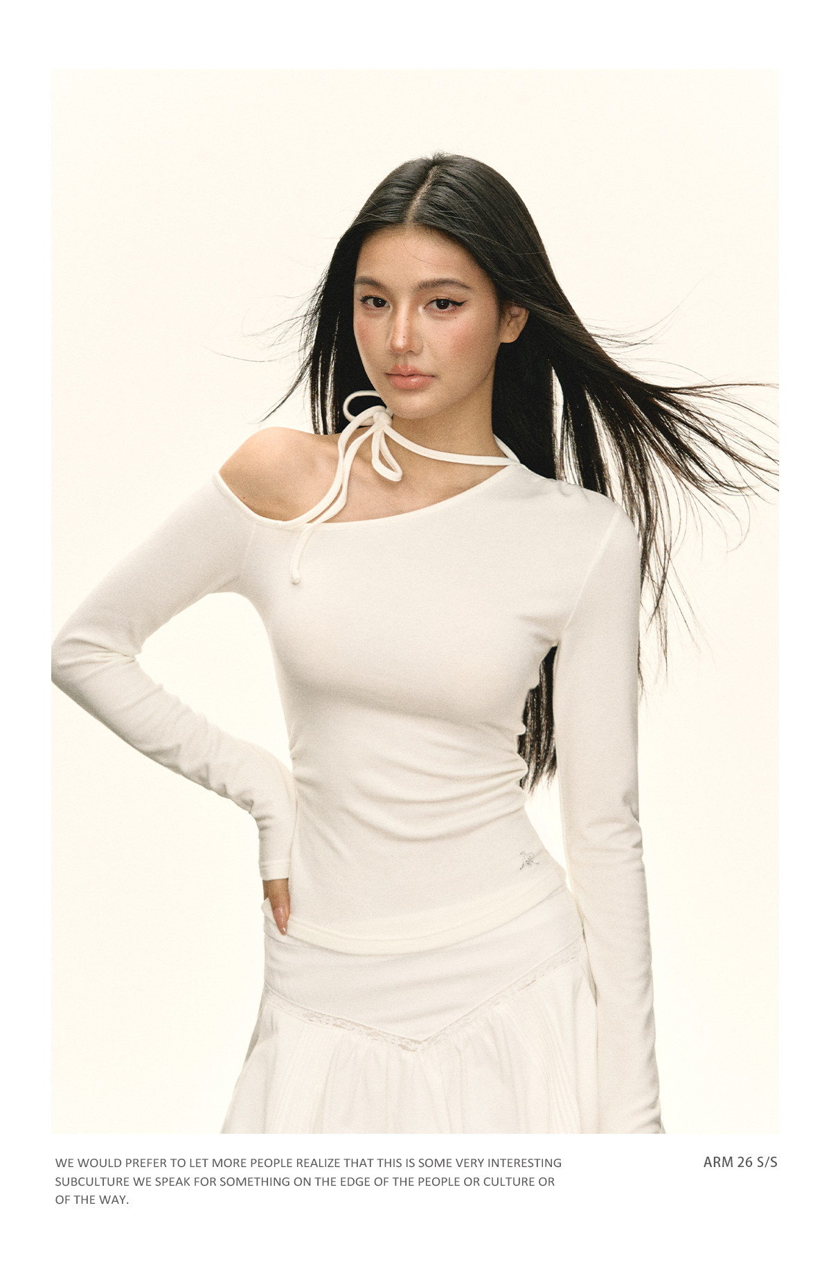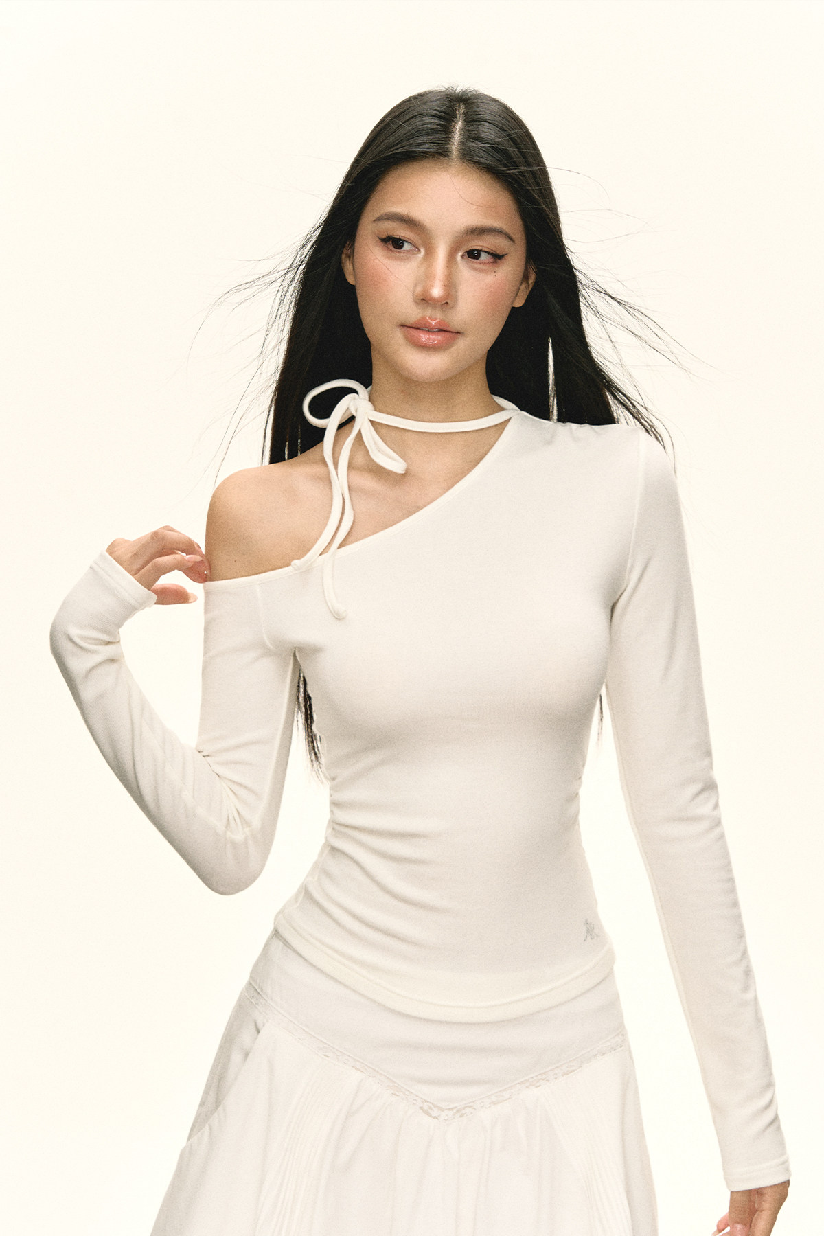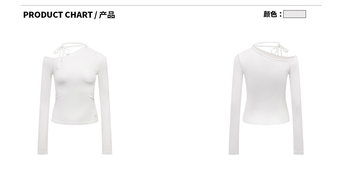 Ariseism 美式复古设计感斜肩绑带白色长袖女春季新款修身上衣