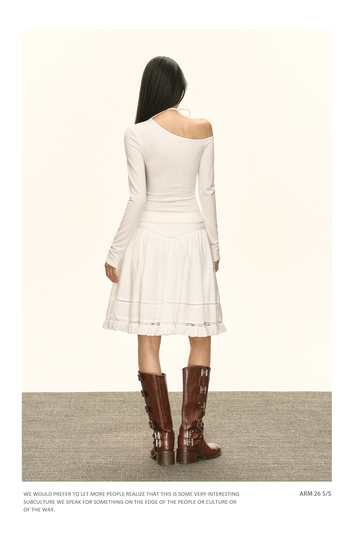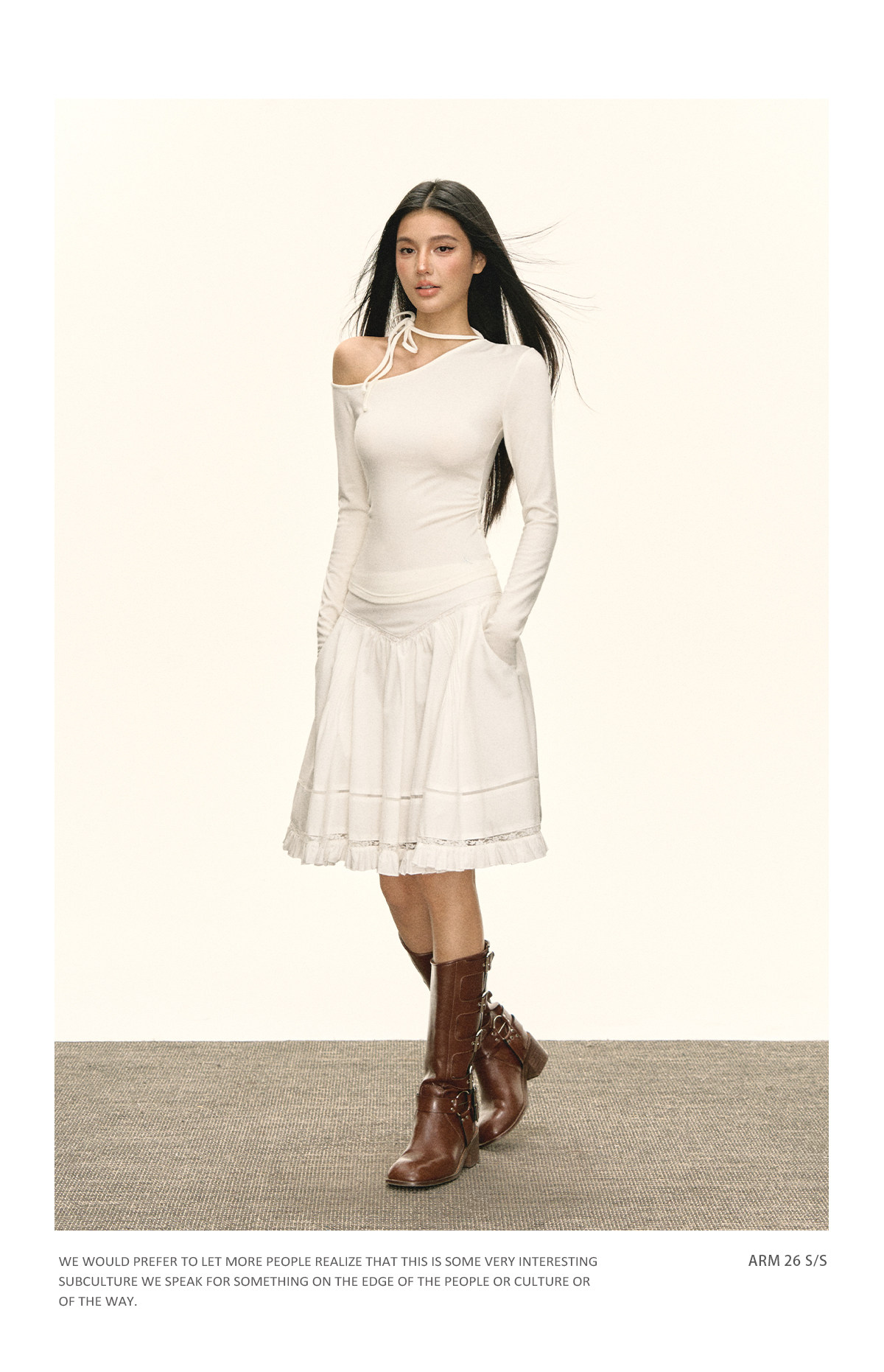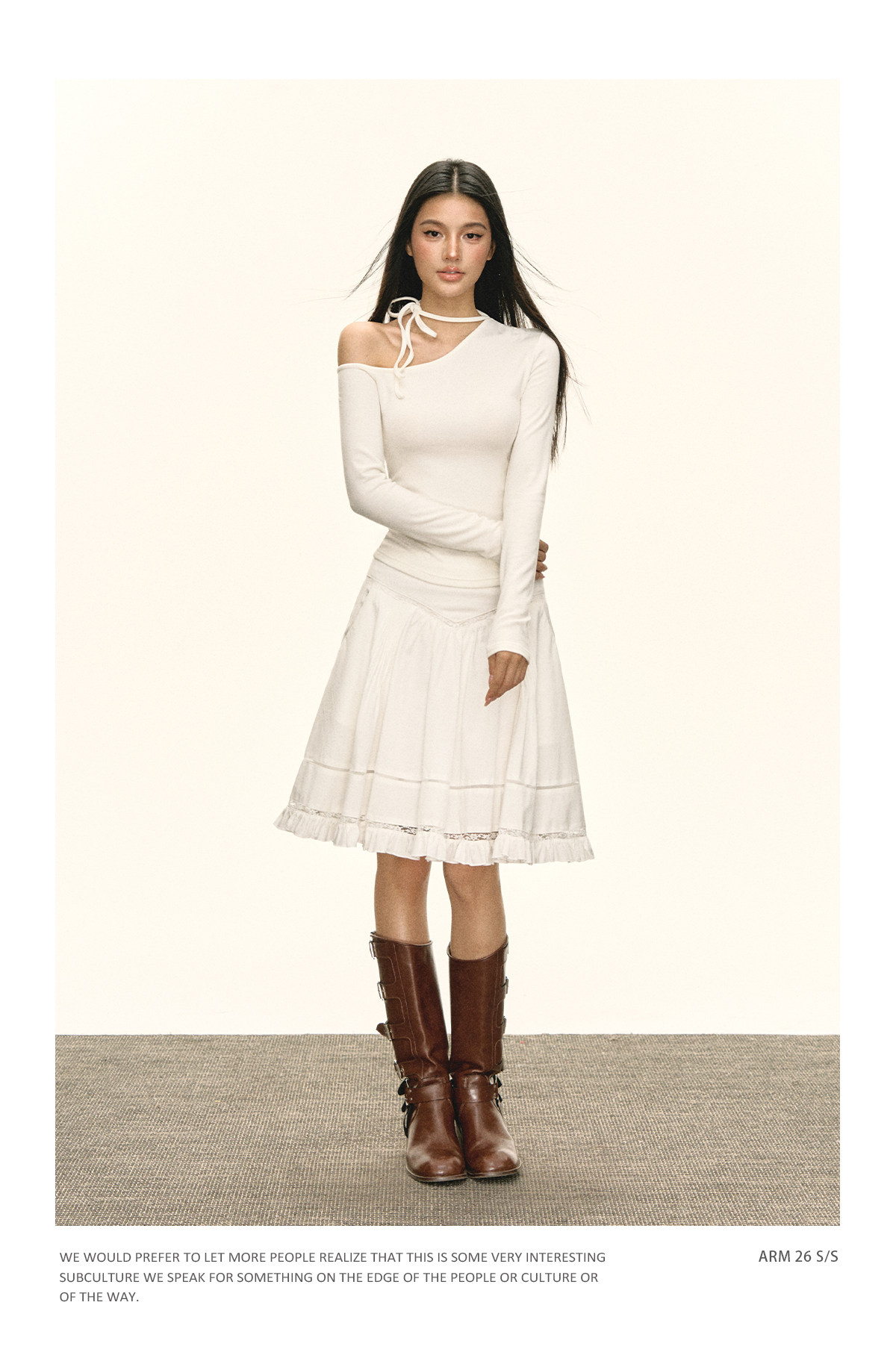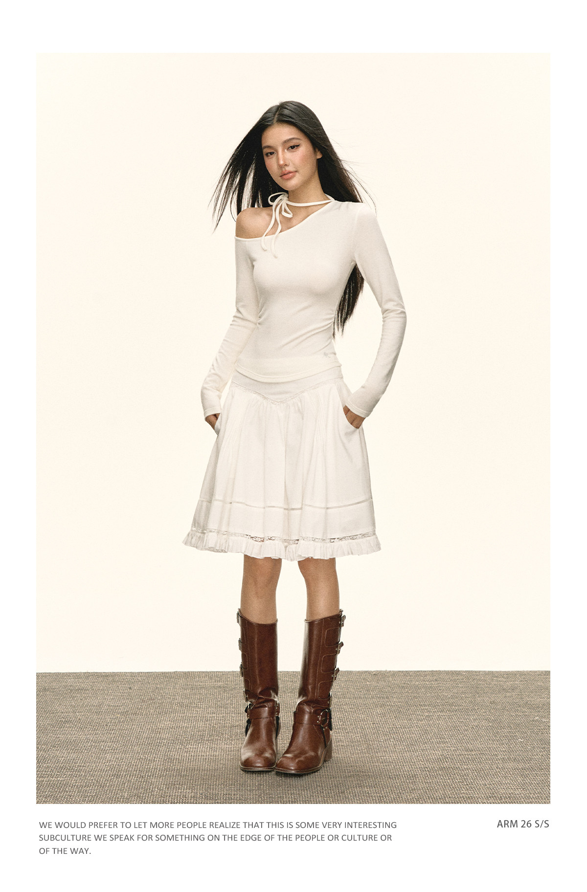 Ariseism 美式复古设计感斜肩绑带白色长袖女春季新款修身上衣