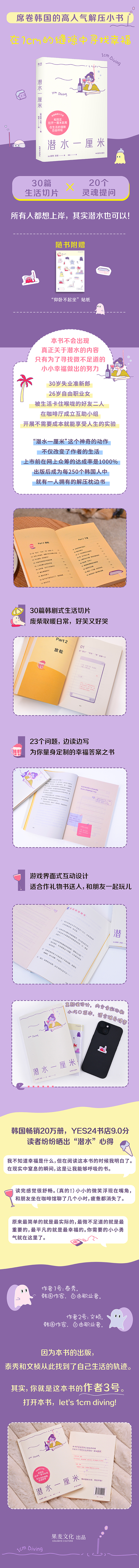 “潜水一厘米”这个神奇的动作不仅改变了作者的生活,韩国上市前曾在网上众筹,达成率是1000%,出版后销售突破20万册,成为年轻人抢读的“心灵氧气罐”。