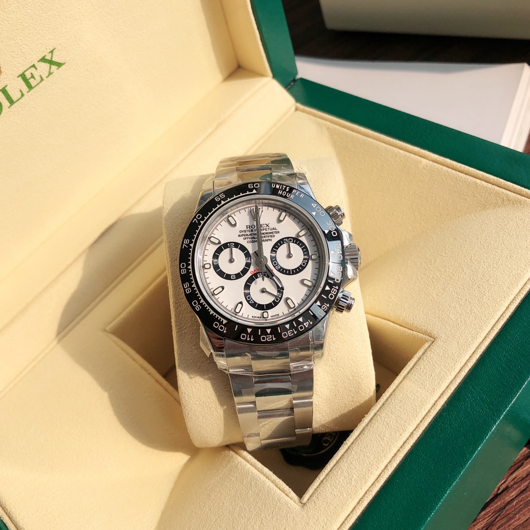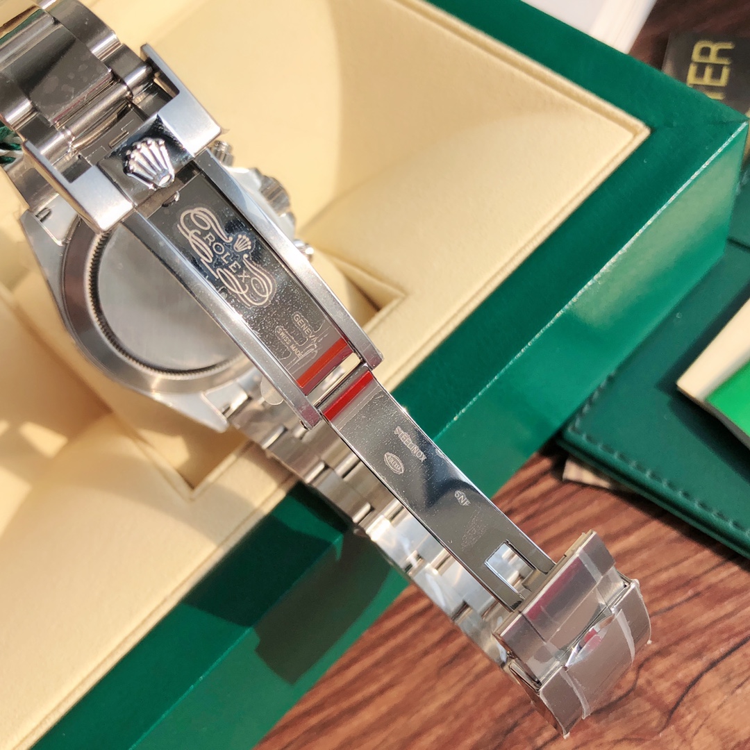 ROLEX-劳力士迪通拿系列。鼎力巨作 匠心打造 。每一块腕表均严格检测 搭载超级稳定4130机芯。一档调时。计时秒针 3字位9字位小针 功能原装一致!表壳原版开模,表盘尺寸40mm。厚度目前市面上最接近原装的13.2mm。陶质实心外圈连计速刻度(采用真陶瓷工艺 刮不花 永不退色 质感和正品一致)功能盘字体和盘面logo采用叠加印刷工艺,从侧面观察会有微微隆起之感。盘面的底色纹路经过无数次过滤改正,确保百分百吻合与原装。其上的劳力士金属LOGO单独开模,无论是立体感还是圆润度均可PK原装 易读Chroma light夜光显示 配长效夜光物质。表镜平形蓝宝石水晶玻璃 抗刮损,效果绝不重影,吻合正品。⚠⚠六字位正品一致的有防伪的小皇冠👑(注意细节)表扣采用进口精钢1:1散件打磨而成 拉沙内侧 腐蚀劳力士钢印 外置正品一模一样的表扣保险环,完美在每一个细节!配全套顶级包装!不满意支持退换,终身保修!
