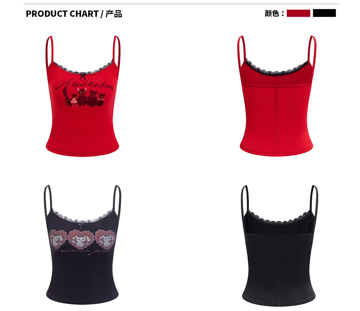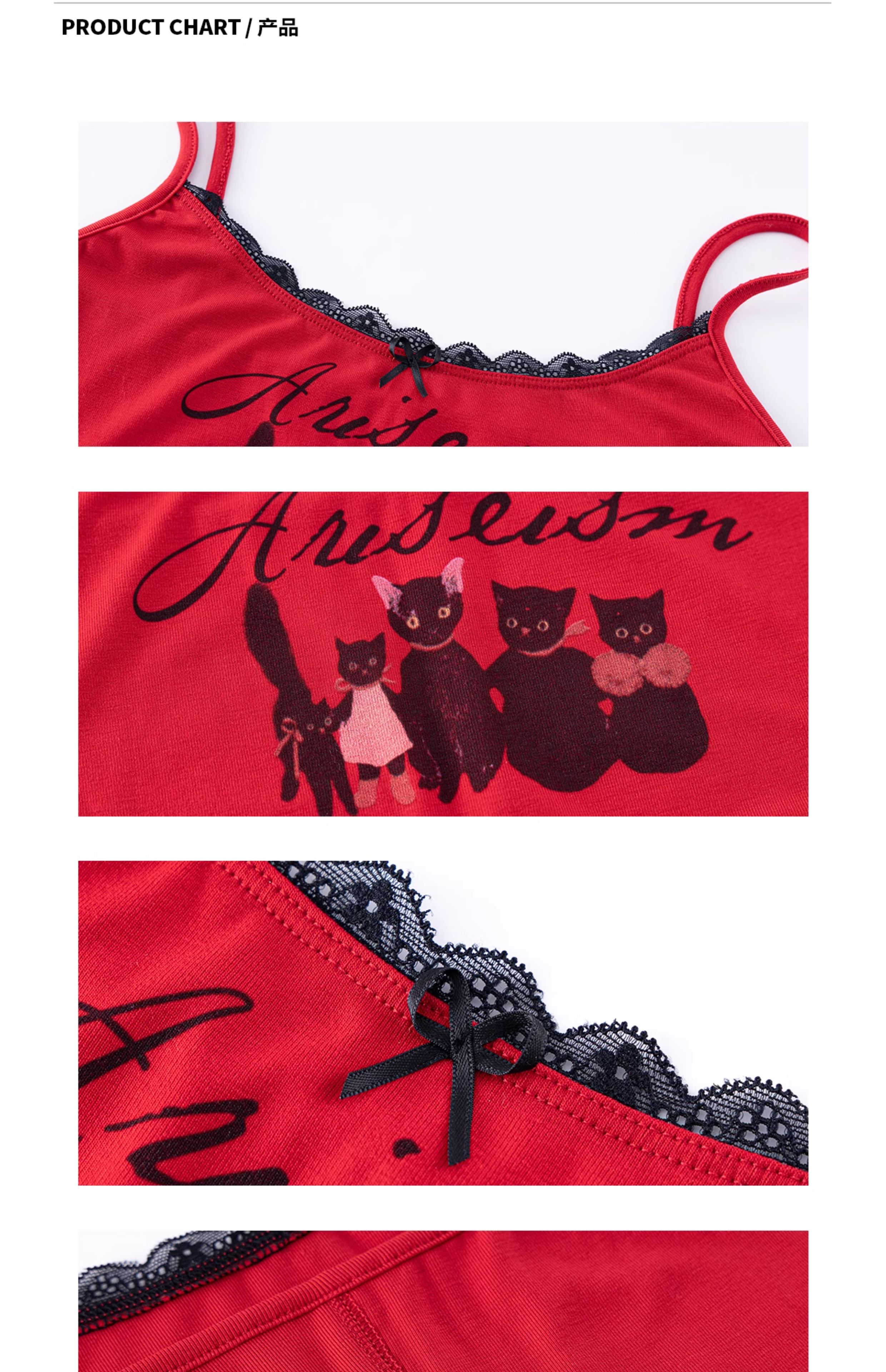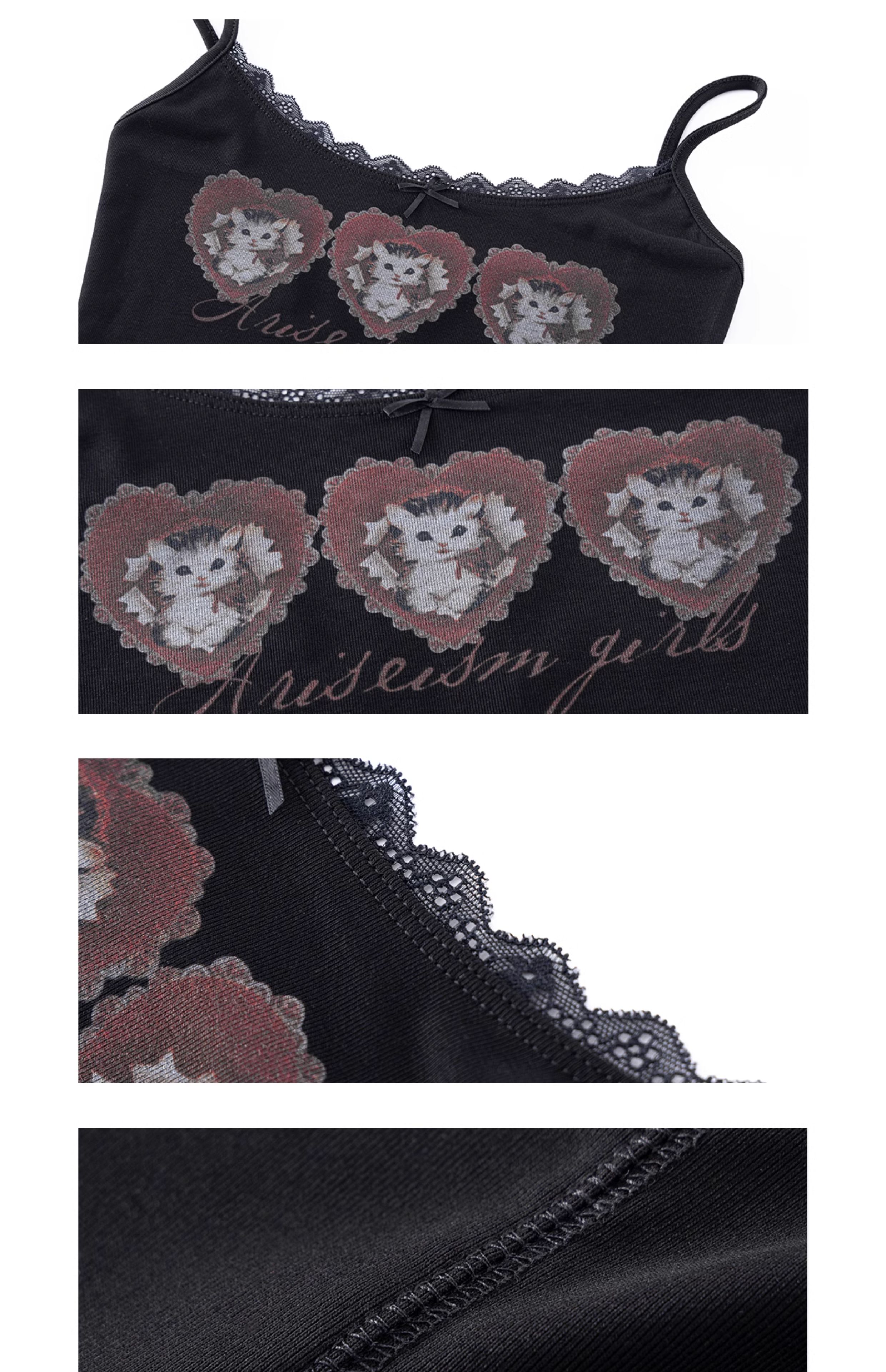 Ariseism美式复古设计感猫咪印花蕾丝吊带背心女夏季新款外穿上衣