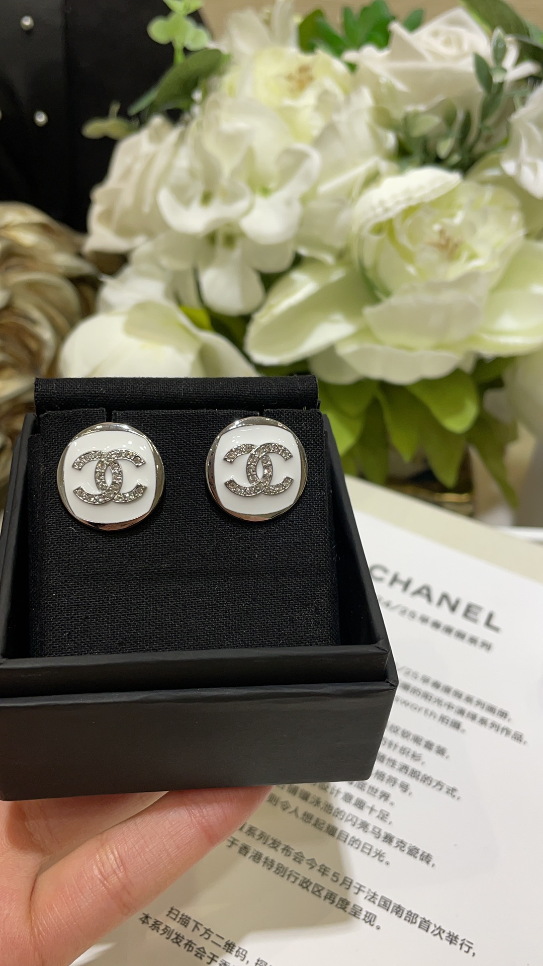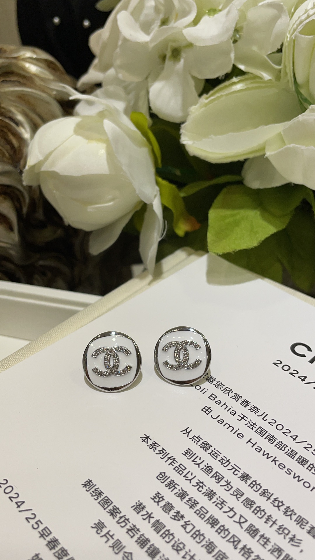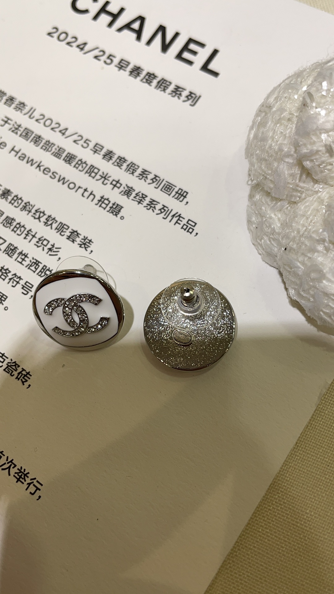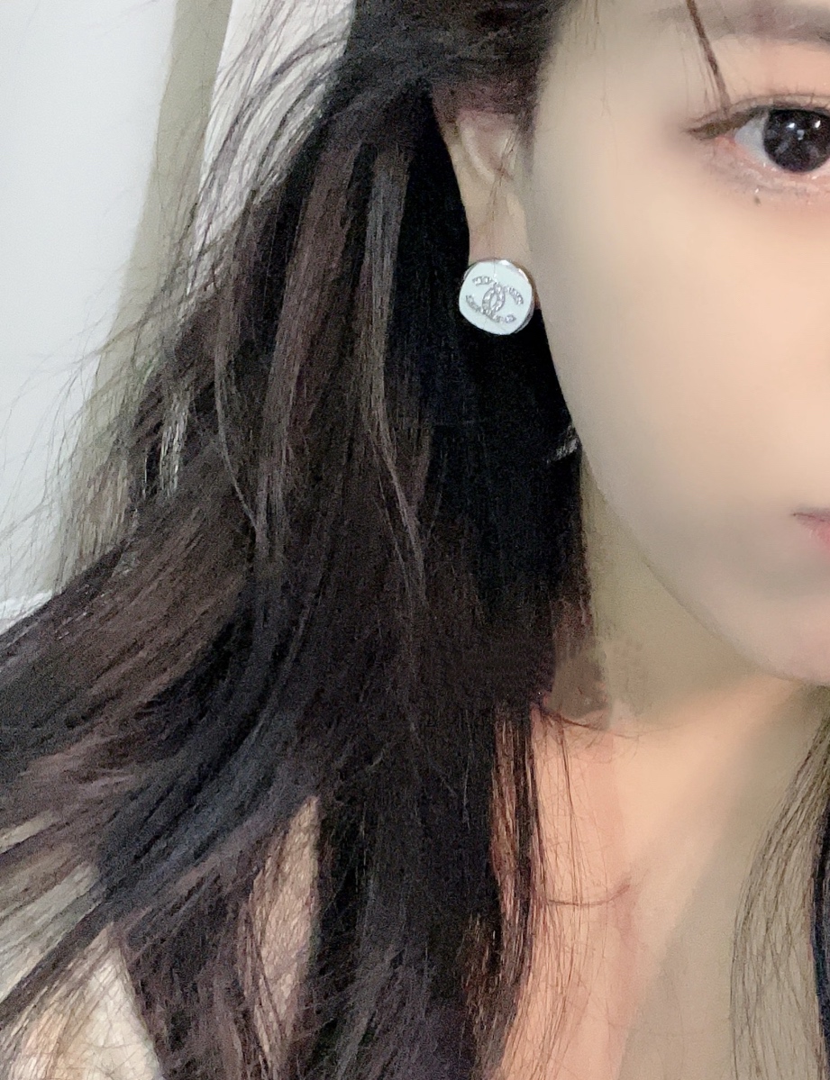 香奶奶 25C新款满钻双C白色珐琅银色纽扣圆形耳钉