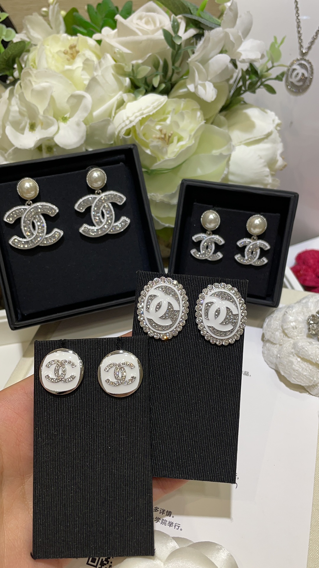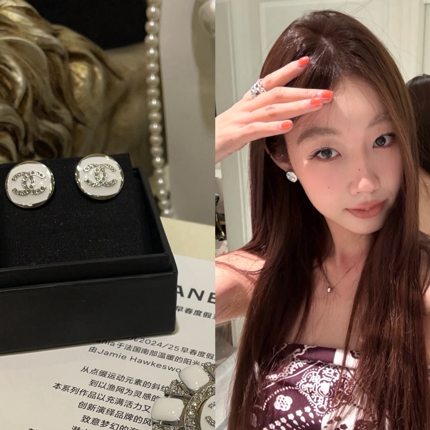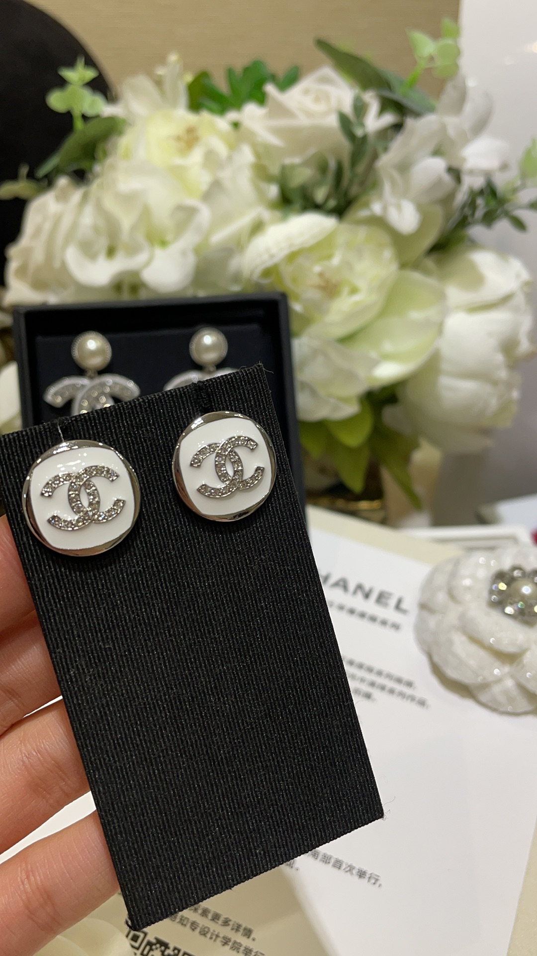 香奶奶 25C新款满钻双C白色珐琅银色纽扣圆形耳钉