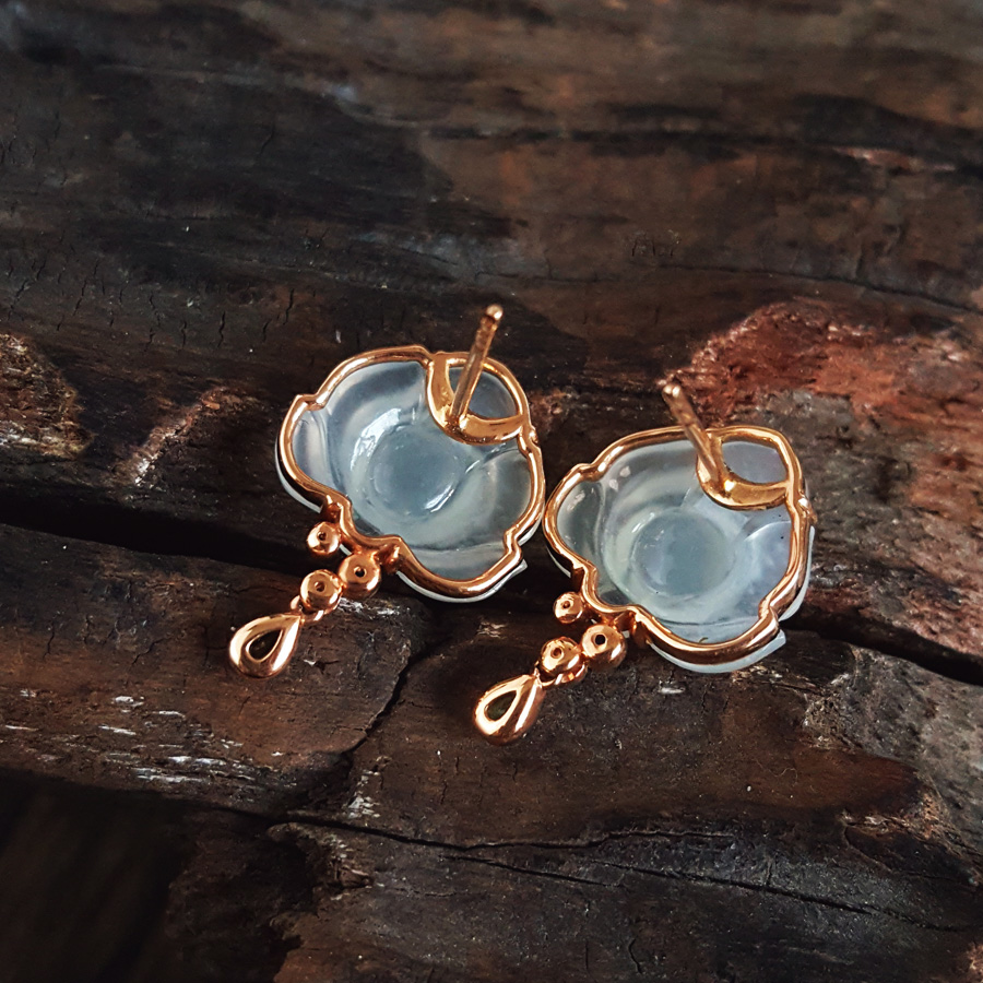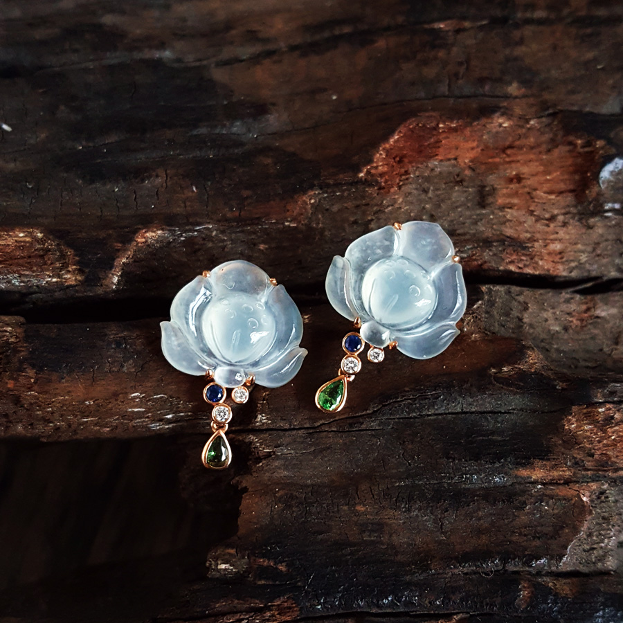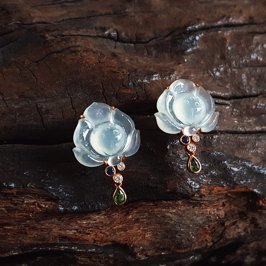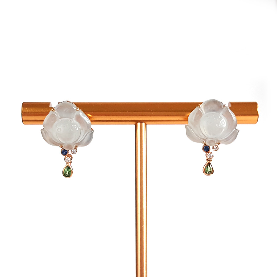 名称 | AU750玫瑰金镶钻镶天然冰种莲花造型翡翠(好运连连)耳环 |