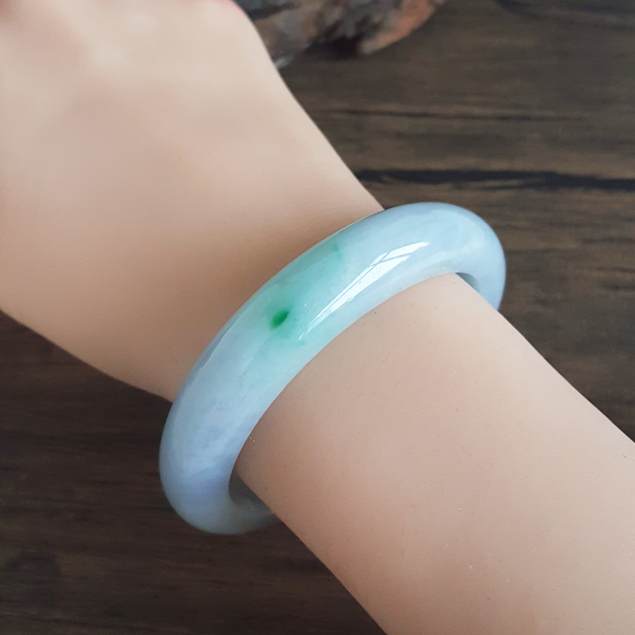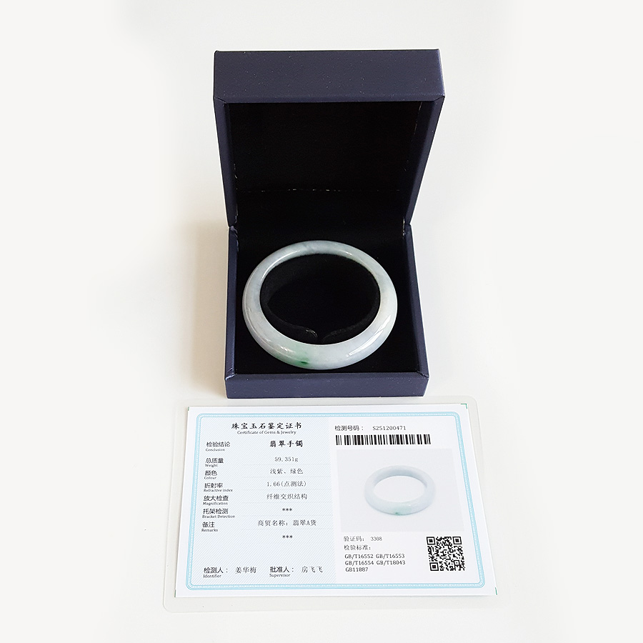 名称 | 天然精品正桩细腻无纹裂糯种春彩紫罗兰飘辣阳绿55.5号翡翠手镯 |