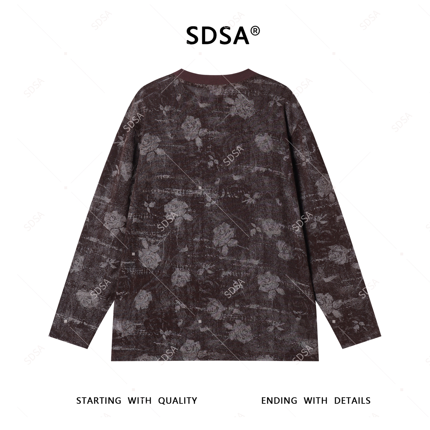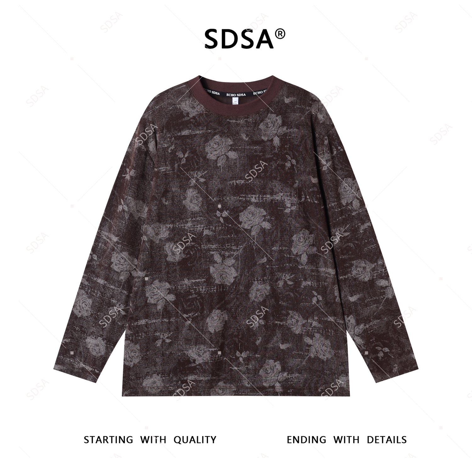T4430SDSA秋季新款男士痞帅美式玫瑰花印花圆领长袖T恤复古百搭时尚
