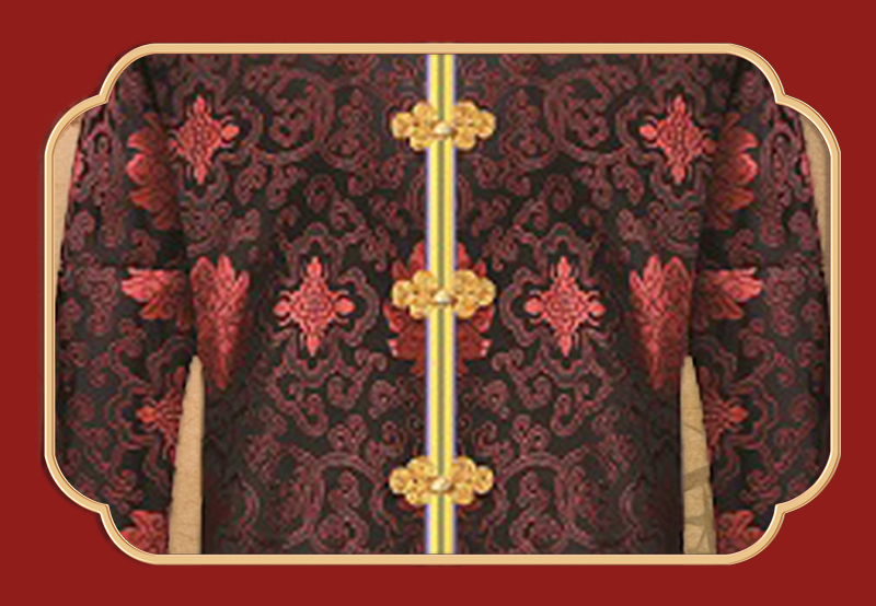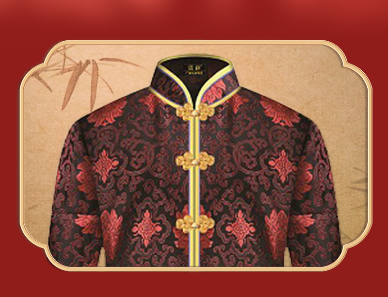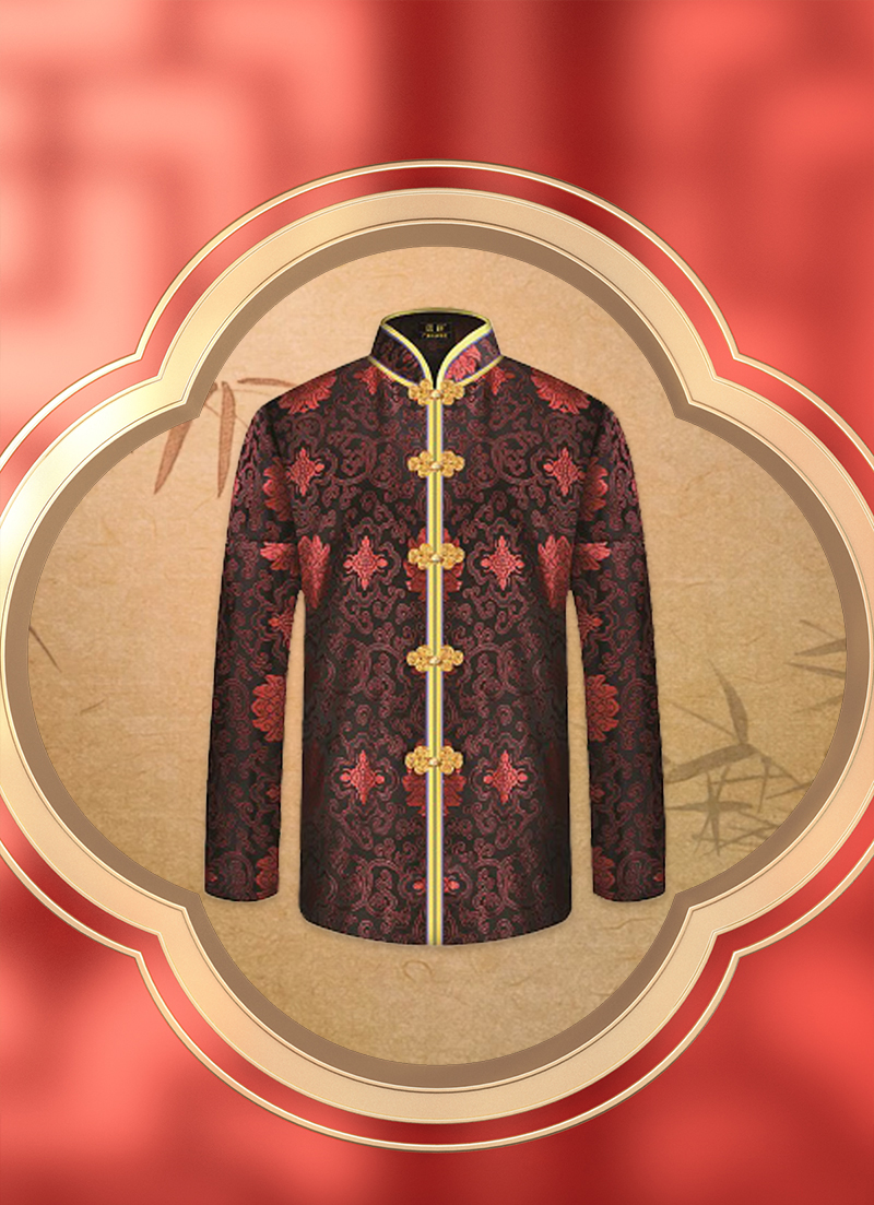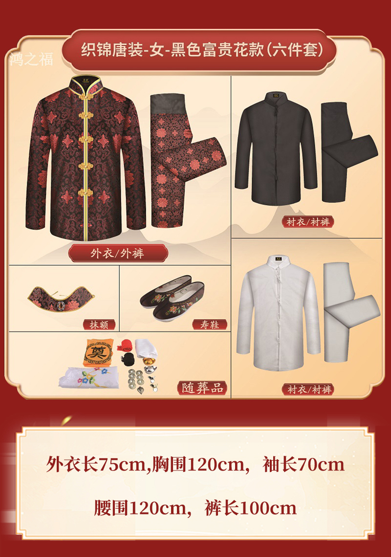 女士薄款织锦唐装黑底红富贵花6件套寿衣寿服套装