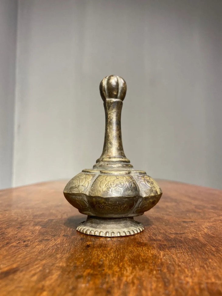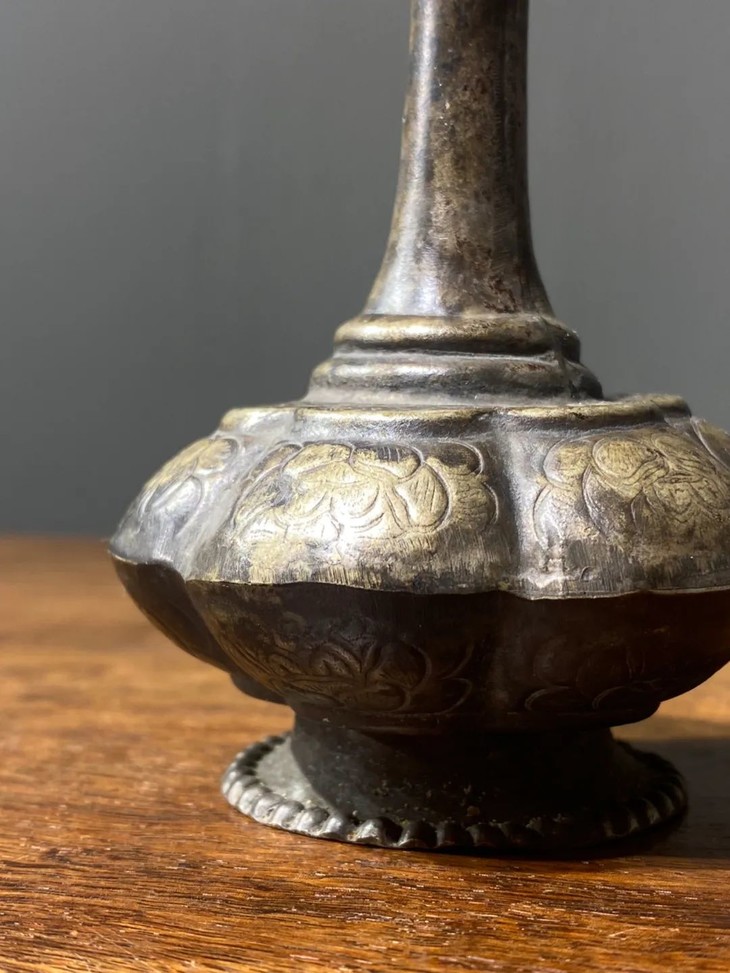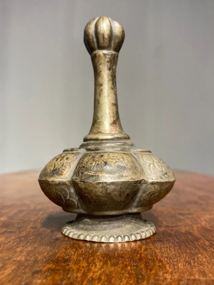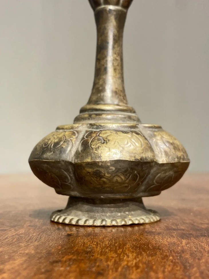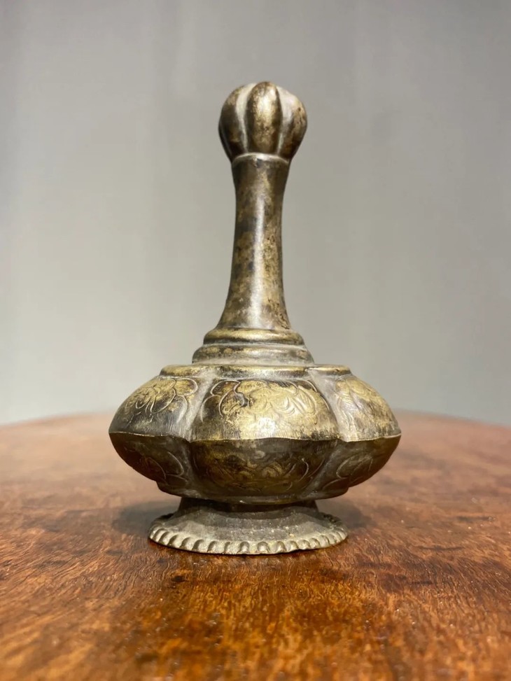 此青铜鎏银錾花瓜棱直颈净水瓶表面光滑细腻,小局部附着凸起的铜锈,整体器身包浆皮壳细腻温润,贵气典雅,尽显佛教器物“少即是多”的审美情趣。