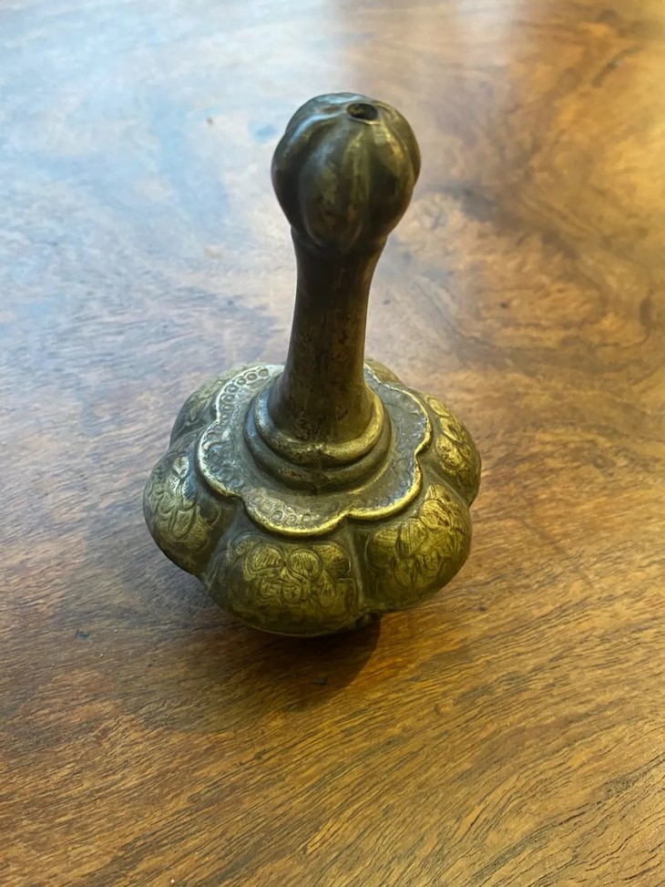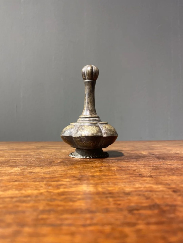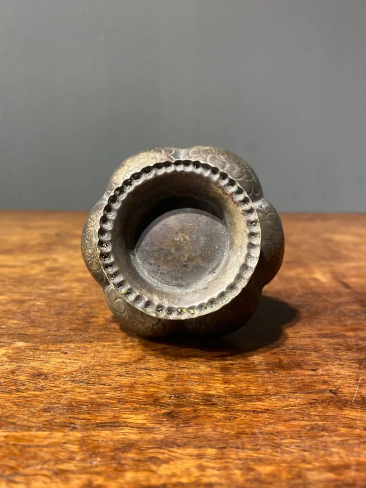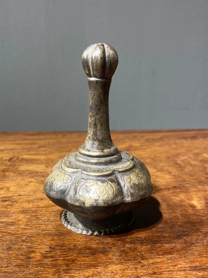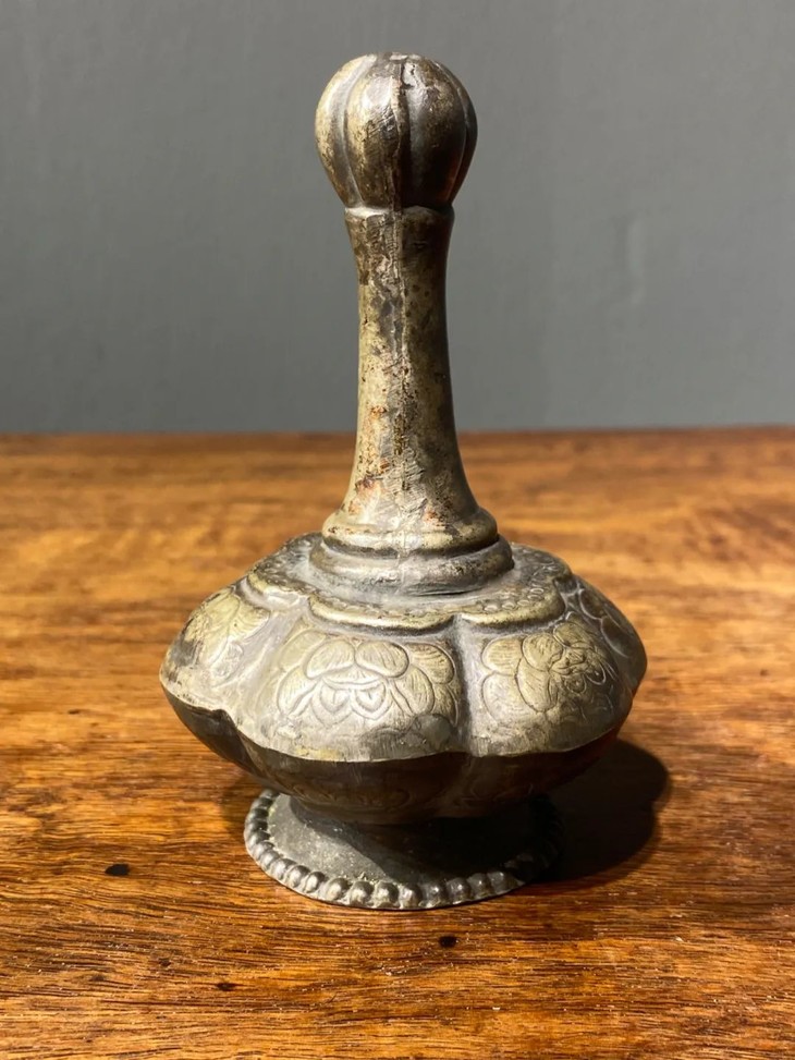 此青铜鎏银錾花瓜棱直颈净水瓶表面光滑细腻,小局部附着凸起的铜锈,整体器身包浆皮壳细腻温润,贵气典雅,尽显佛教器物“少即是多”的审美情趣。