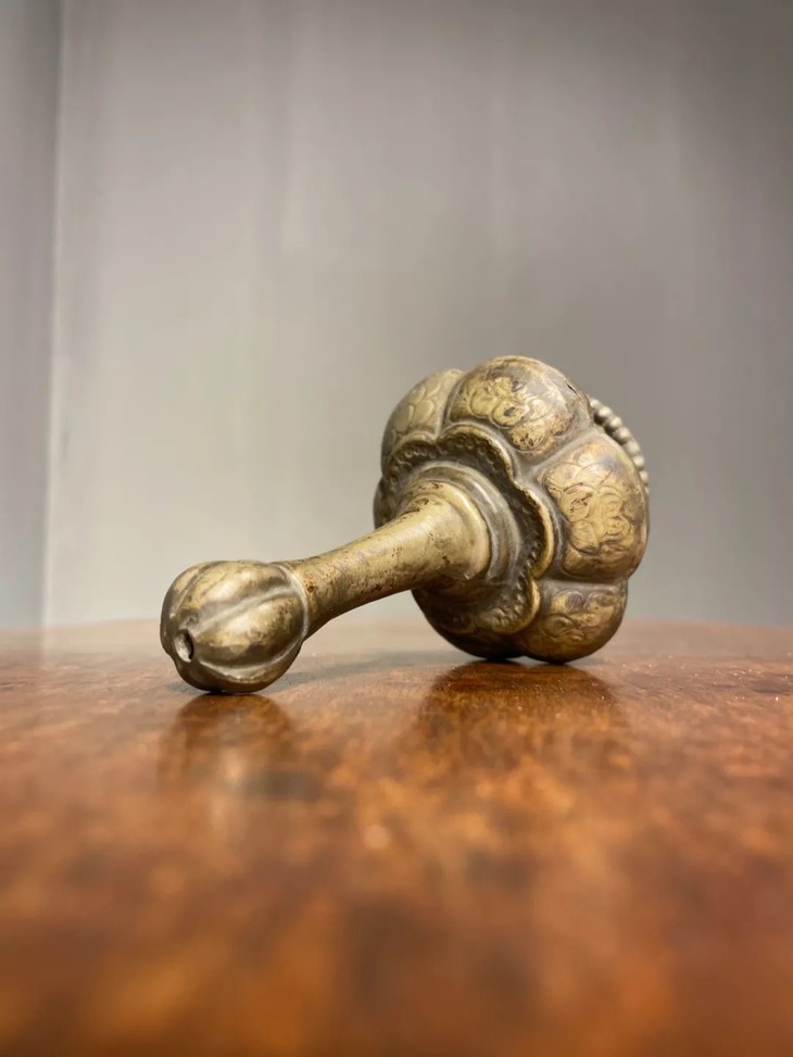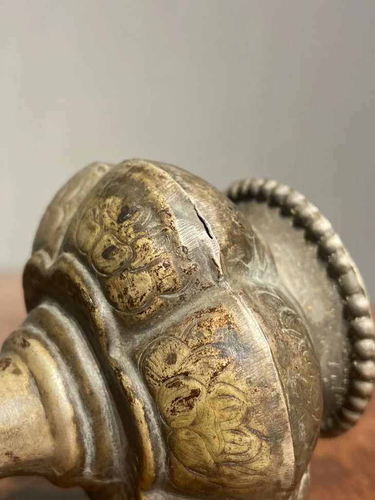 这是一只造型精緻制作严谨细腻的青铜鎏银錾花供佛净水瓶,材质佳坚硬的精炼铜精心捶打成薄壁瓜棱长颈蒜头瓶造型,并且以精緻的錾刻宝相花装饰瓶身,全器以鎏银覆盖表面,制作成优雅的佛前净水瓶,此瓶器型挺拔精緻,纹饰细腻颇有唐宋之风格,整体风格简洁、线条流畅,表面修饰打磨工艺精湛、无可挑剔,精良铜质鎏银斑金黄交错,虽曾经入土,仍然保持平滑完整,器身表面因曾长期浸泡于水中而产生所谓的“青铜水坑皮壳“,呈现斑驳却明亮光滑的青黄色泽,是典型唐宋时期佛教用具常见的“响铜“合金,造型肃穆大方,是佛门圣器,为五代/北宋僧侣贮水供佛之器。