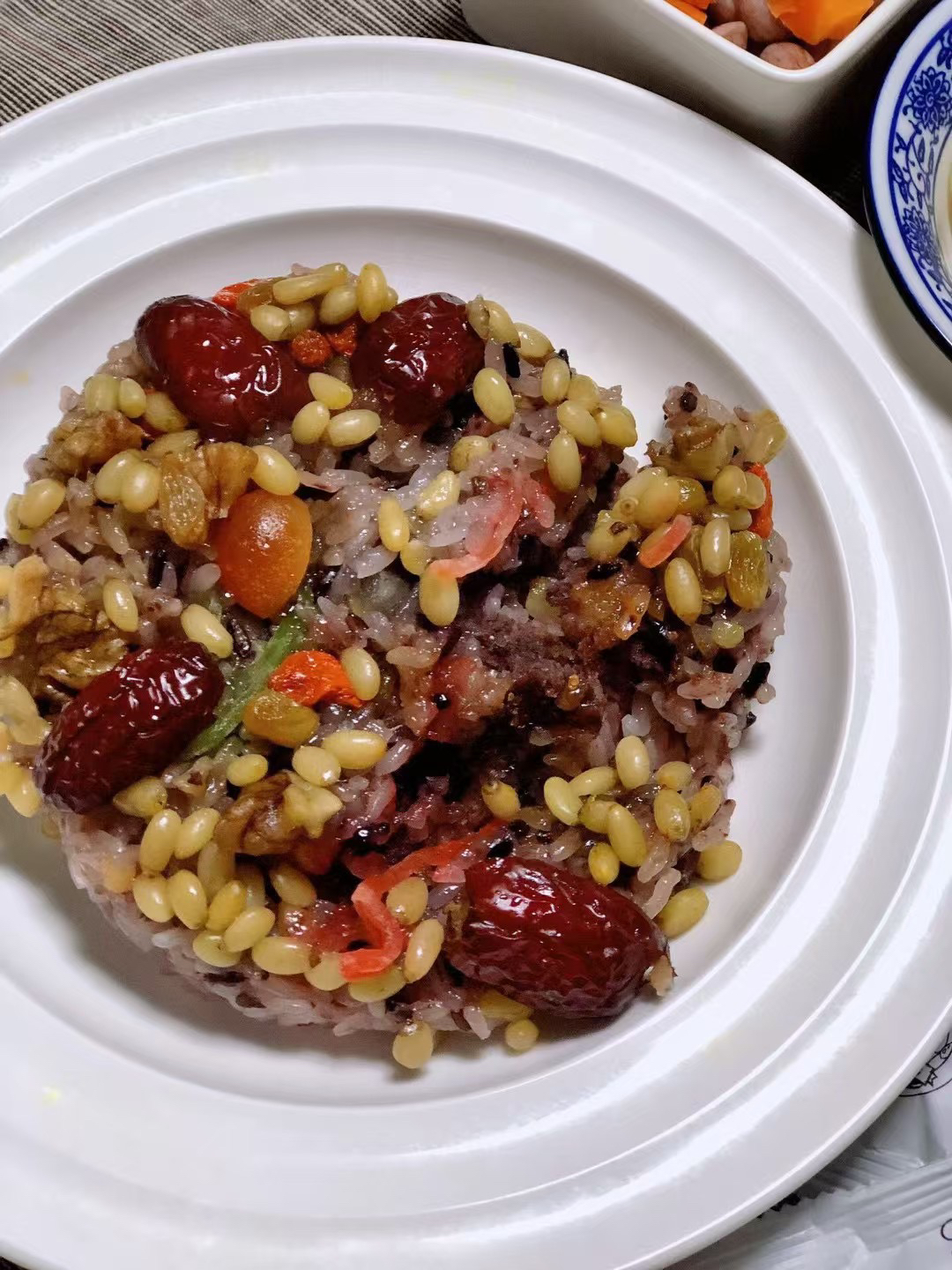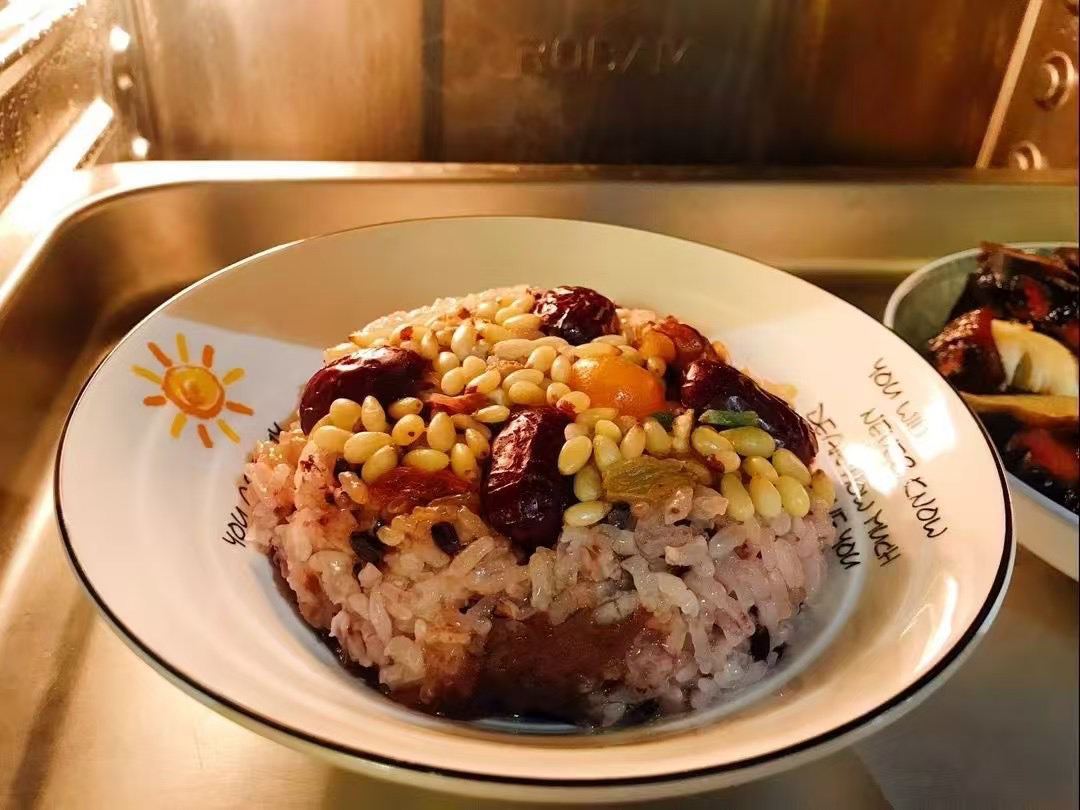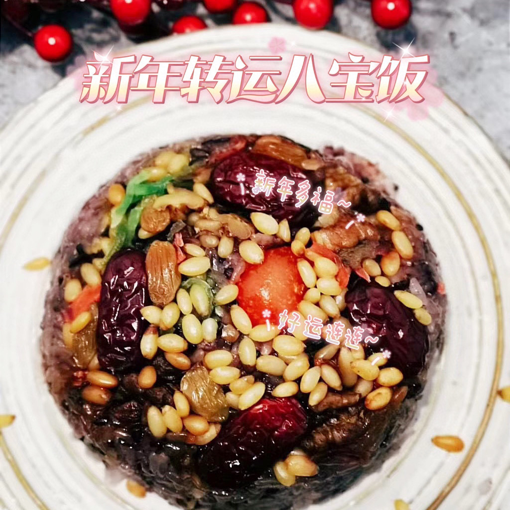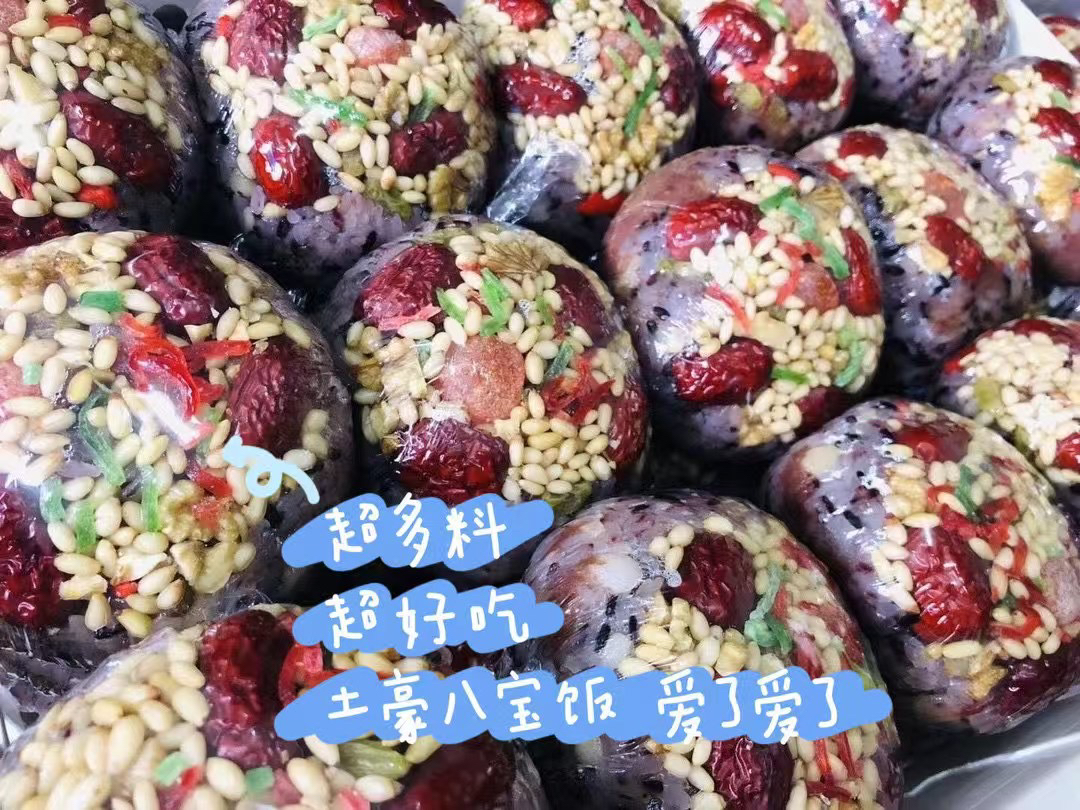 一口软糯一口香甜[坏笑],土豪八宝饭由紫米和东北糯米制作,馅料是手工炒制的红豆沙,加入松仁、核桃等坚果,和红枣、果干,口感更丰富!