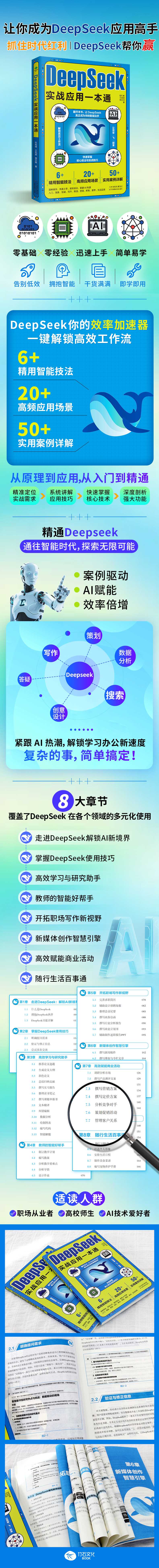 读者翻开本书潜心研读,可从多角度领略DeepSeek的强大功能,洞悉其广泛的应用场景,熟练掌握各类功能的使用技巧。这些收获能帮助读者在实际工作中灵活运用DeepSeek,显著提升工作效率,优化创作质量。我们由衷期望,DeepSeek不只是读者工作中的得力伙伴,更能融入读者的日常生活,为读者带来便捷与乐趣。让我们携手同行,深度挖掘DeepSeek蕴藏的无限潜能,共同开启智能领域的全新征程!
