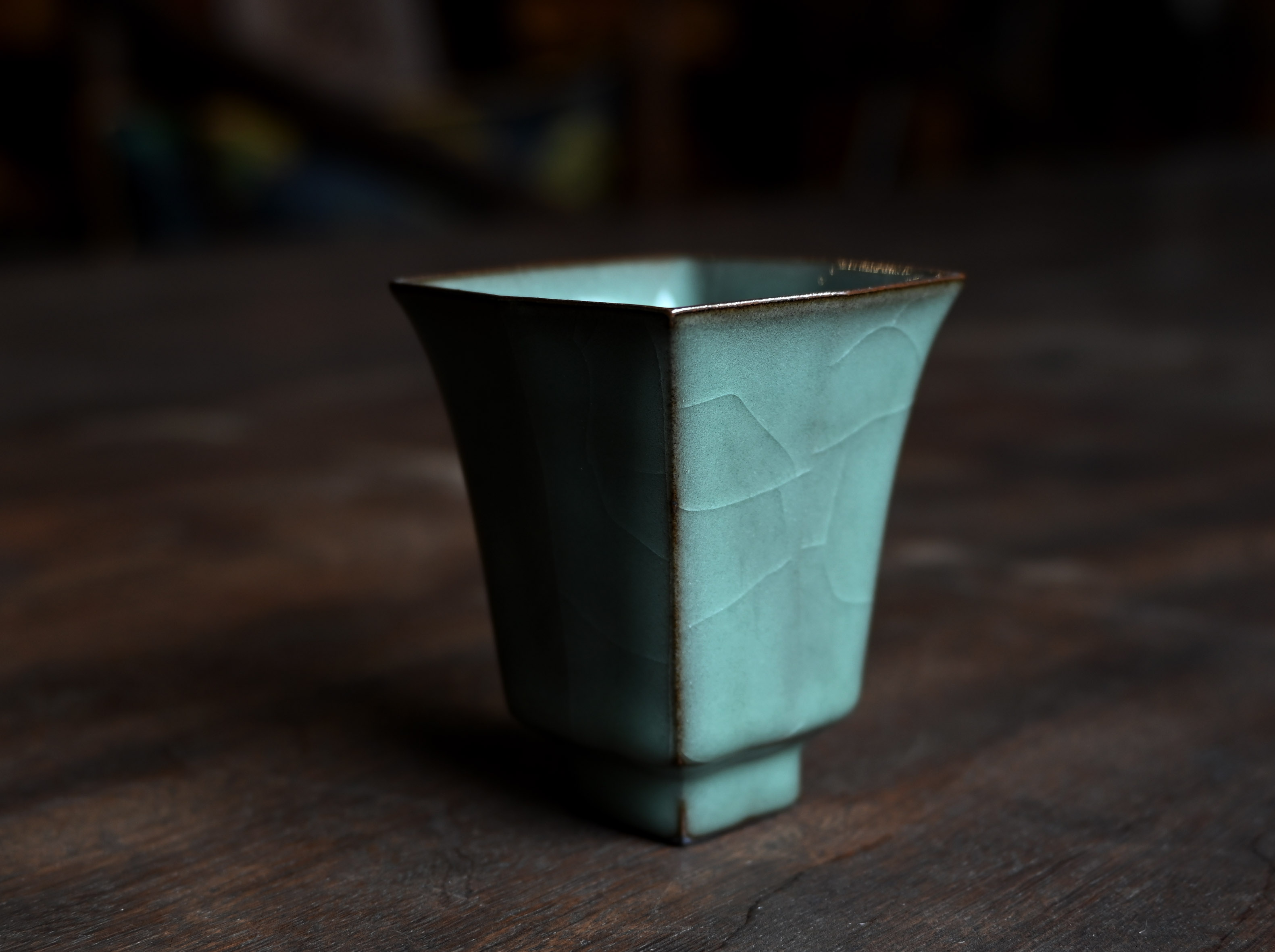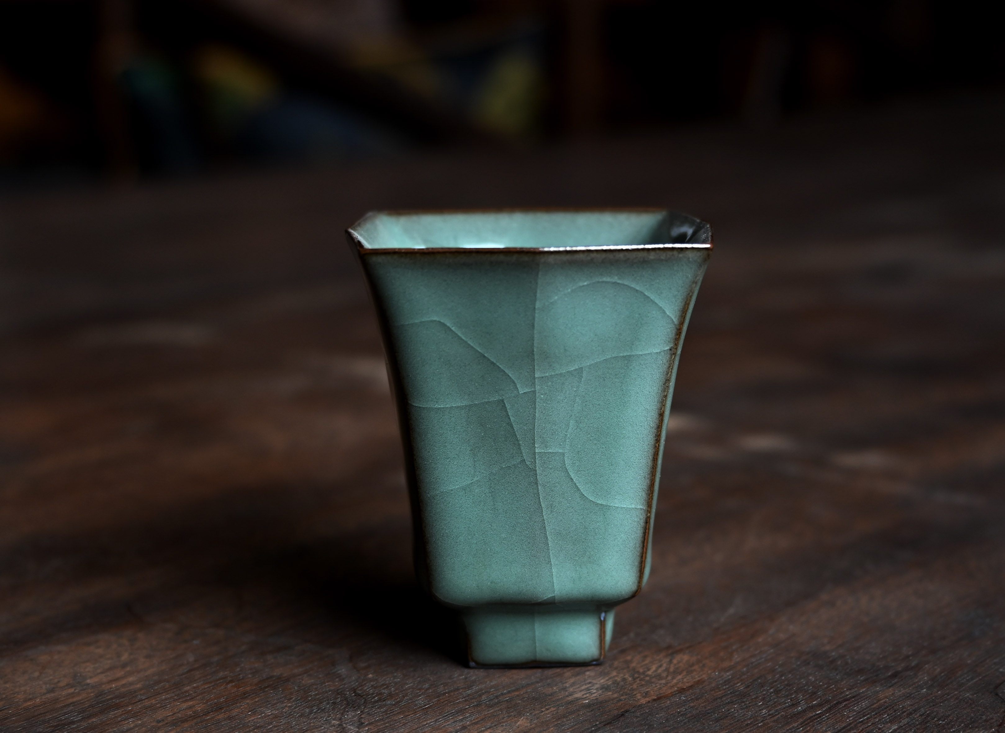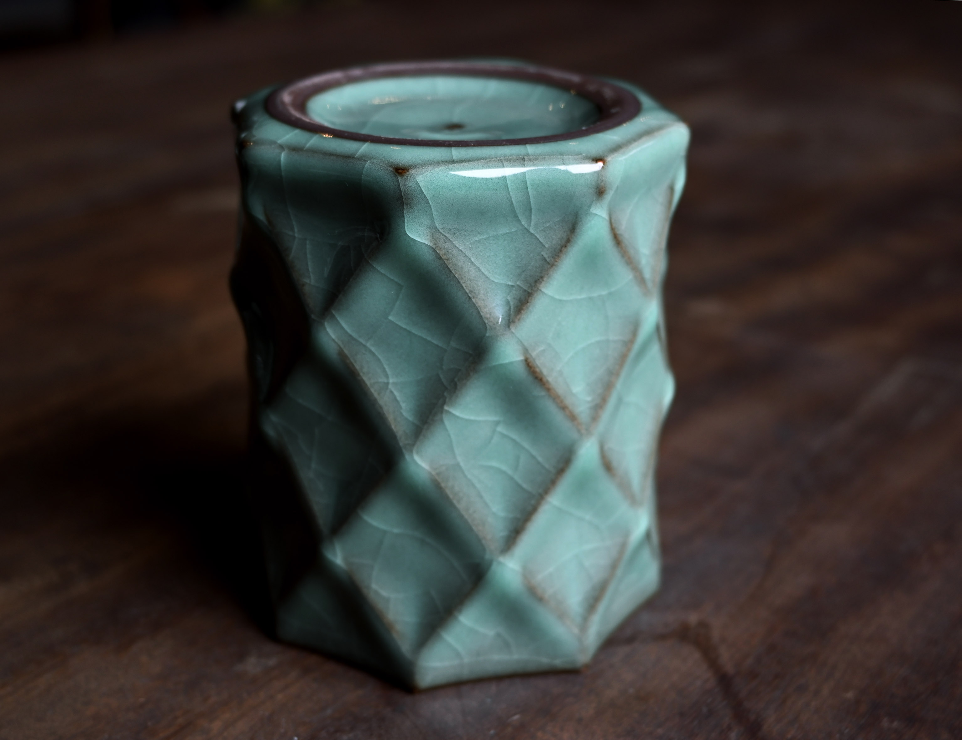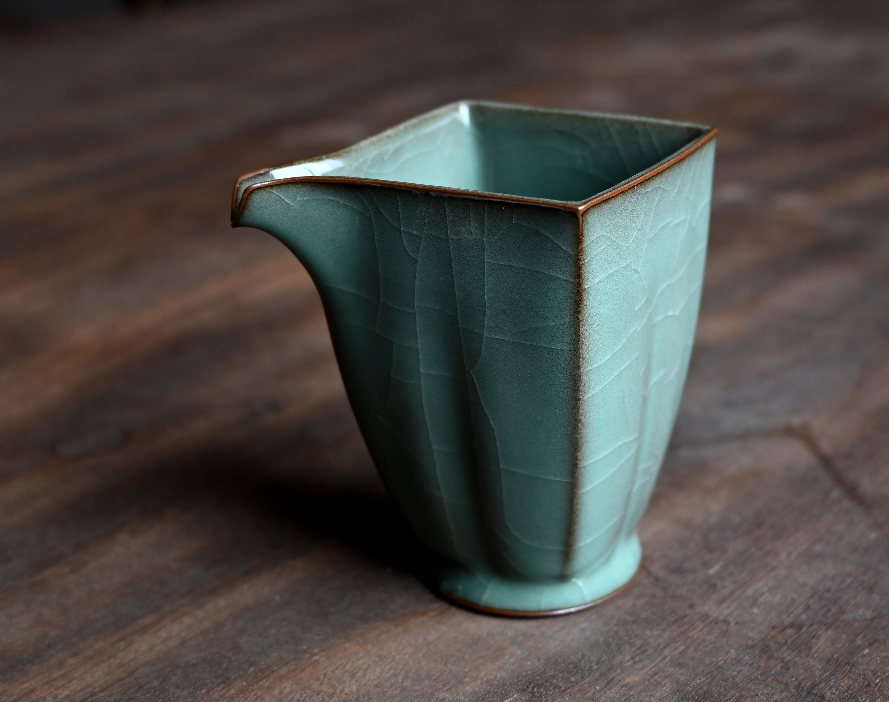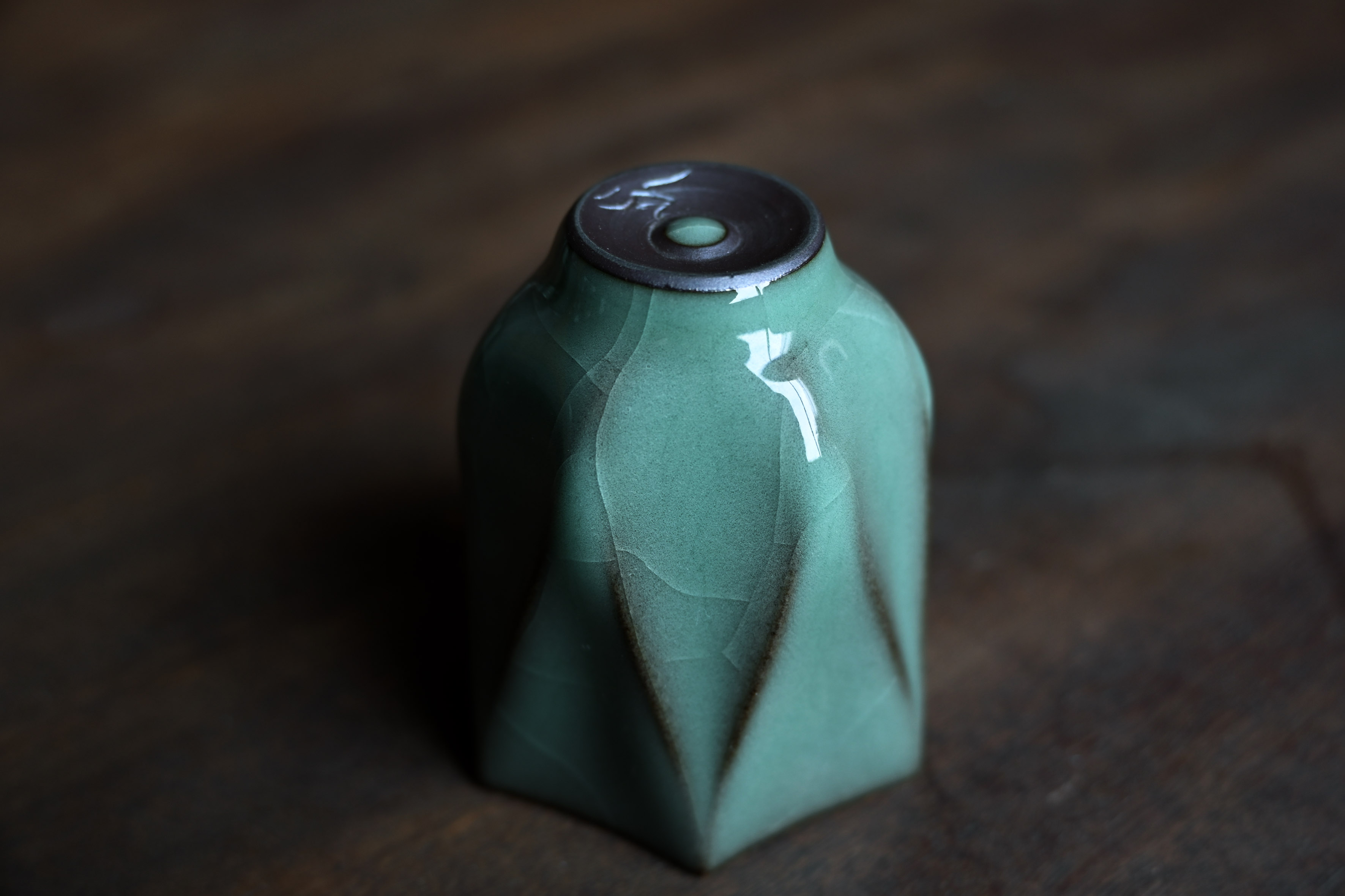 汤忠仁龙泉黑胎青瓷,方形造型特别,与众不同,不落俗套,让人耳目一新。