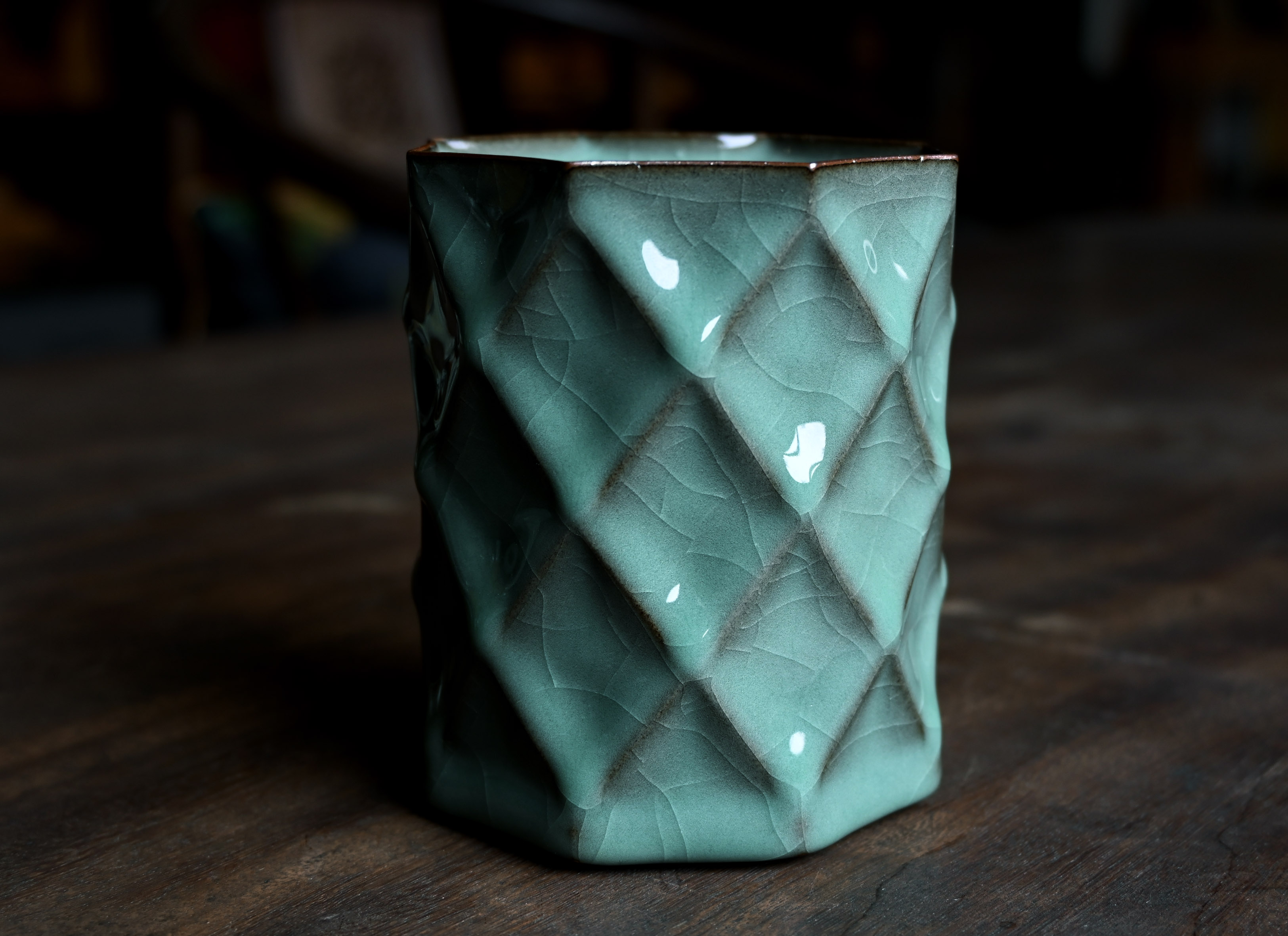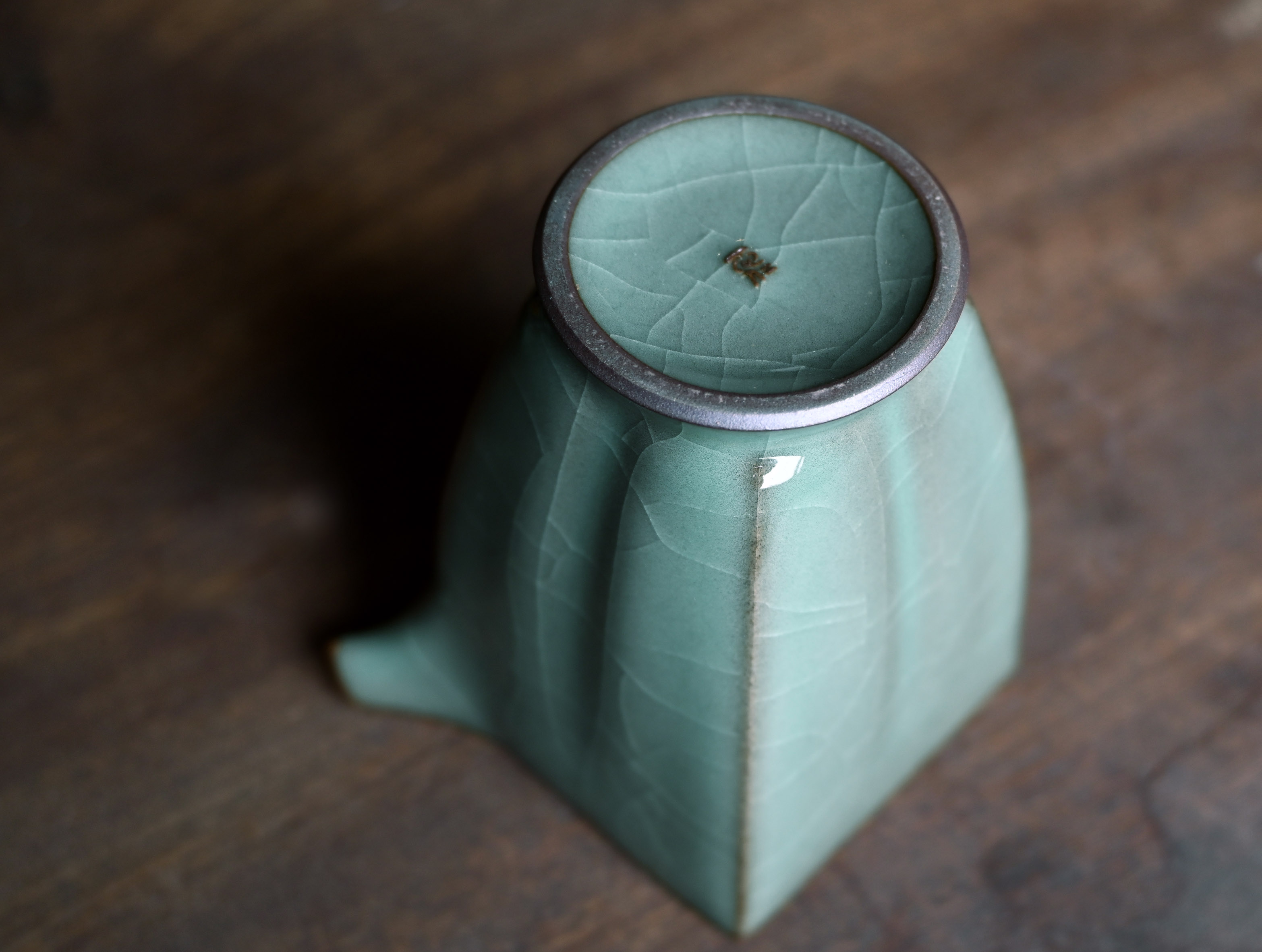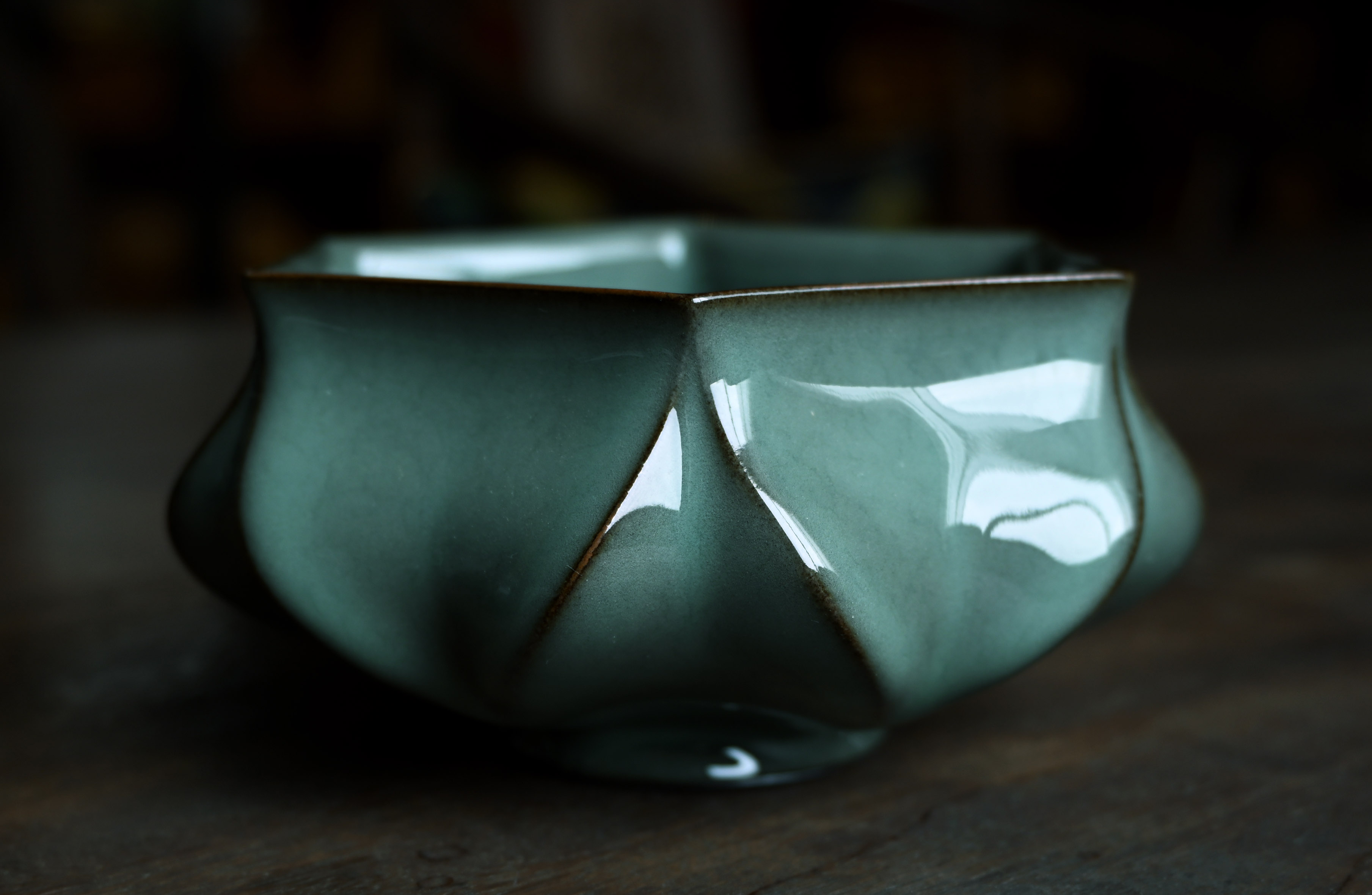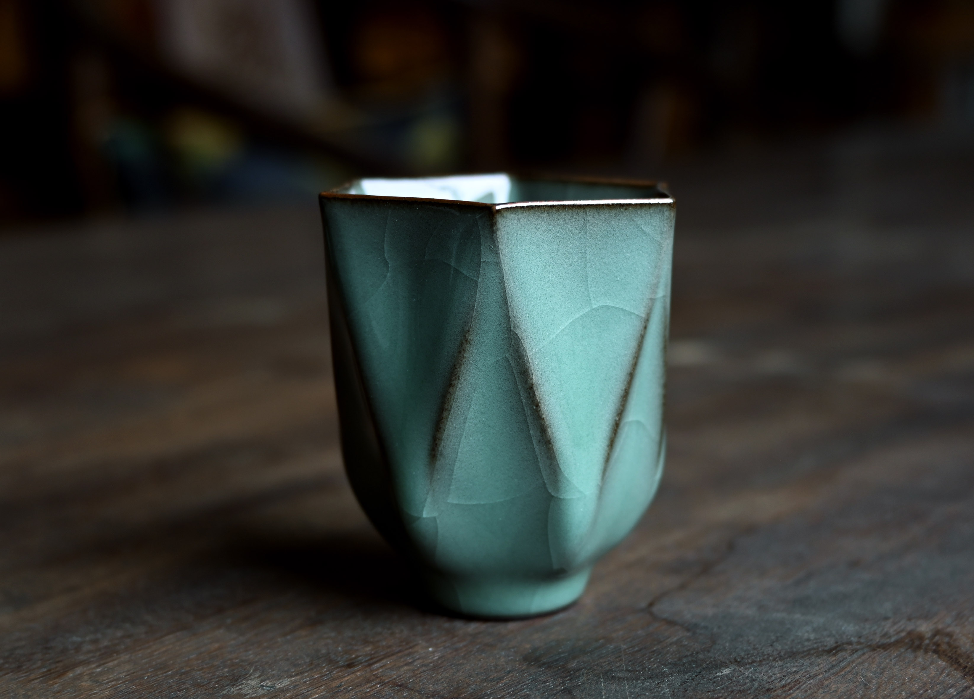 汤忠仁龙泉黑胎青瓷,方形造型特别,与众不同,不落俗套,让人耳目一新。