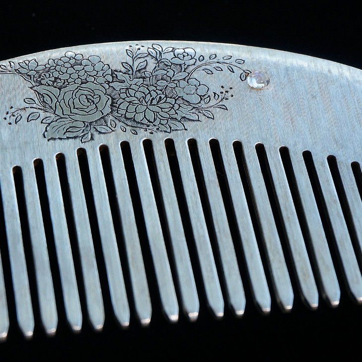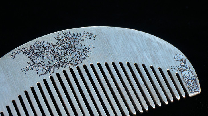 正面背面都用源于欧洲传统的雕金工艺进行手工雕刻。并镶嵌一颗月光石。整把梳子手工雕刻了织纹,在阳光下随光而变幻光泽,十分美丽。雕金,Engraving,是欧洲的一种手工的金属雕刻工艺,利用各式各样的刻刀在金属上雕刻出装饰花纹。欧洲中世纪,金工工匠们开始将雕金运用在金属制品上。在一百年前的意大利,Mario Buccellatti创新了一种雕刻方法——织纹雕金,即在金属上雕刻出织物般的花纹,并与镂空蕾丝的Tulle工艺相互结合。使其呈现出蕾丝面料的效果。