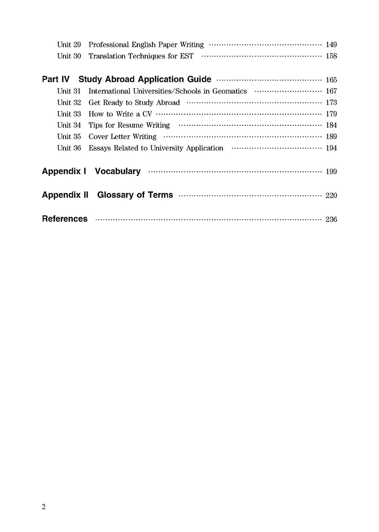 本书是一本帮助测绘人员快速提高专业英语能力的实用教材。全书共分为四个模块,分别是第一部分测绘基础知识,主要介绍基础知识的全部内容,还新增了隧道测量及施工方法的单元;第二部分测绘新技术,主要介绍全球导航卫星系统、地理信息系统、摄影测量、遥感和无人机测图技术的基础知识,第三部分国际学术交流,主要涉及国际学术交流的基本知识点:如国际测绘组织、著名测绘期刊和论文写作及翻译技巧;第四部分介绍留学申请指南、履历/简历写作、求职信及与相关作文写作的方法、技巧及参考范文。