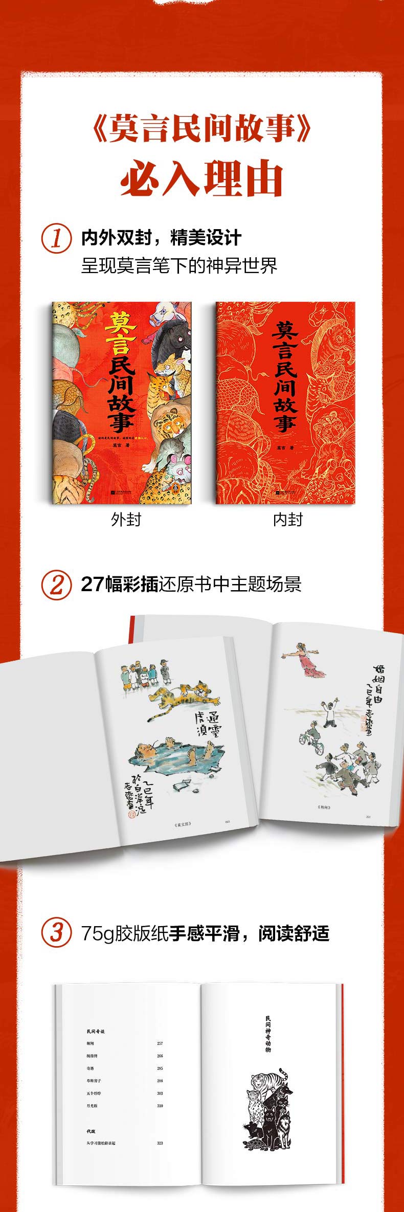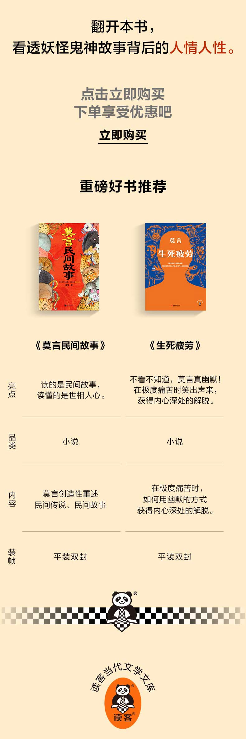 ◆ 读的是民间故事,读懂的是世相人心。◆ 莫言亲自编选的18篇故事,创造性讲述中国本土民间传说、爷爷奶奶口中神神鬼鬼的故事。◆ 著名作家阿城:莫言写鬼怪,当代中国一绝。在他的家乡高密,鬼怪就是当地的世俗构成。我听莫言讲鬼怪,格调情怀是唐以前的,语言却是现在的,心里喜欢,明白他是大才。◆ 诺贝尔文学奖授奖词:莫言的想象力翱翔于整个人类存在之上。◆ 诺奖级中式浪漫想象力,中国本土文化的智慧结晶。◆ 特别收录莫言手稿、莫言亲笔书法题词、莫言漫像。◆ 水墨漫画家亲绘27幅彩插还原书中主题场景。◆ 另附2篇千字创作谈,莫言深度阐释与蒲松龄、民间故事的亲缘关系。◆ 翻开本书,看透妖怪鬼神故事背后的人情人性。◆ 当代文学看读客,名家名作都在这。(读客当代文学文库)