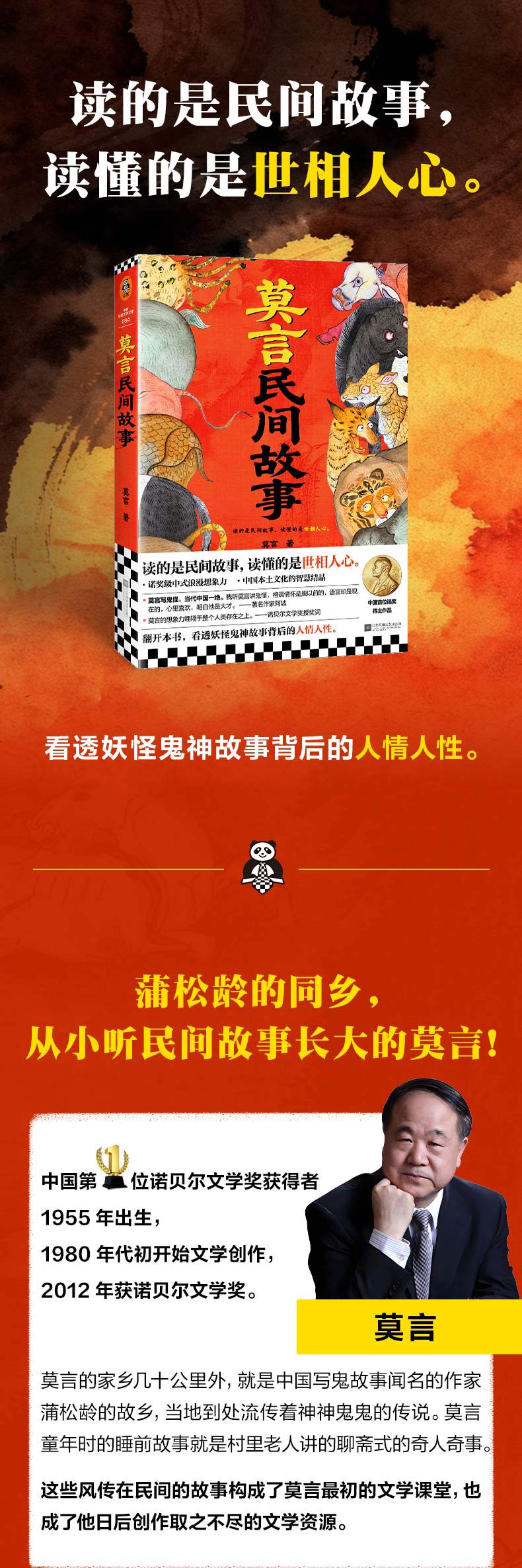 ◆ 莫言写鬼怪,当代中国一绝。在他的家乡高密,鬼怪就是当地的世俗构成。我听莫言讲鬼怪,格调情怀是唐以前的,语言却是现在的,心里喜欢,明白他是大才。著名作家阿城◆ 莫言的想象力丰富,又扎根于中国传统的说书艺术,这是他超越马尔克斯和福克纳的地方。诺贝尔文学奖评委会前主席 埃斯普马克◆ 莫言的想象力翱翔于整个人类存在之上。诺贝尔文学奖授奖词