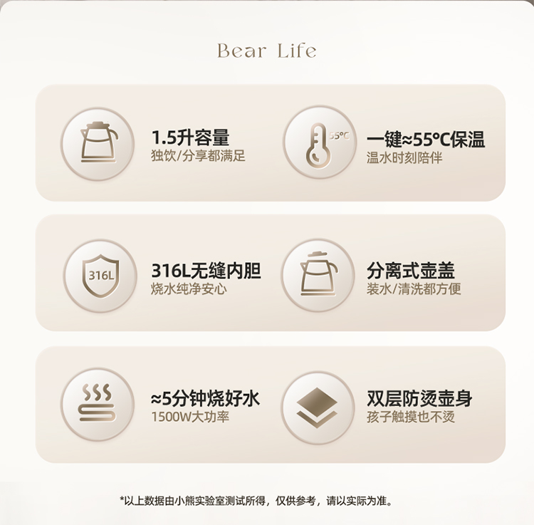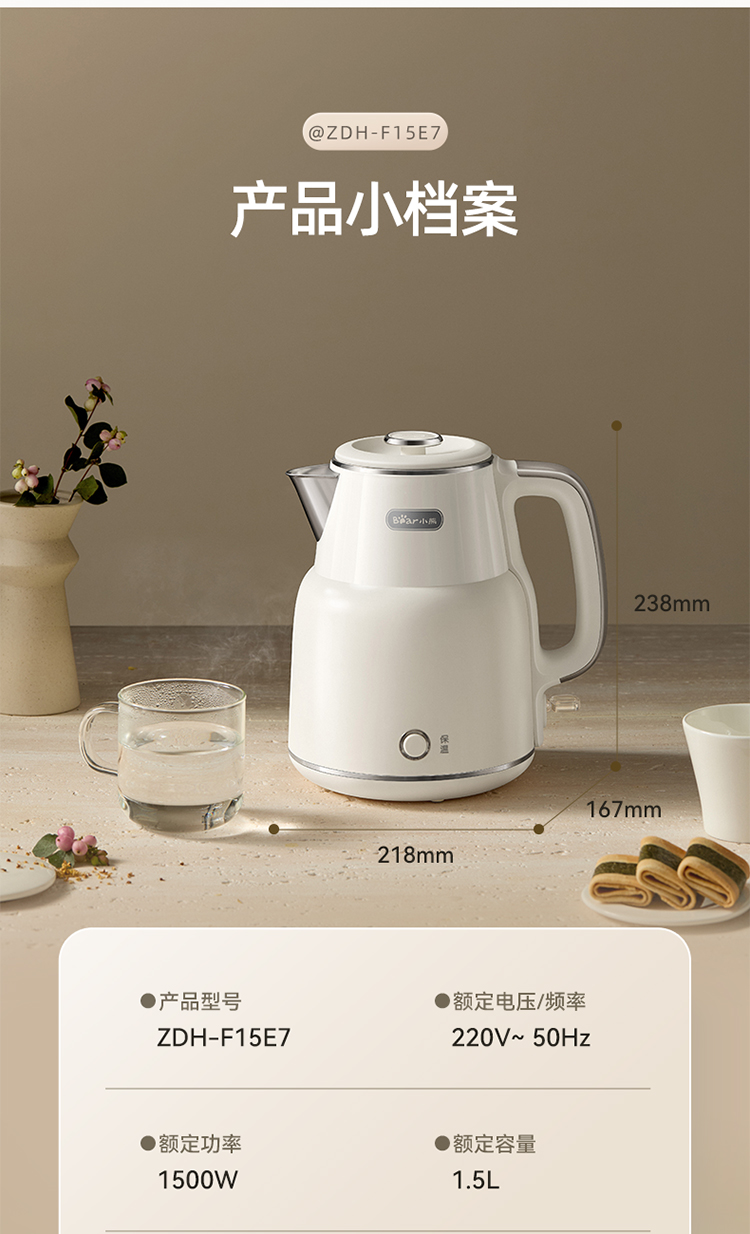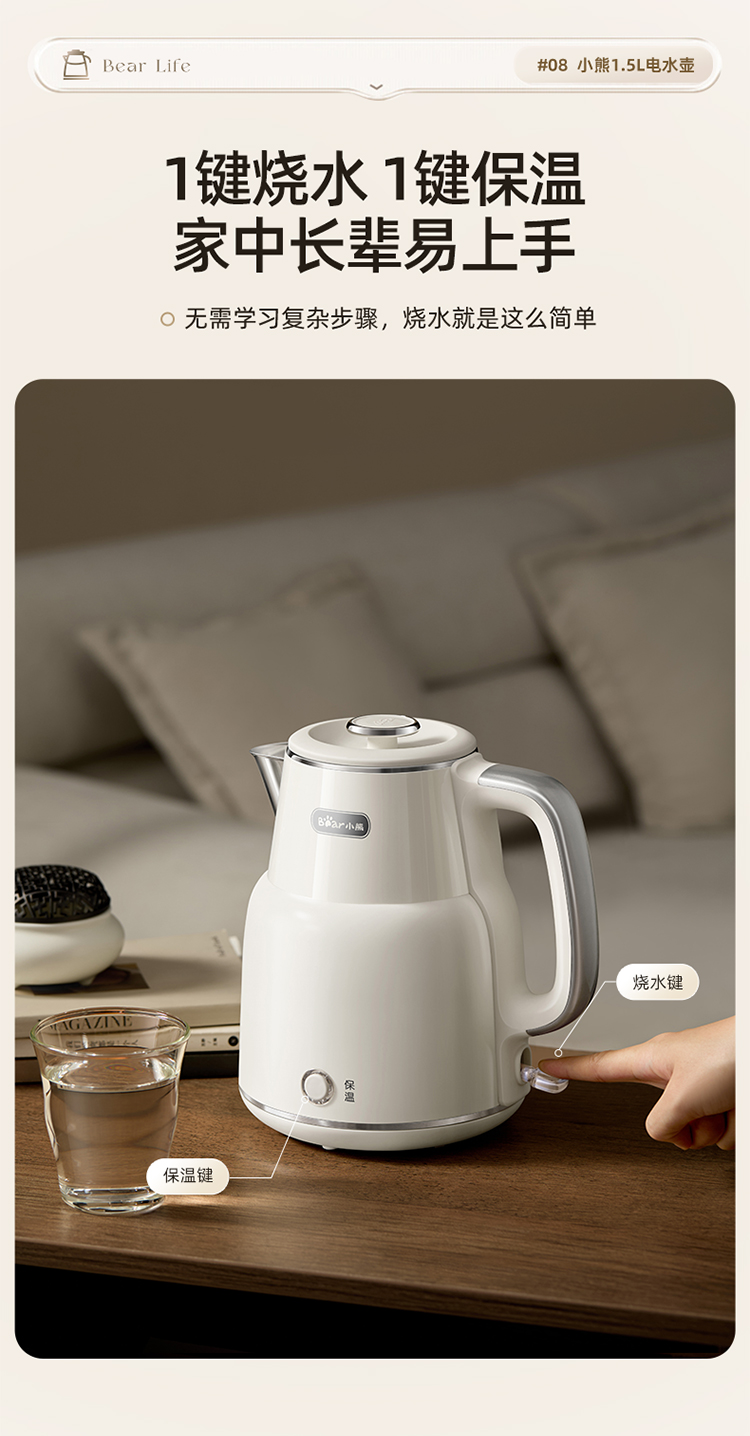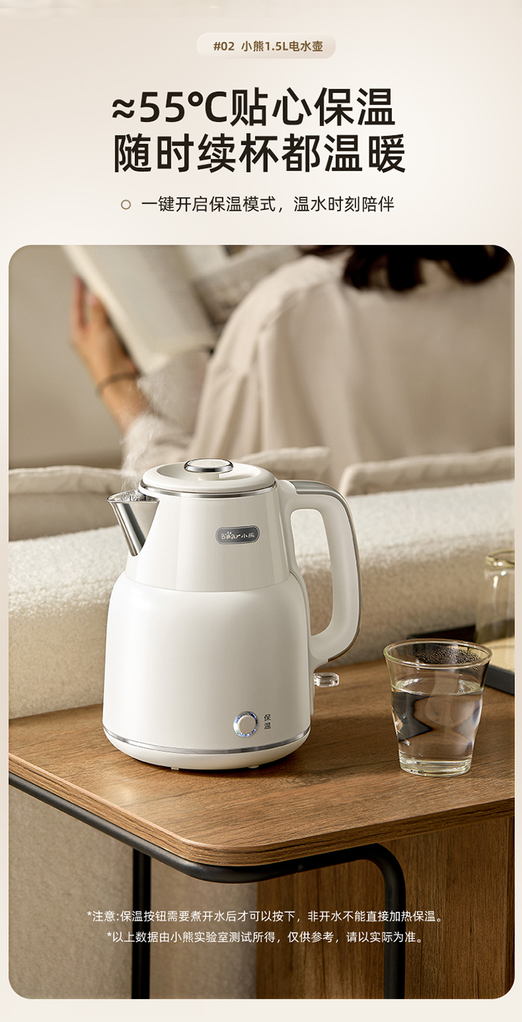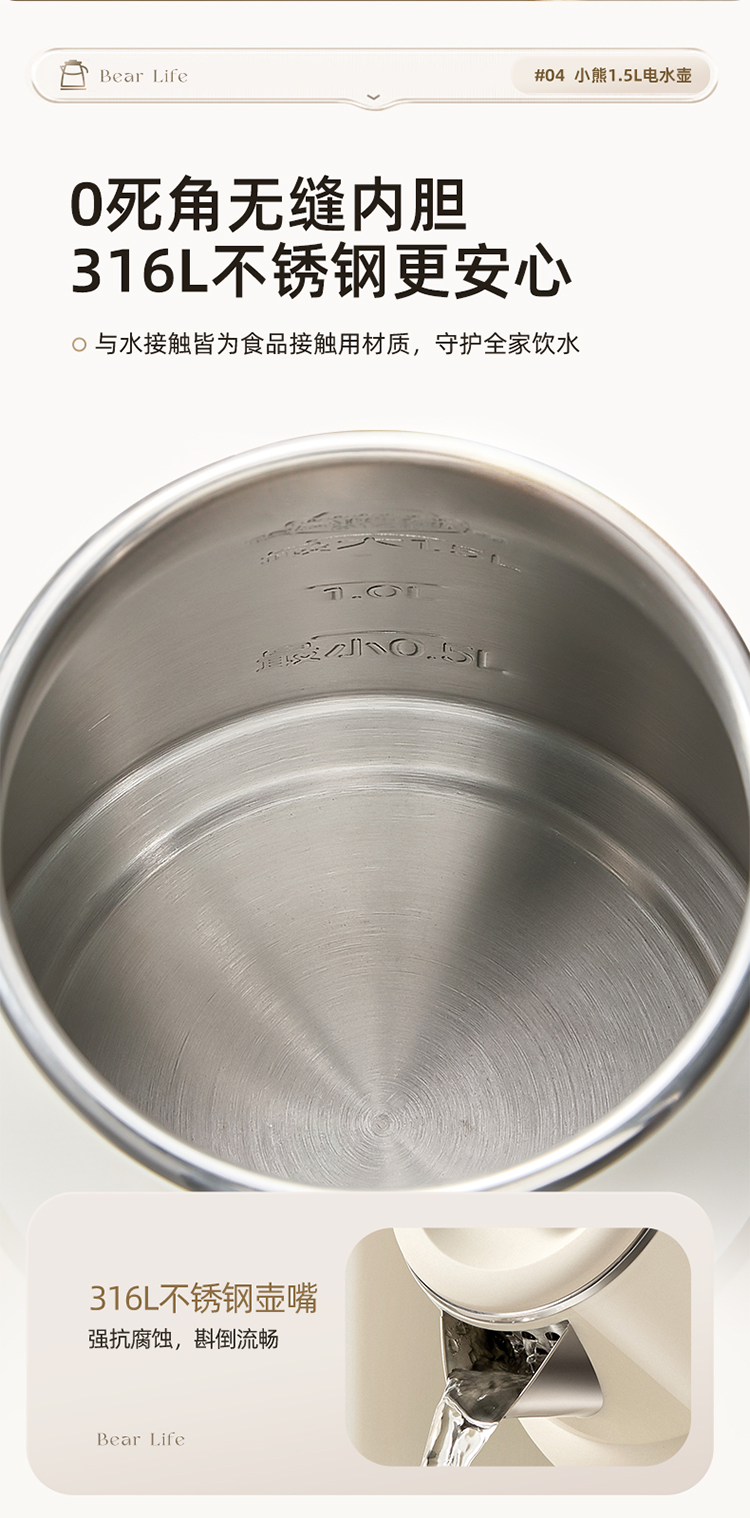 小熊(Bear)电热水壶恒温烧水壶316L不锈钢无缝一体内胆自动断电 1.5L大容量家用保温壶 ZDH-F15E7