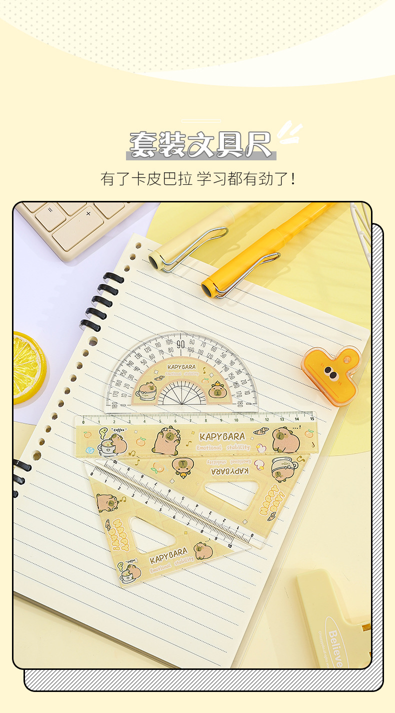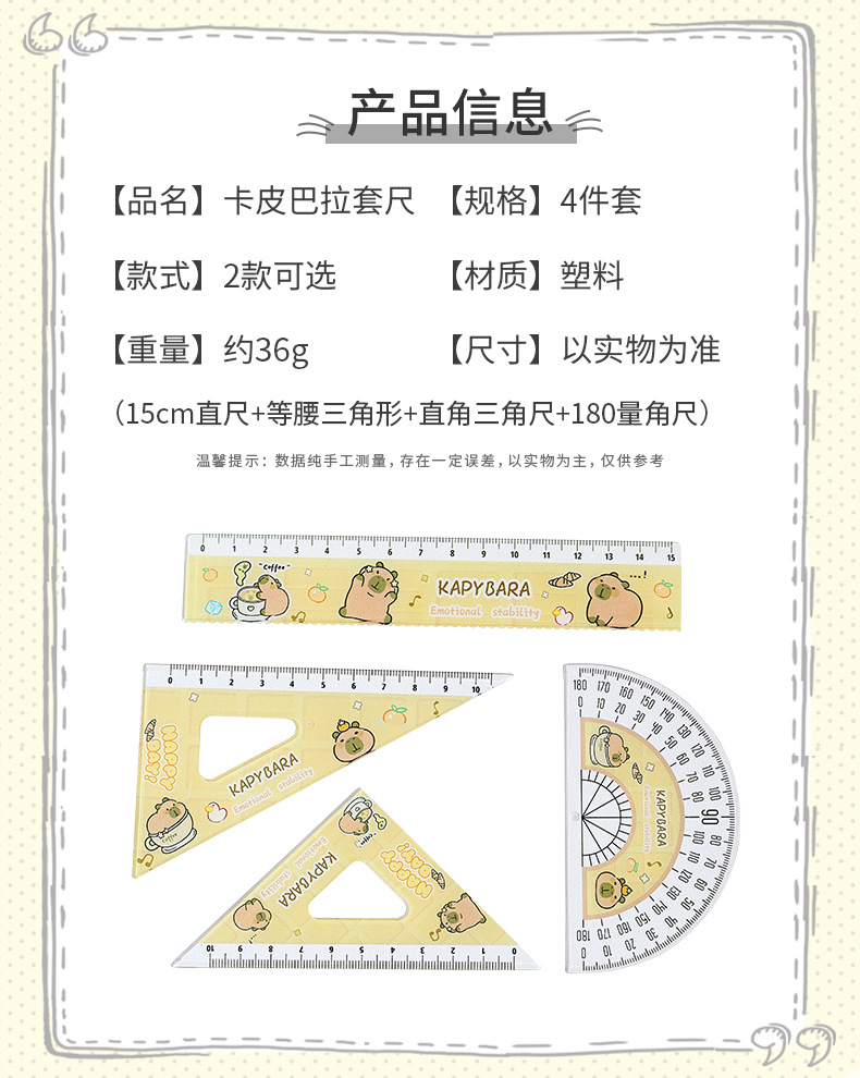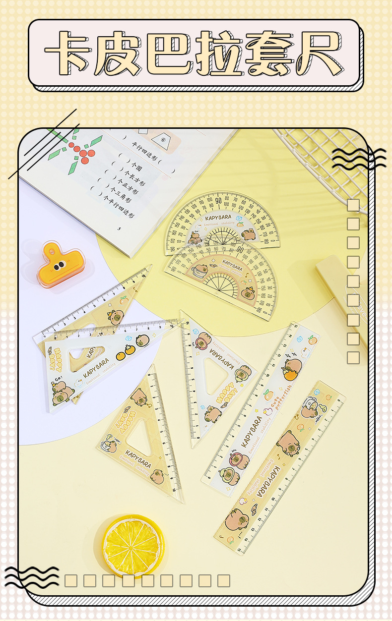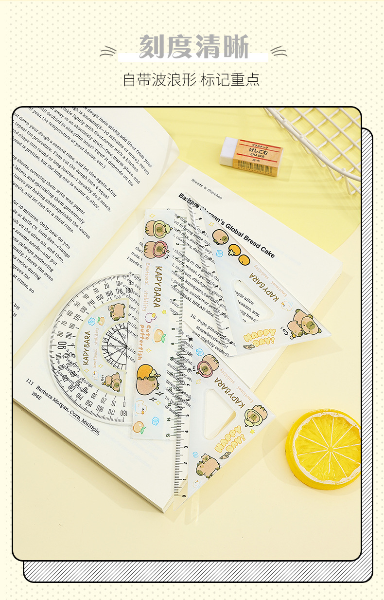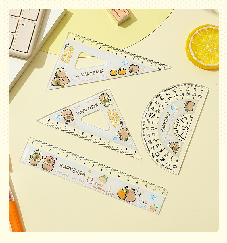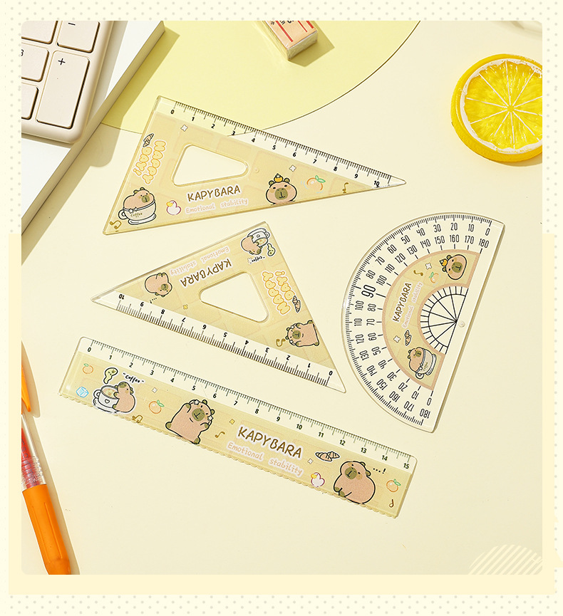 【13.9抢2套❗卡皮巴拉尺子套装】自带波浪形,标记重点,尺身光滑舒适,无毛刺不伤手,可爱水豚套尺四件套文具学生用高颜值15cm刻度尺QQ