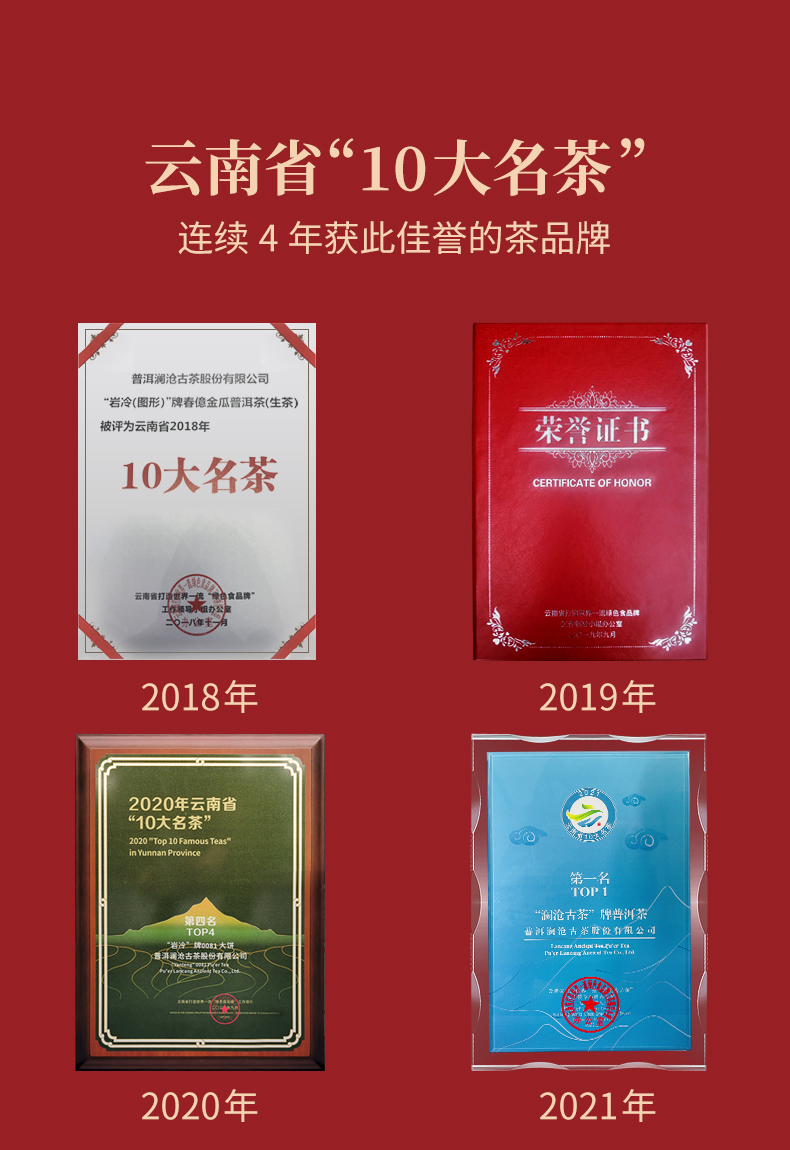 - 澜沧古茶,荣获“中国茶业百强业”,“农业产业化国家重点龙头企业”、“云南省普洱茶十大影响力企业”、“云南省食品安全示范单位”;拥“中国普洱茶十大品牌”、“云南老字号”等荣誉称号。