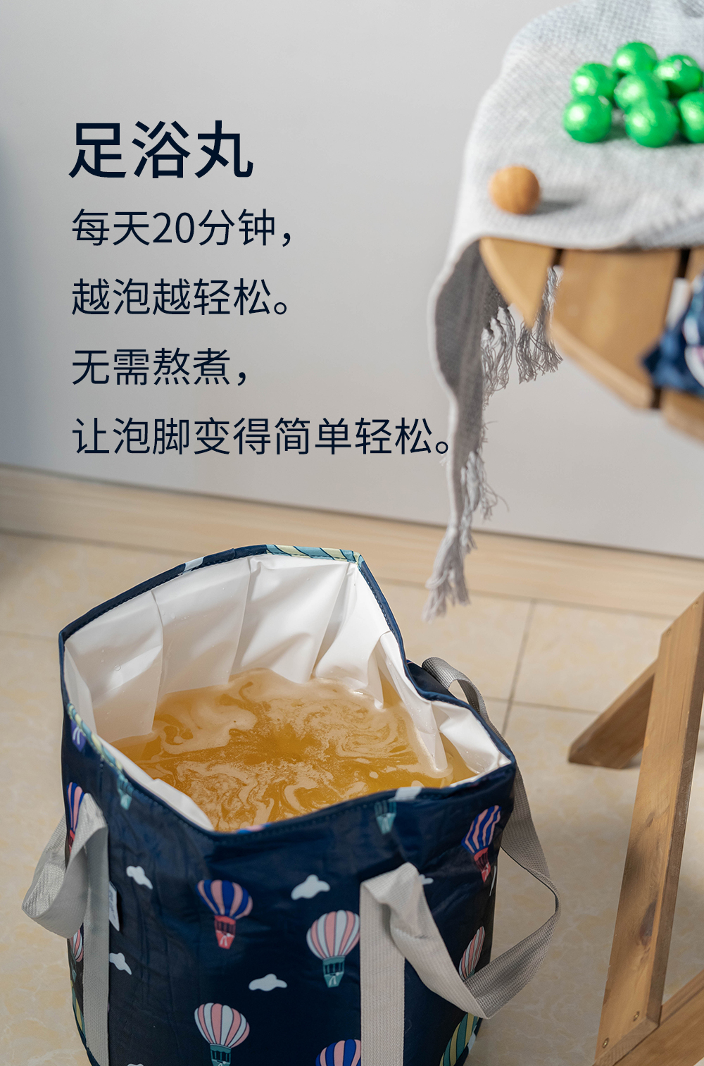 1、将泡脚丸用适量开水溶解,然后加温水调至合适的温度(42°左右),