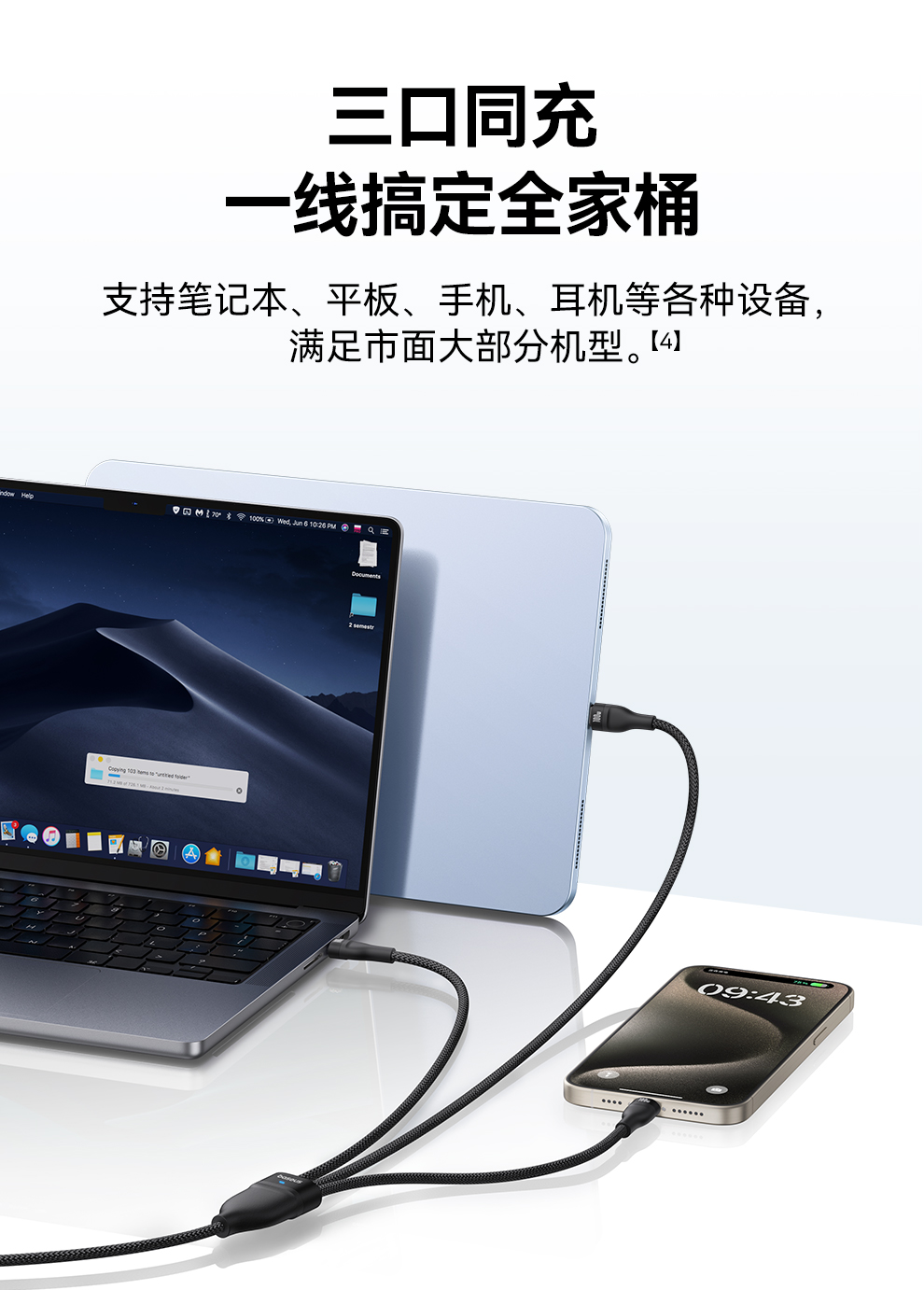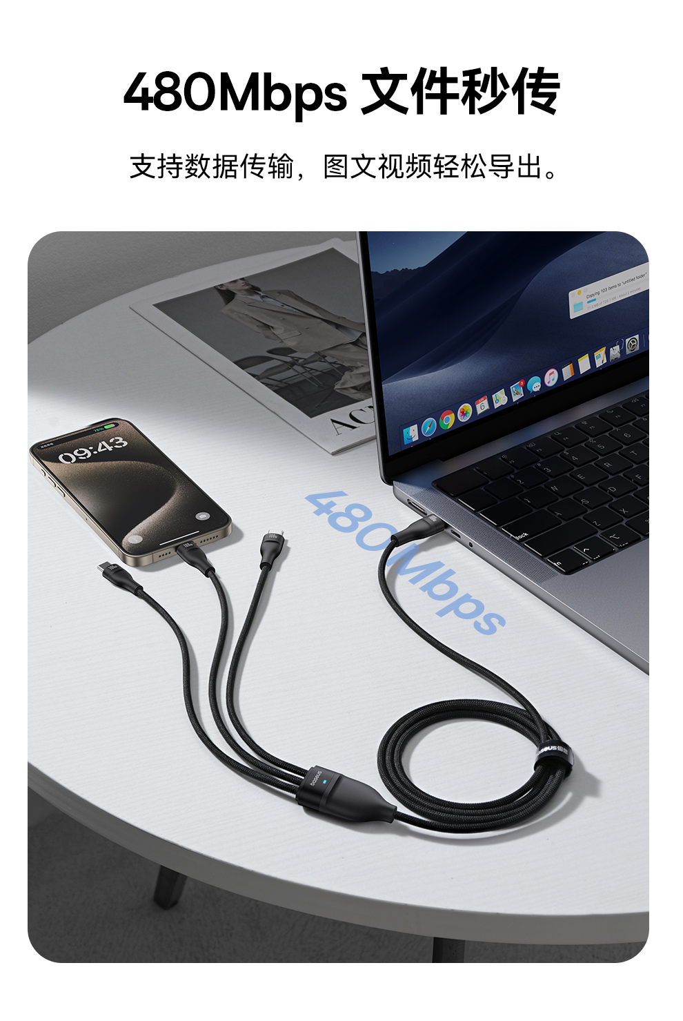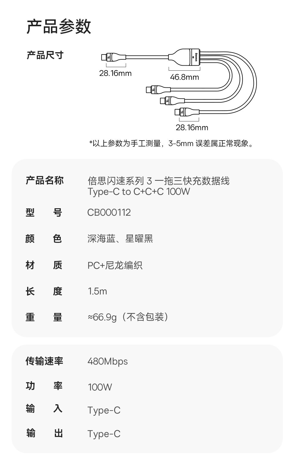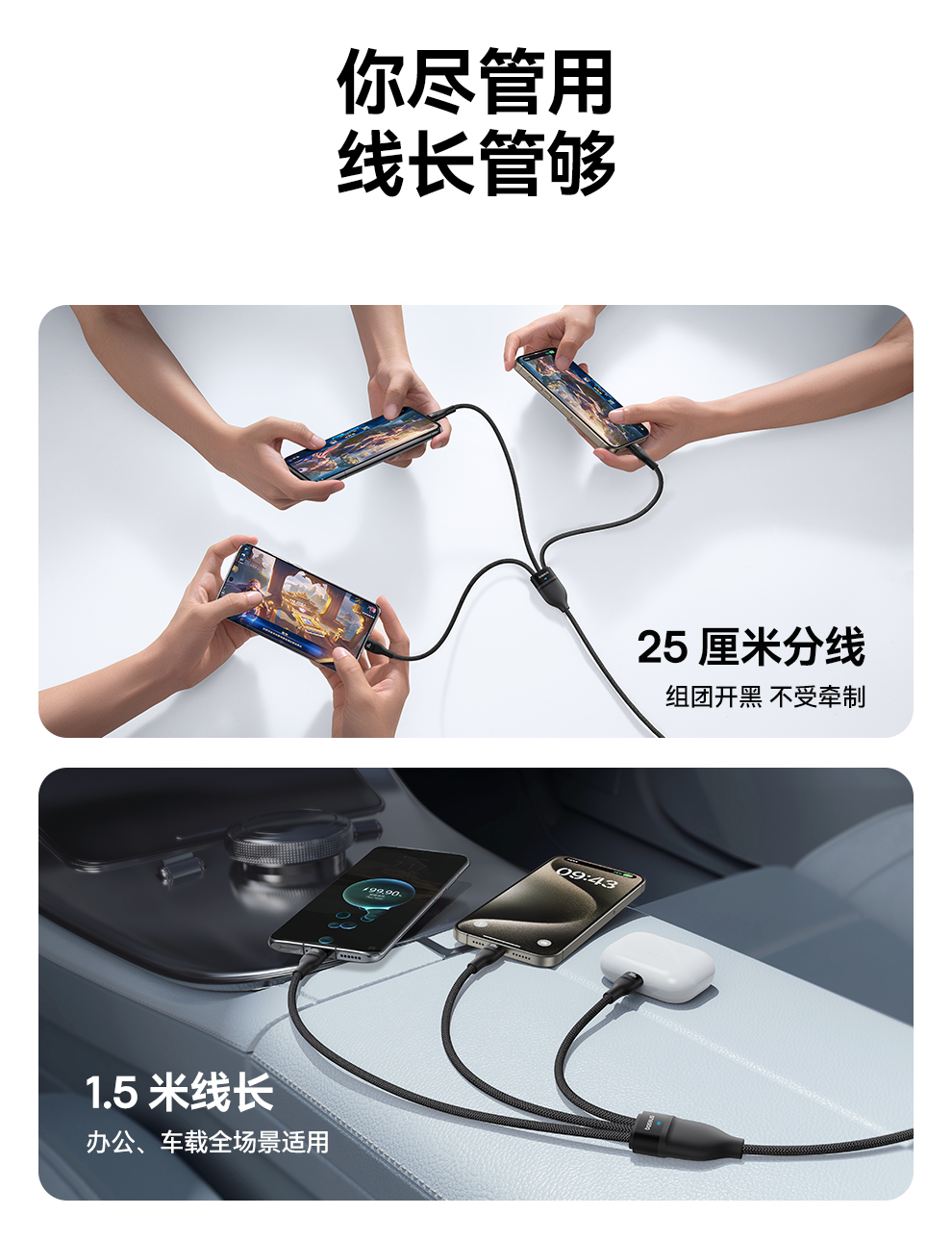 倍思 闪速系列 3 一拖三快充数据线100W 1.5m