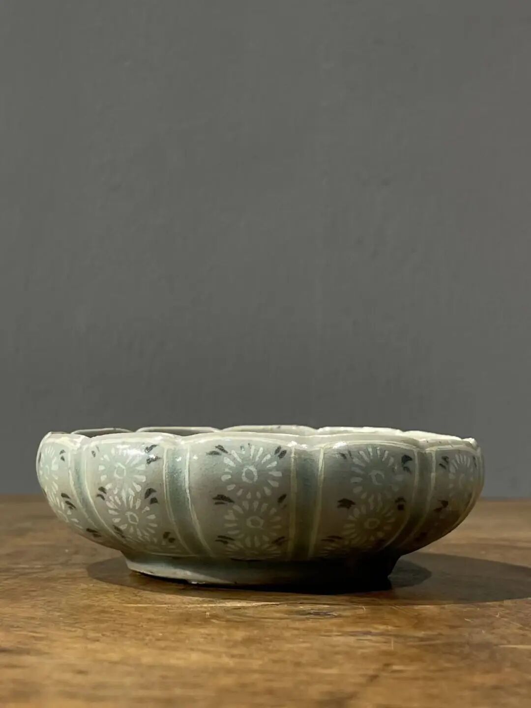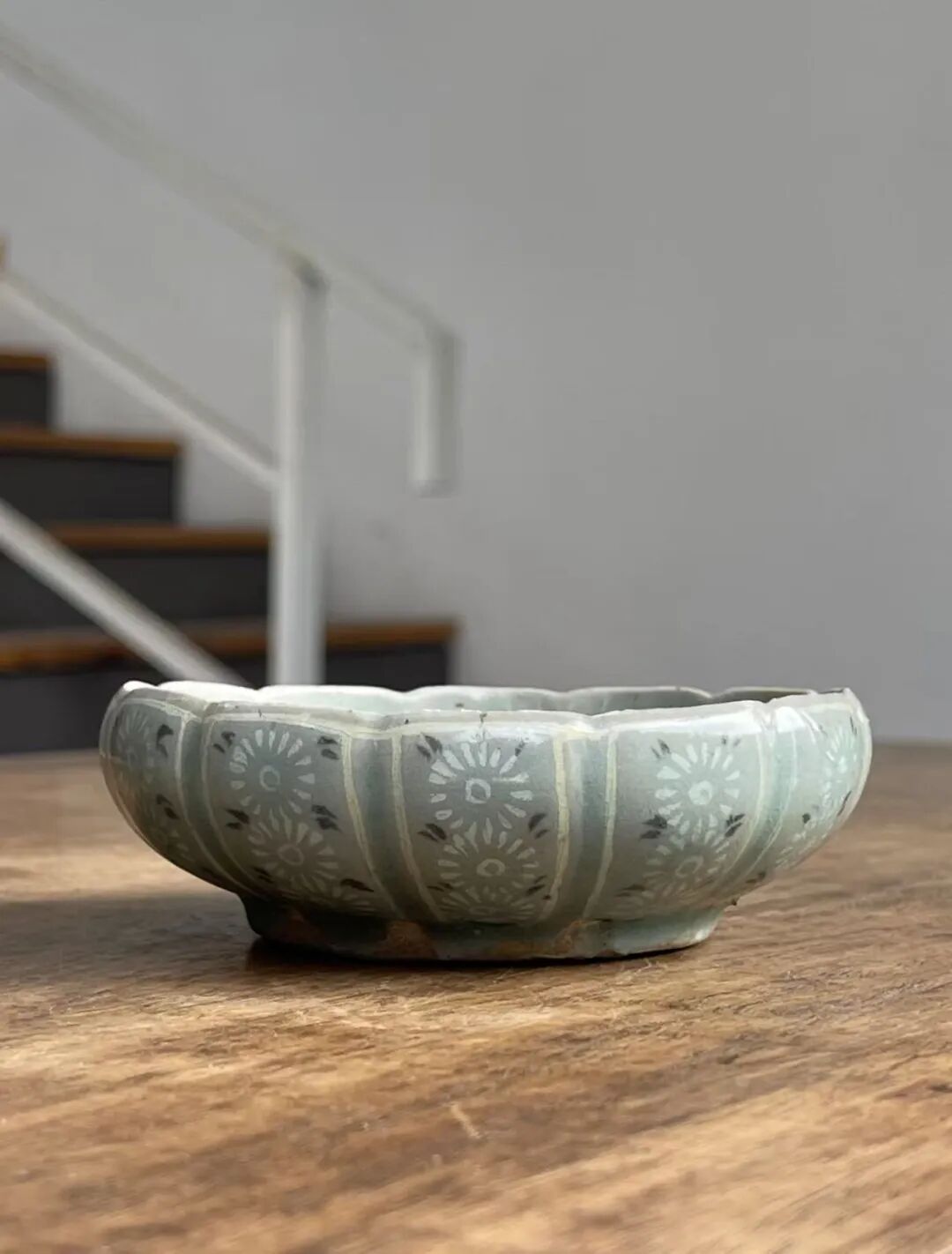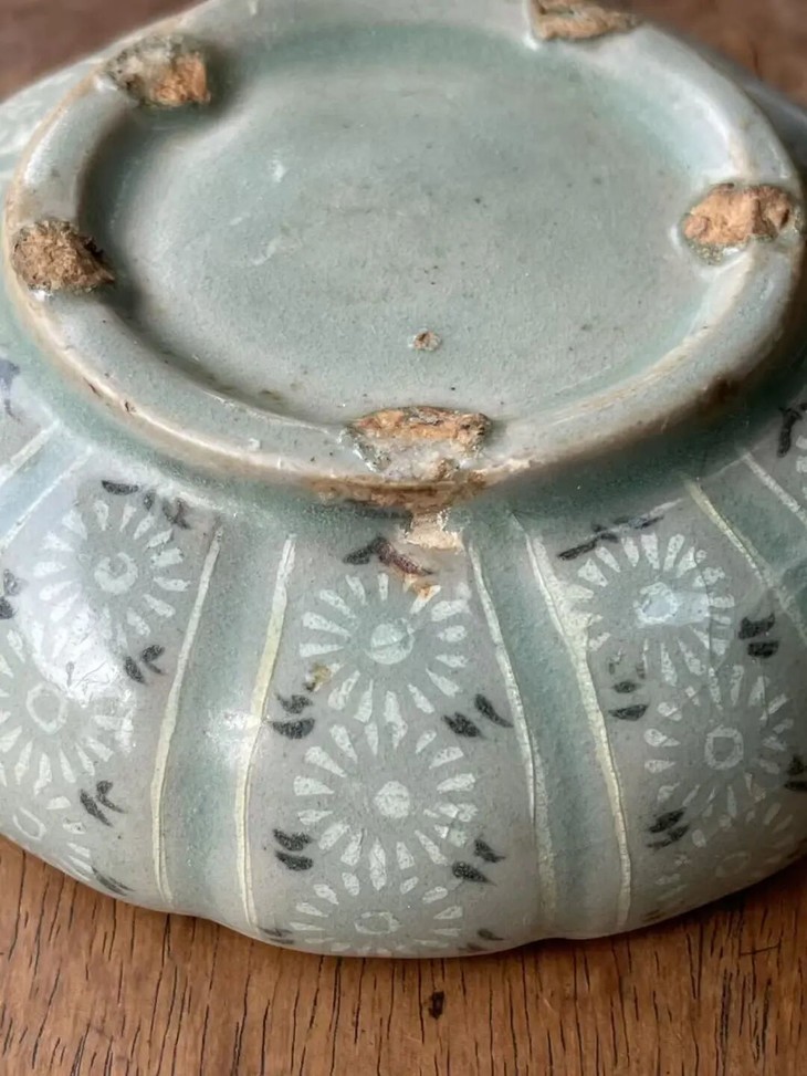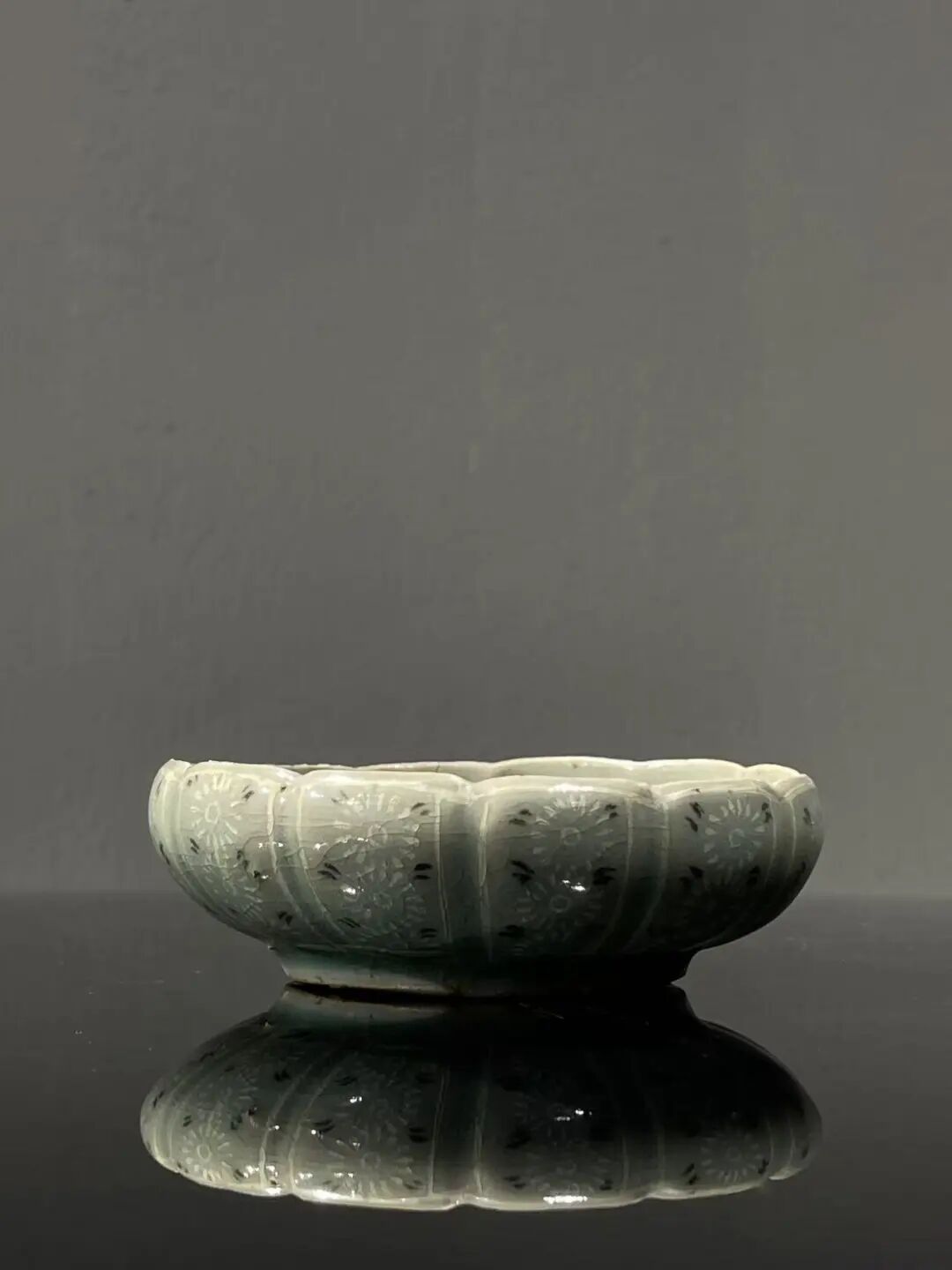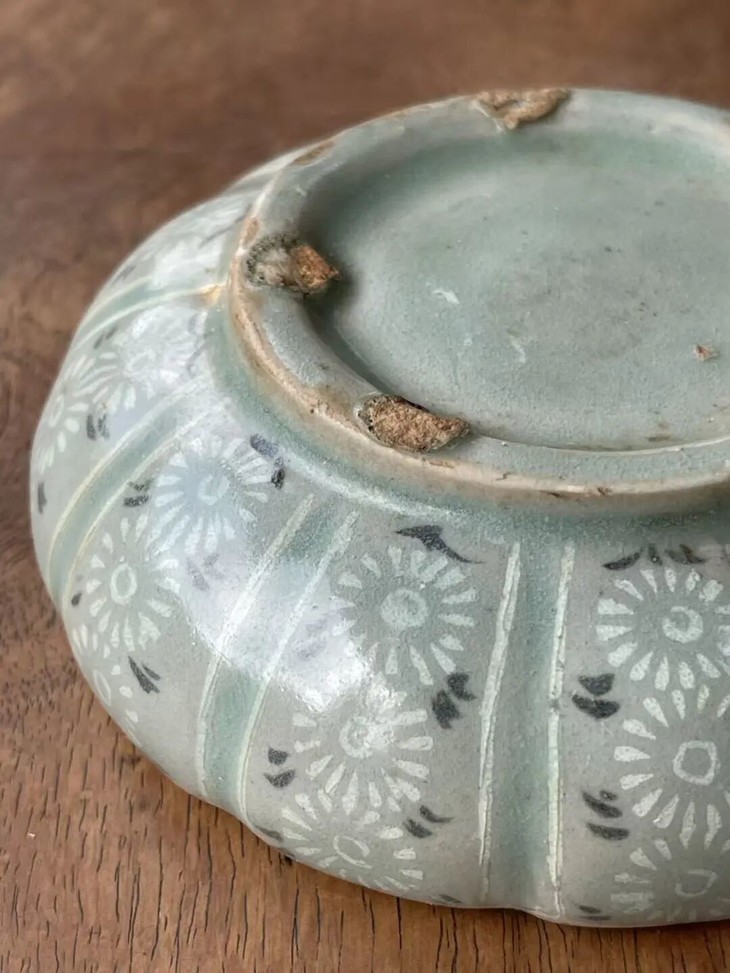 此象嵌青瓷花卉纹瓜棱束口笔洗,是一位专注于朝鲜瓷器的收藏家提供的藏品,如图所示,除表面有正常使用刮痕与磨痕外,除此以外保持完好。