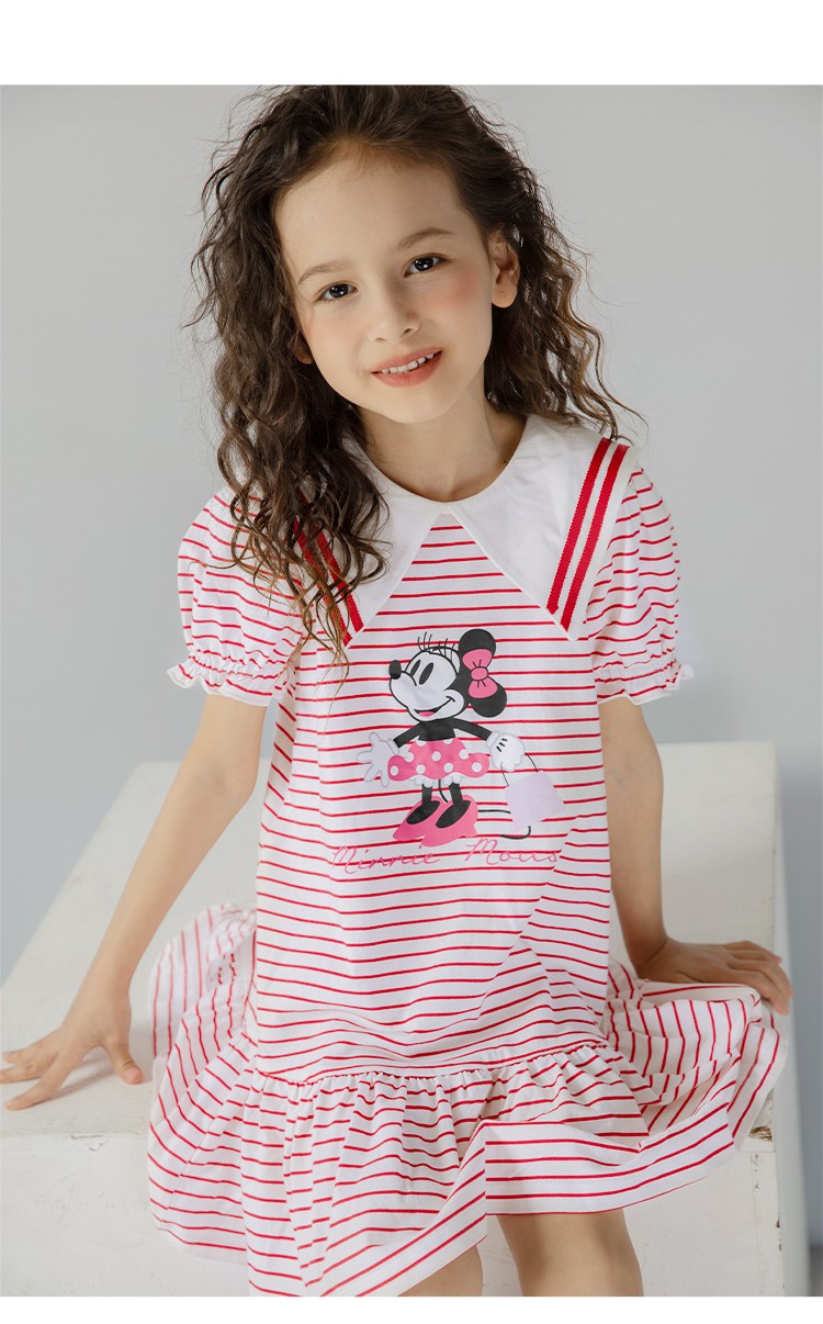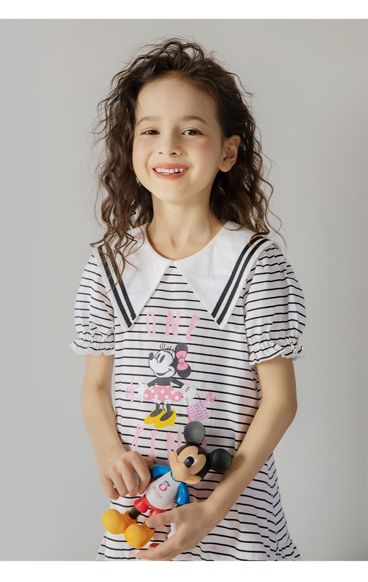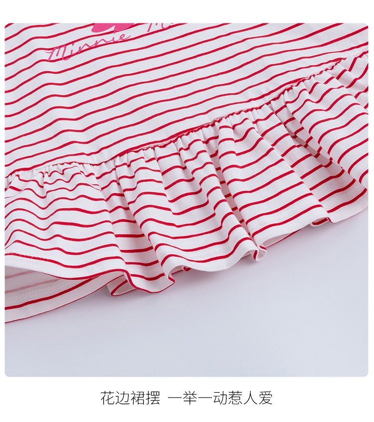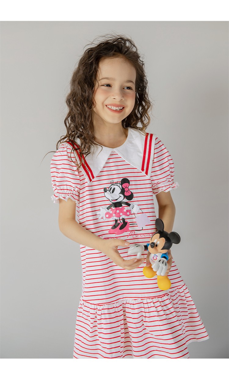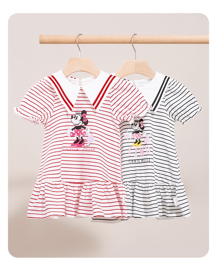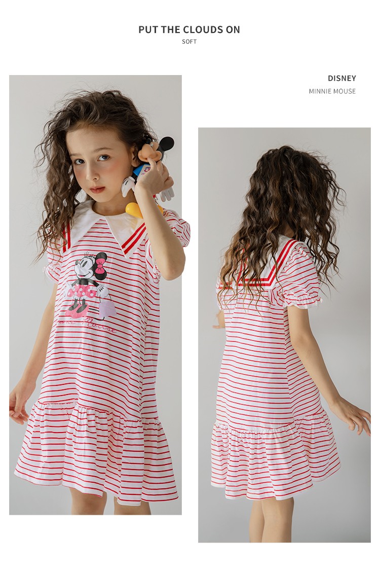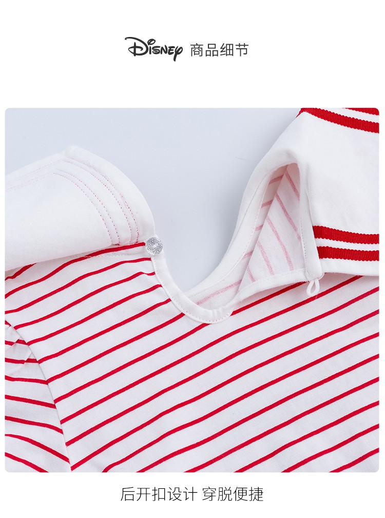 迪士尼新款短袖连衣裙海军风条纹休闲长裙