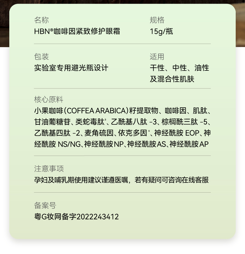 【品名】HBN咖啡因眼霜2.0 淡纹焕亮眼周 15g/瓶 【规格】15g/瓶 【备案编号】粤G妆网备字2022243412 【产地】国内 【保质期】3年 效期到2027年9月 【发货包装】独立包装 【发货地】杭州、广州、成都随机发 【发货快递】中通、圆通、申通、韵达随机发 【补邮费地区】新疆、西藏+18元 内蒙古、宁夏、甘肃、青海+8元 【发货时效】48-72小时,周末节假日顺延 |