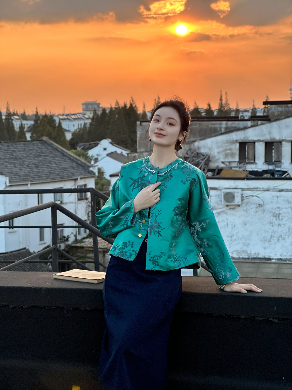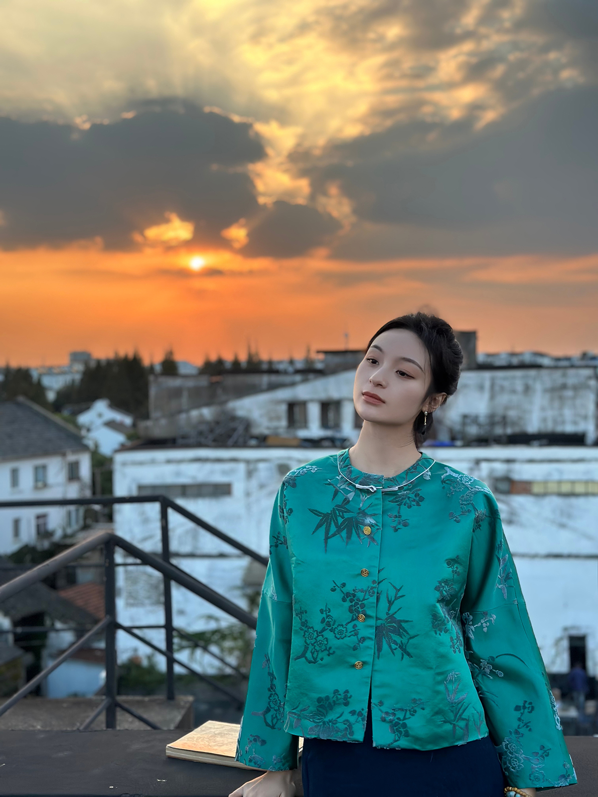 盛唐牡丹 |孔雀绿真丝漳绒圆领外套