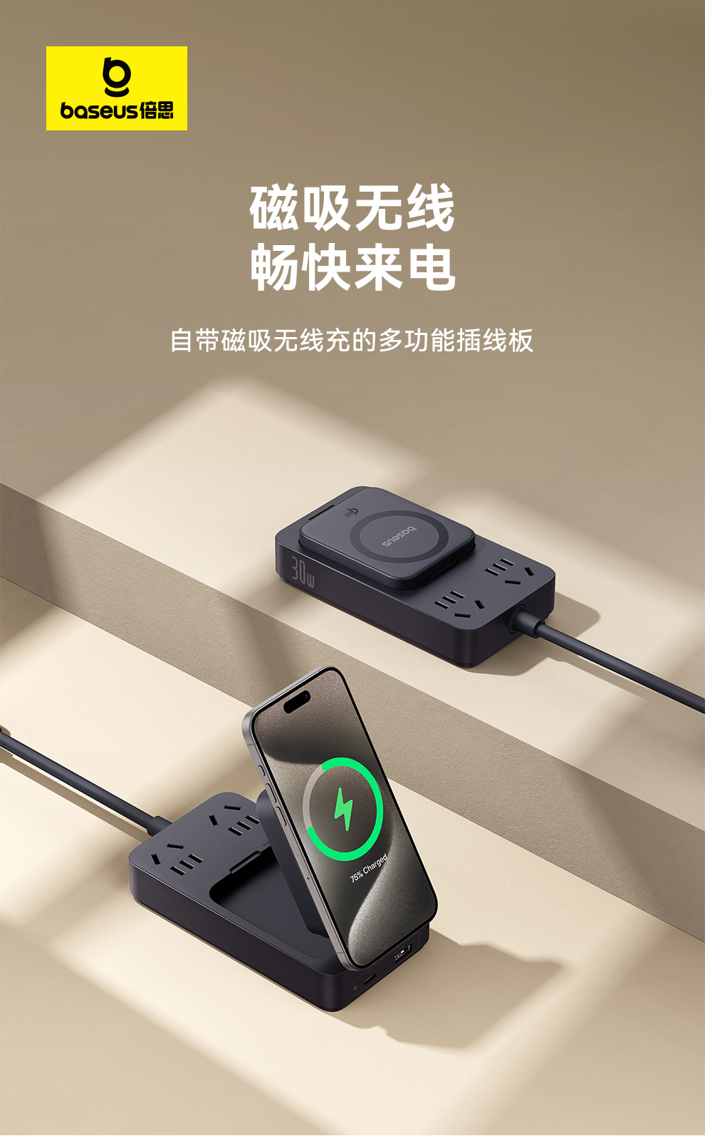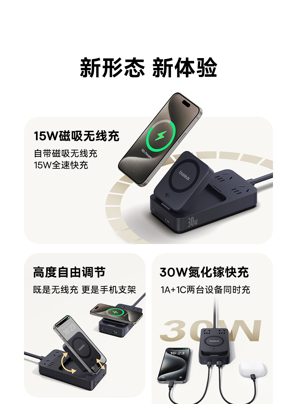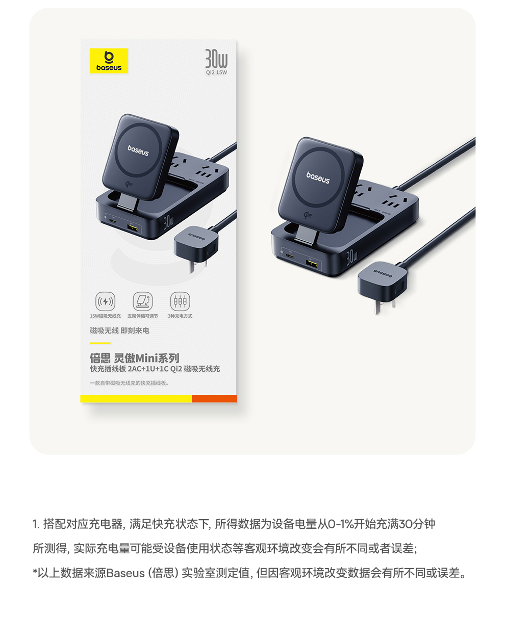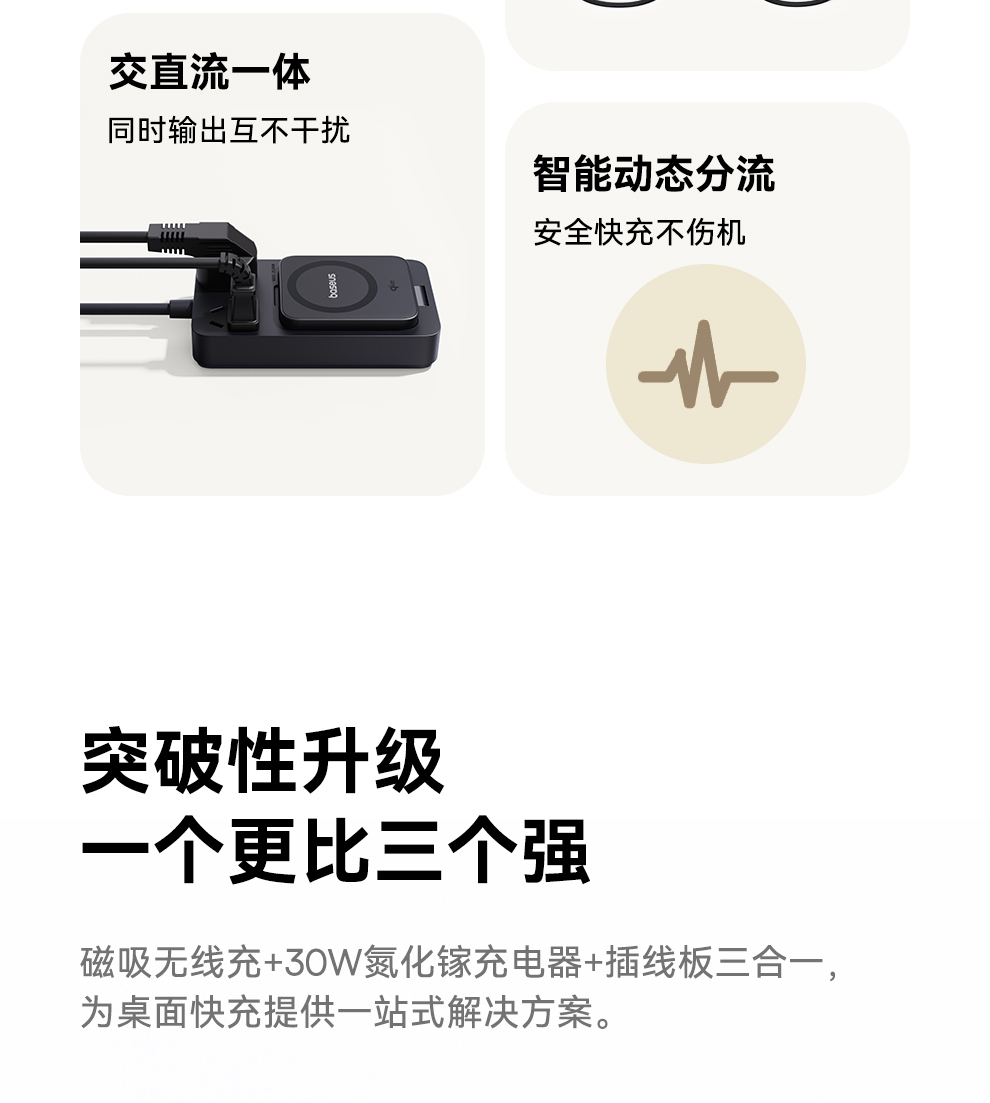 倍思 灵傲Mini系列 快充插线板 2AC+1U+1C+磁吸无线充 30W