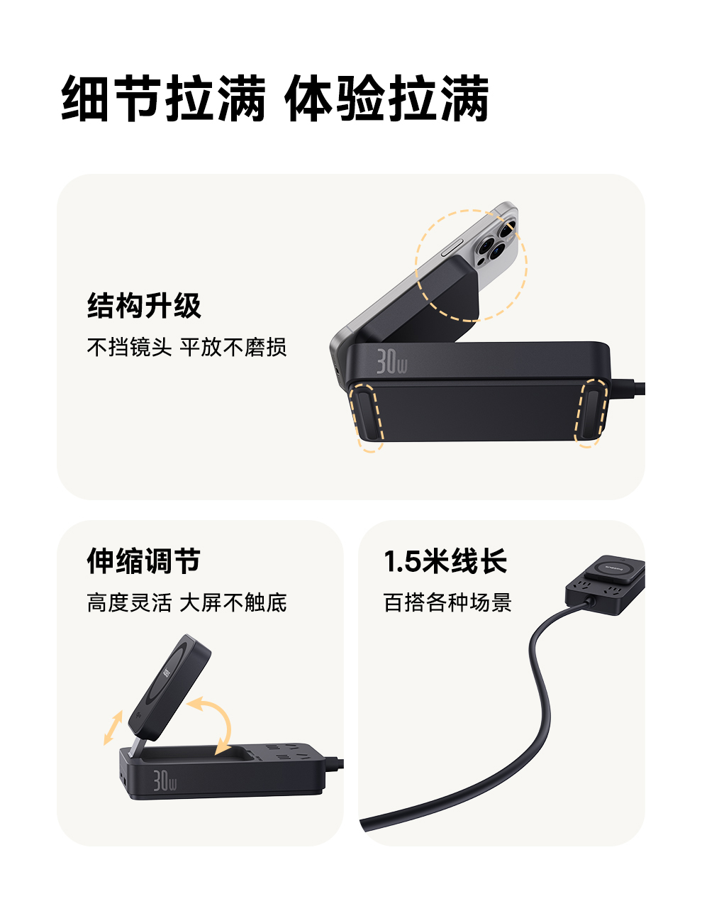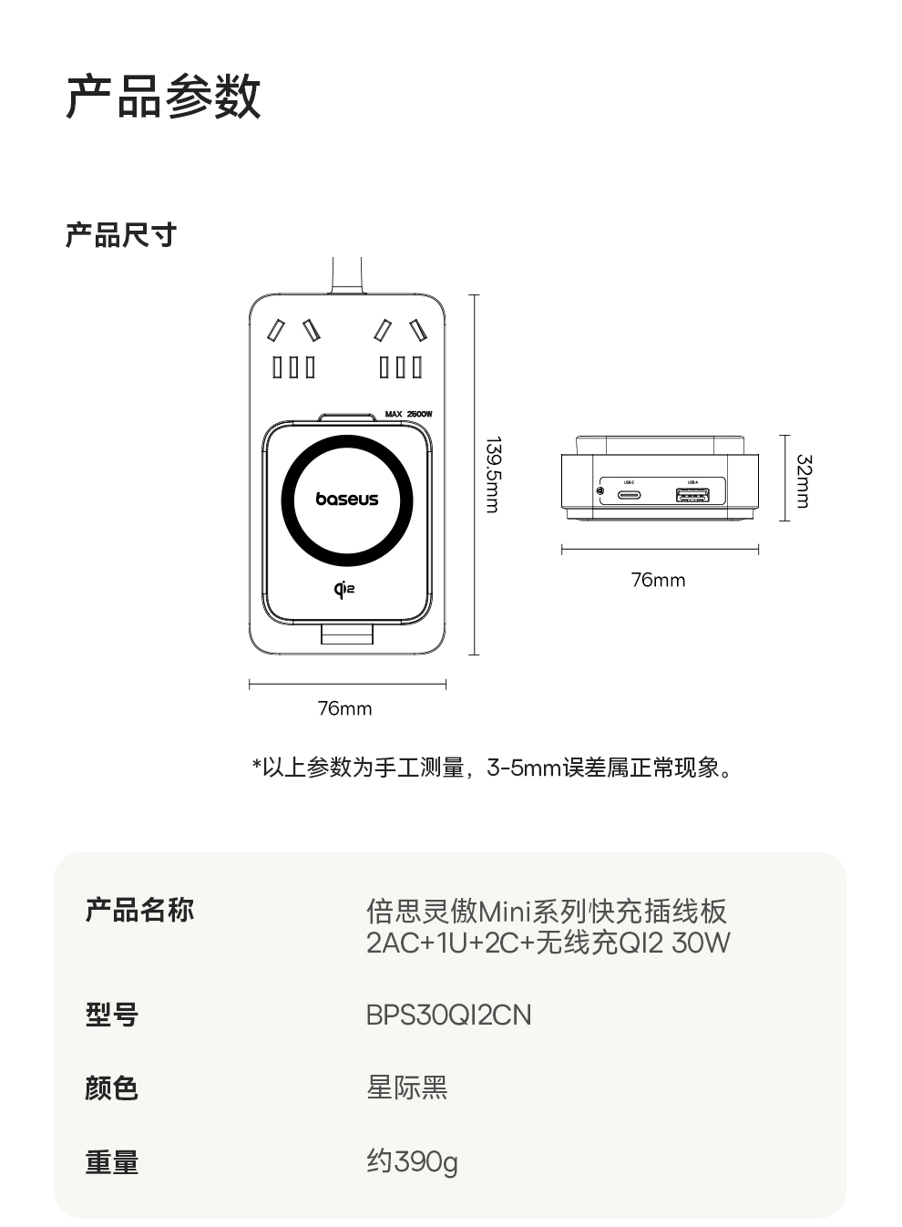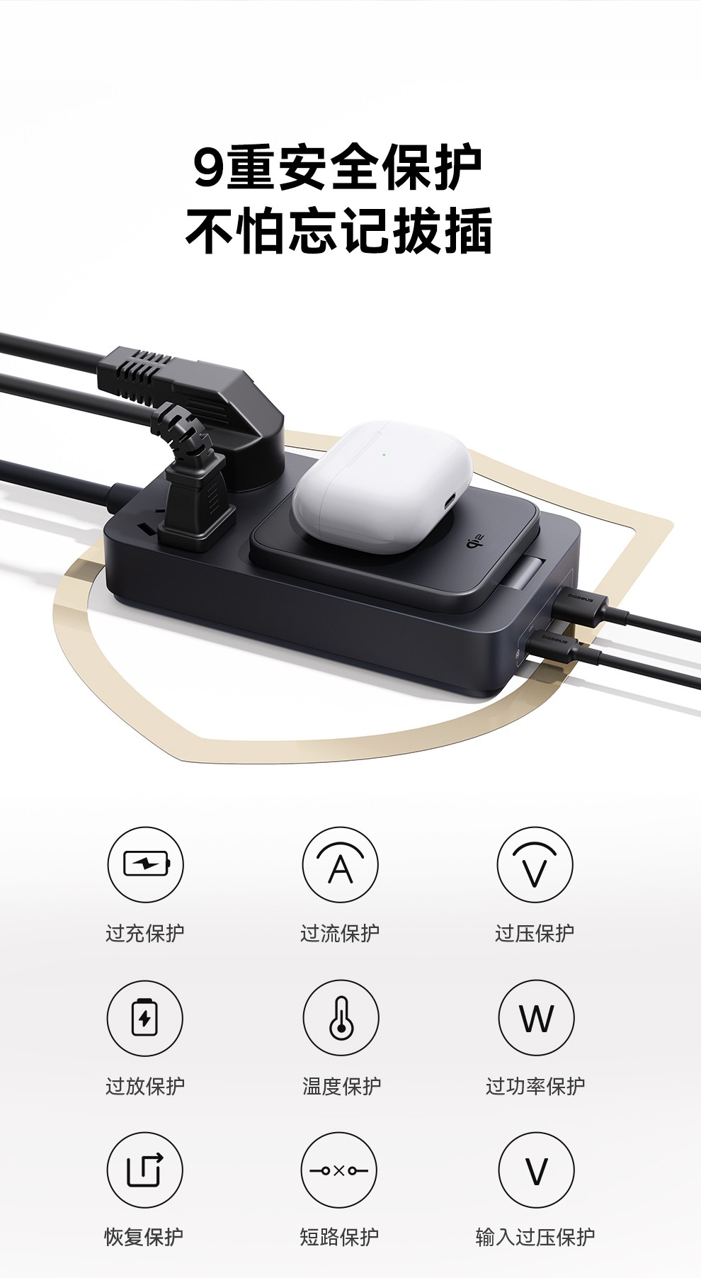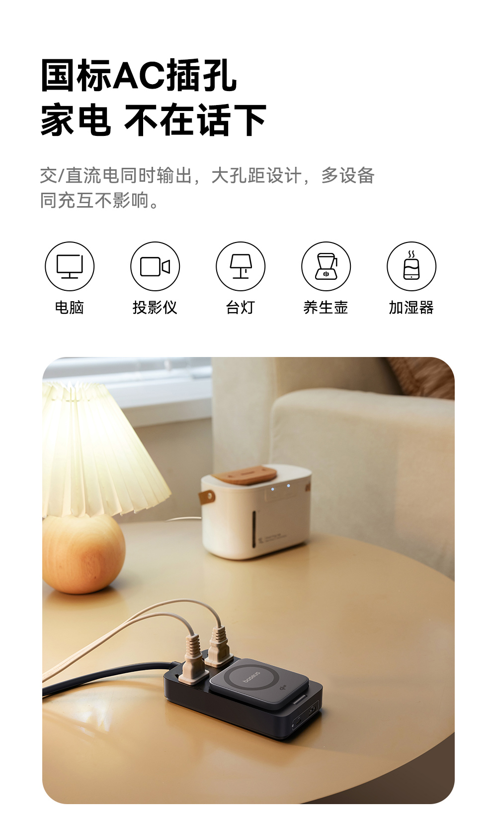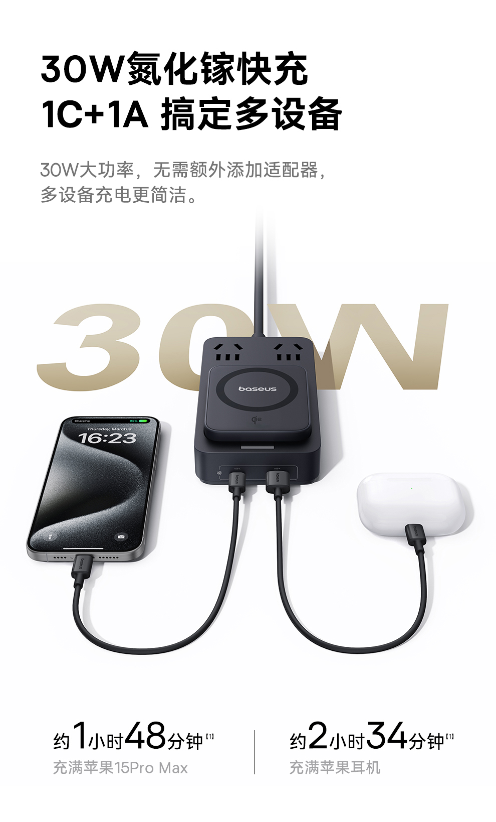 倍思 灵傲Mini系列 快充插线板 2AC+1U+1C+磁吸无线充 30W