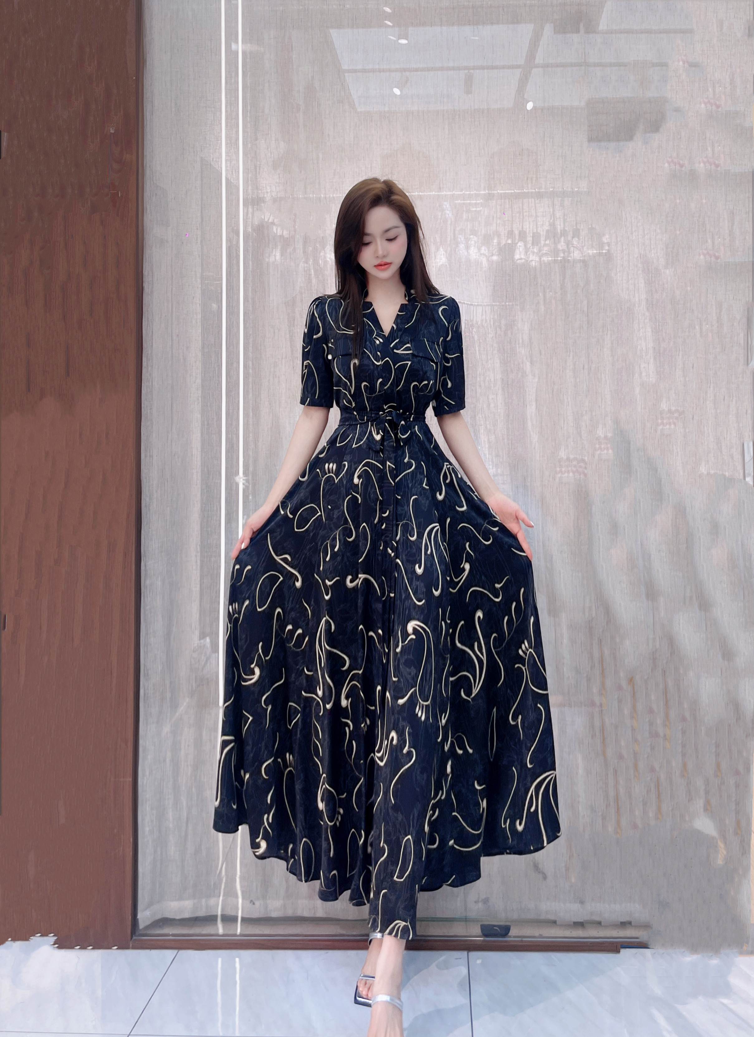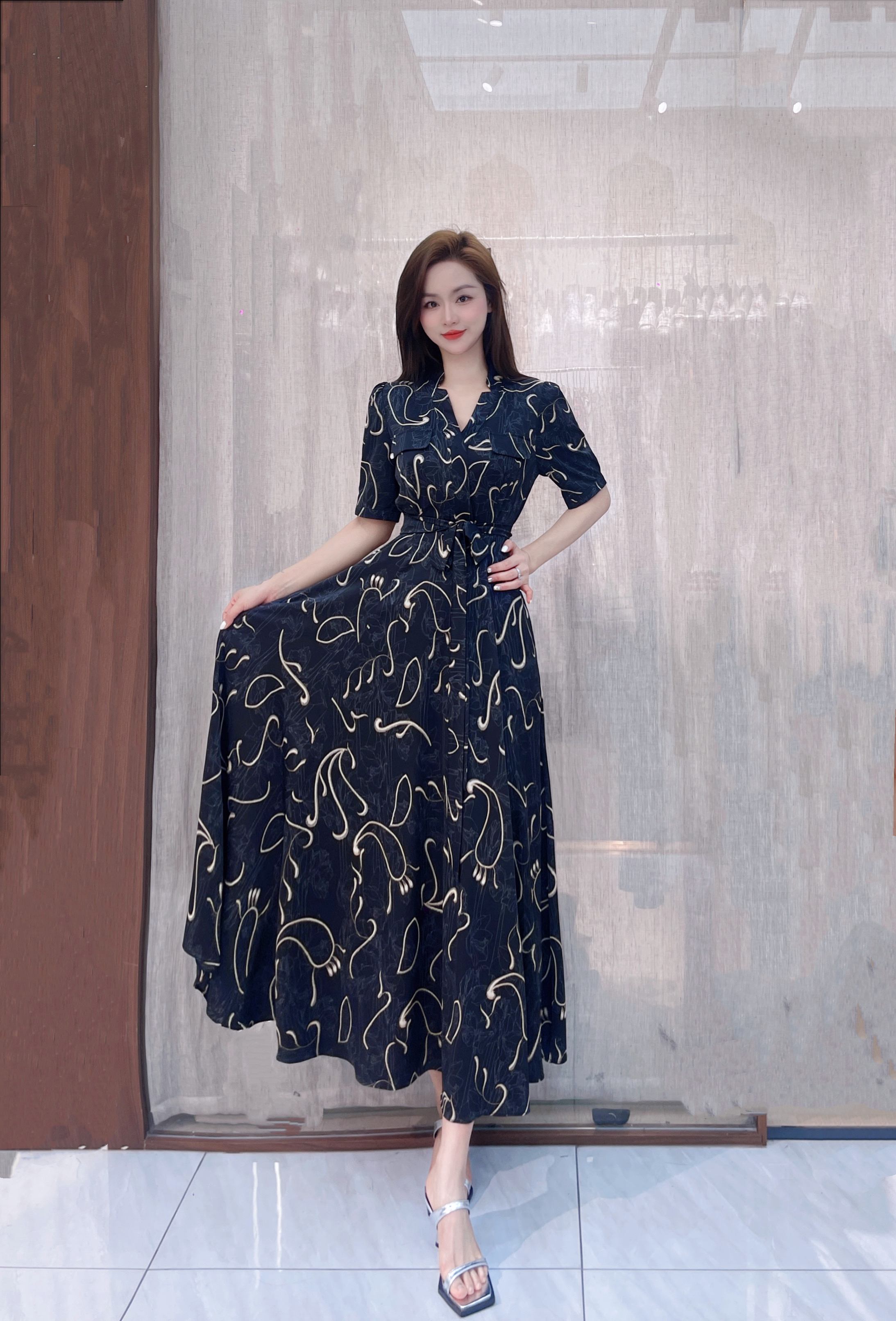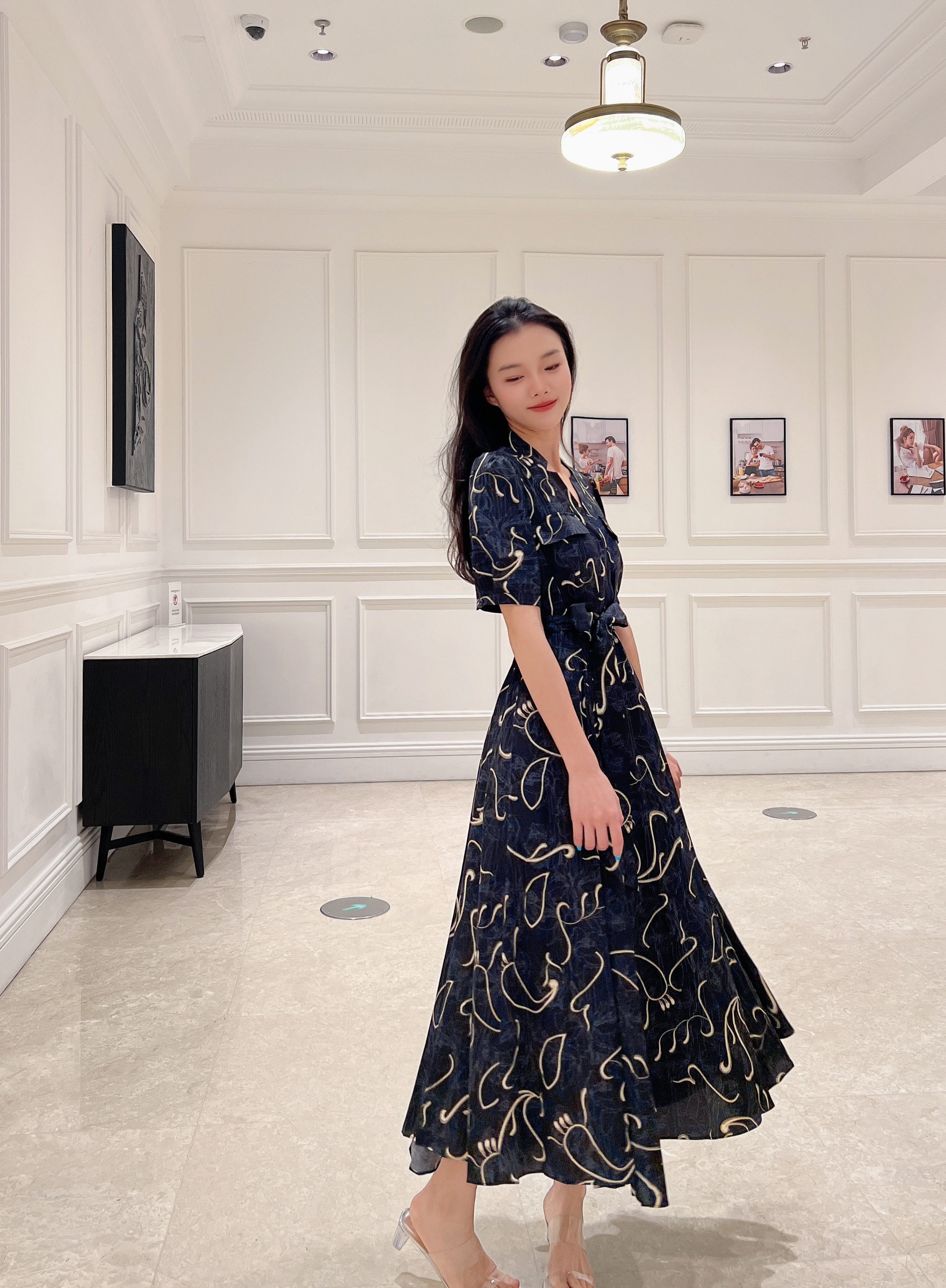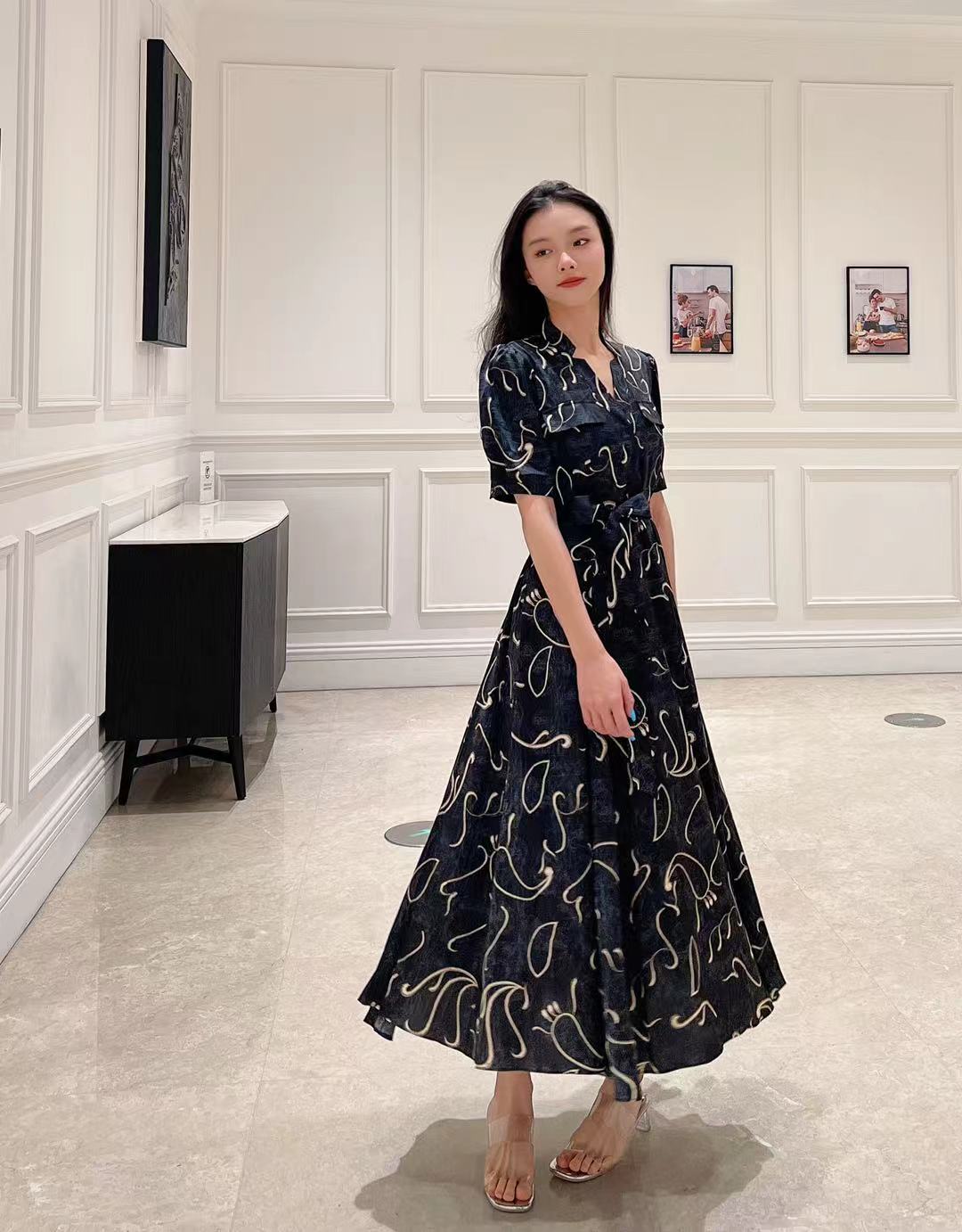 SZ2S66_漆黑色_连衣裙_夏季_V领短袖系带收腰大摆长款_高级女装_BERNIEELEN 伯妮斯茵