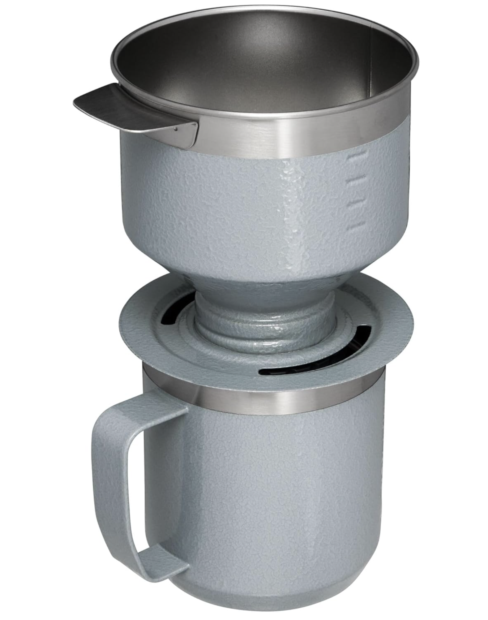 滴漏式咖啡机通常都用滤纸来过滤咖啡渣,这种咖啡机有三个缺点,一是部分咖啡的芳香油和微妙的味道会被吸收掉,二是配件繁多难以清洁,三是浪费咖啡滤纸。但Stanley The Camp 滴漏式咖啡套装就没有这些缺点,反而浑身上下都是优点,闪闪发光!它有上下两个组件,均采用优质不锈钢制成,酷酷的军绿色和Stanley的logo,一副永不过时能用几十年的样子。上层带有不锈钢细滤器,加入细磨咖啡末和热水后,能完整萃取出咖啡的独特香味,并缓缓滴漏入下层的咖啡杯中。咖啡杯为双层,保温效果好,让您的咖啡一天到晚都是热的。上层滤器内有刻度,很容易掌握咖啡和水的用量。滤器可拆下,冲一冲就光亮如新了。