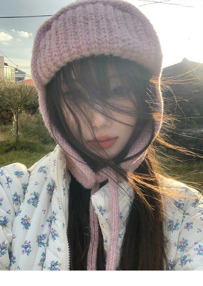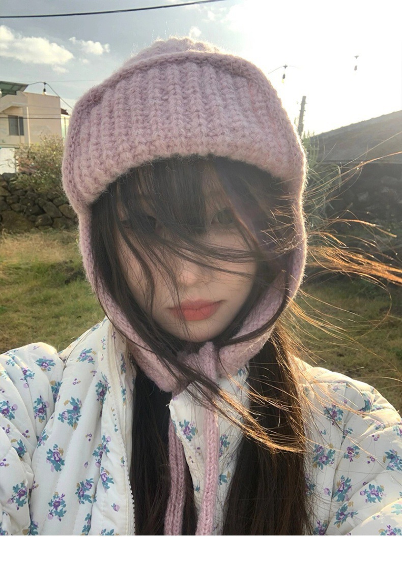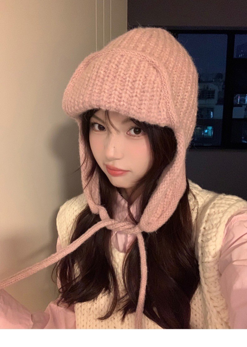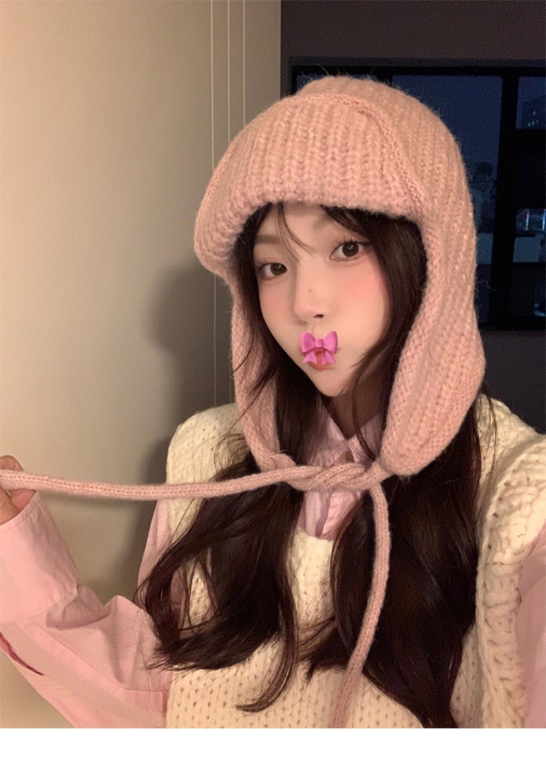 显脸小纯色系带针织毛线韩版出片神器飞行帽保暖护耳学生雷锋帽