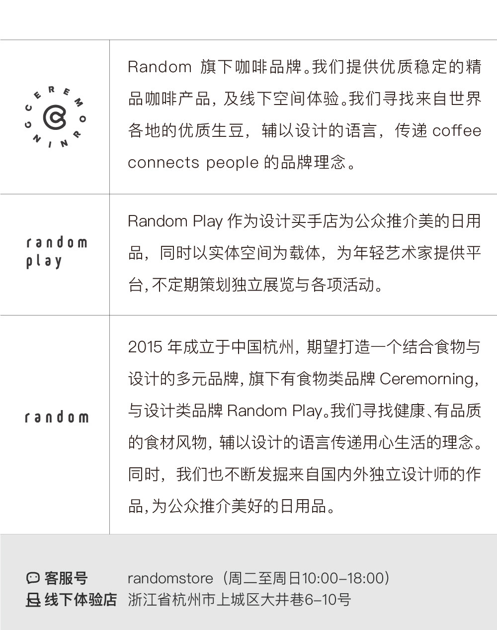 - Random是结合café与独立艺术设计的复合空间。我们致力于提供新鲜有机的饮品、甜点与沙拉,同时,也致力于引进国内外设计师的作品,并定期举办创意活动。希望倡导一种随心而至、健康精致的生活方式。