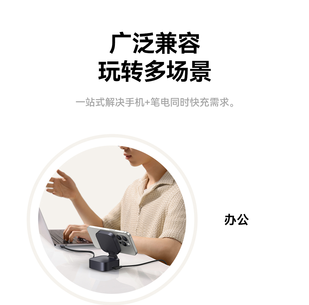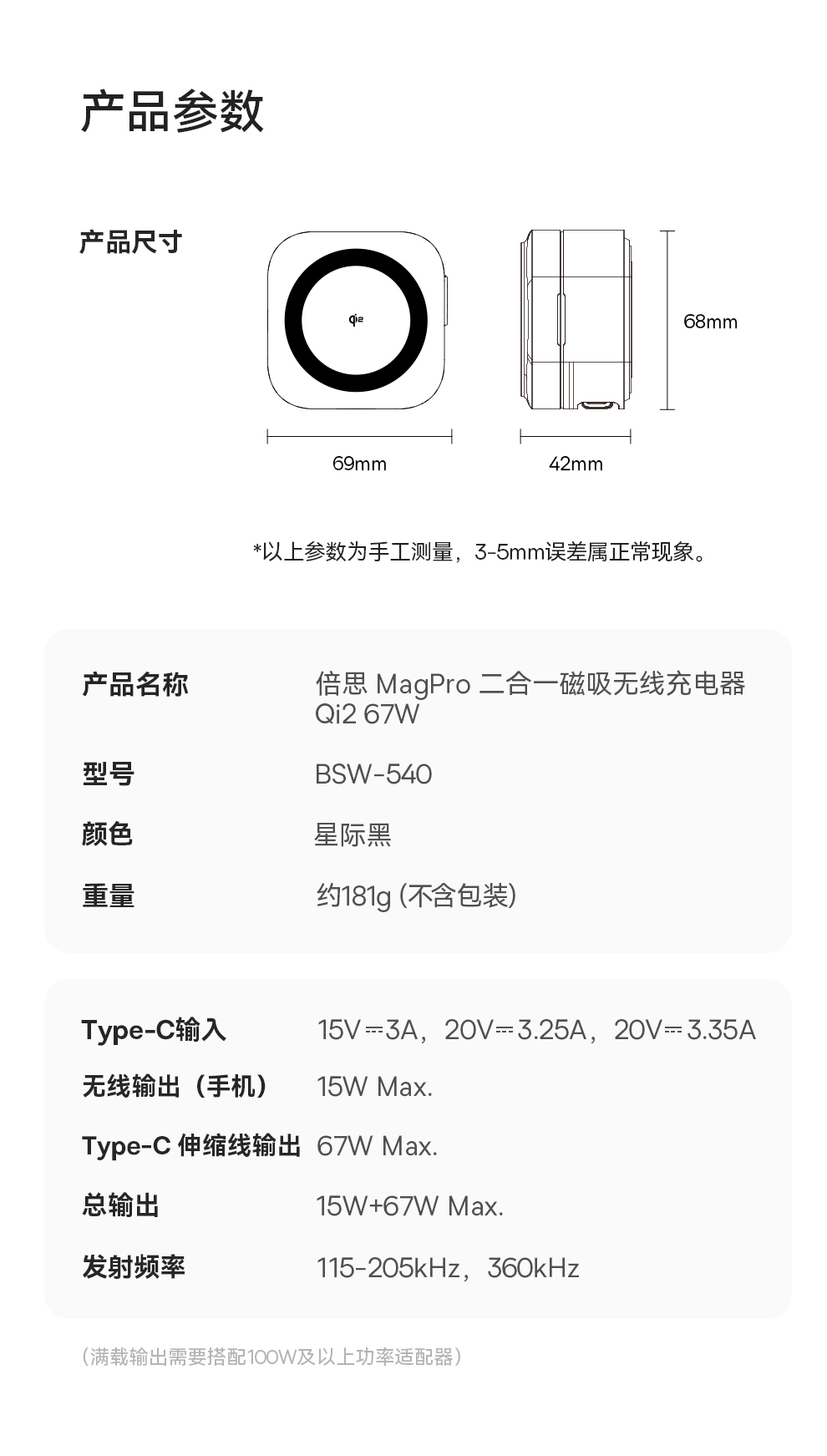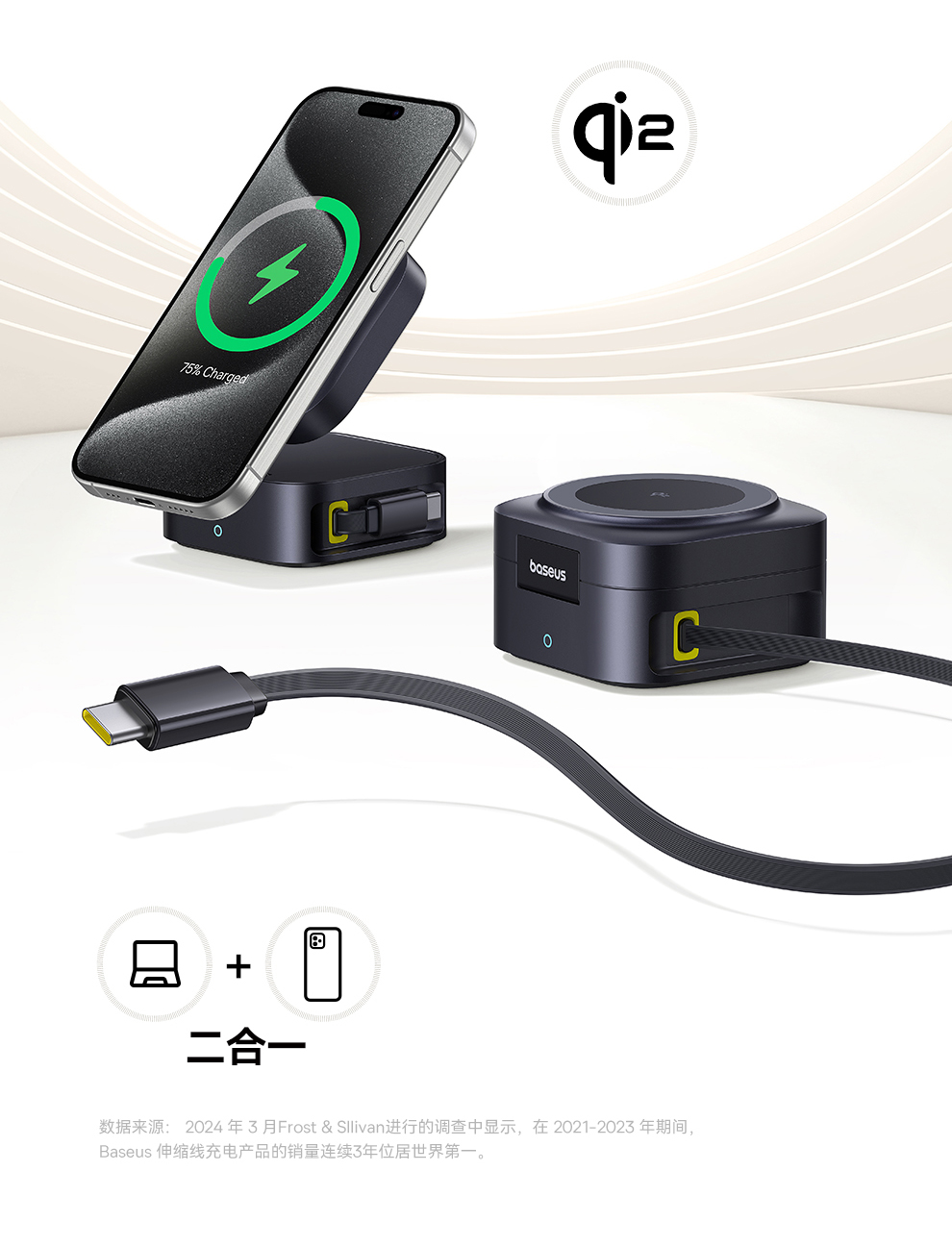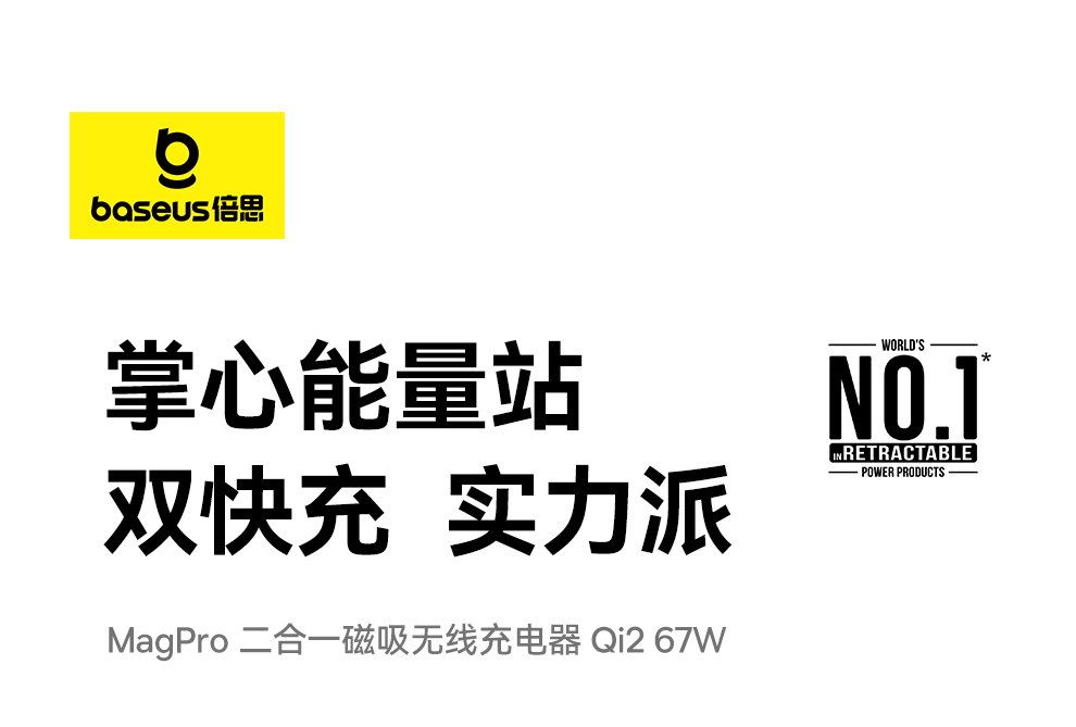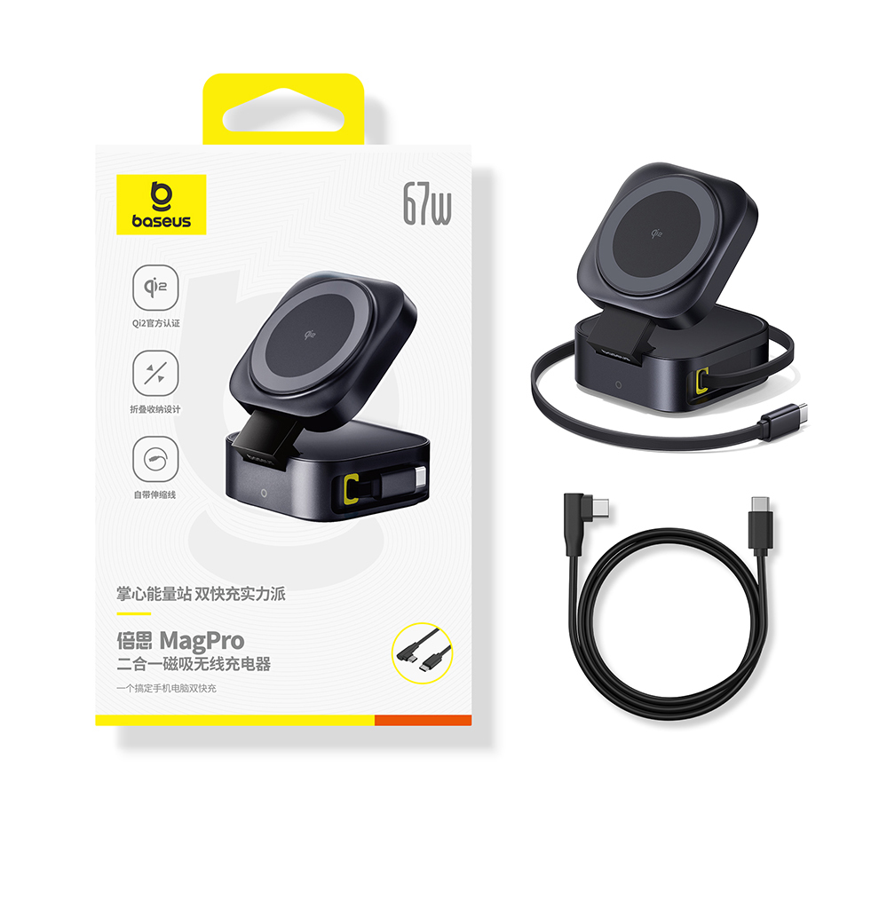 倍思 MagPro 二合一磁吸无线充电器 Qi2 67W 星际黑 (含:倍思 弯头数据线 Type-C to Type-C 100W 1m 黑色)