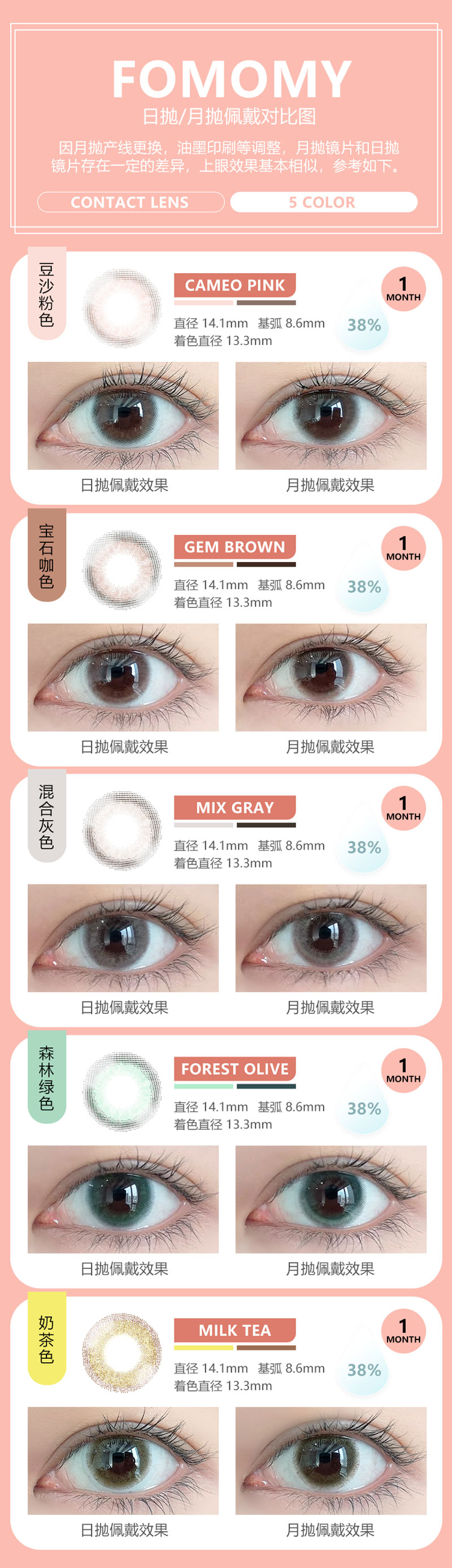 FOMOMY月抛材质很优秀,用的是ETAFLICON A材质,相比硅水凝胶在舒适度、视觉感等各方面都会更优秀,在保存液里采用了MOIST技术添加了MPC聚合物,直接拿出来就能戴,不用再过一遍护理液。含水度38%,BC8.6,DIA14.1mm,都是我觉得很适中,也相对舒适的一个规格,直径不会大到很难戴,可以说只要不是特别敏感的人,戴起来都不会有异物感,而且,一天下来基本不会觉得眼干。