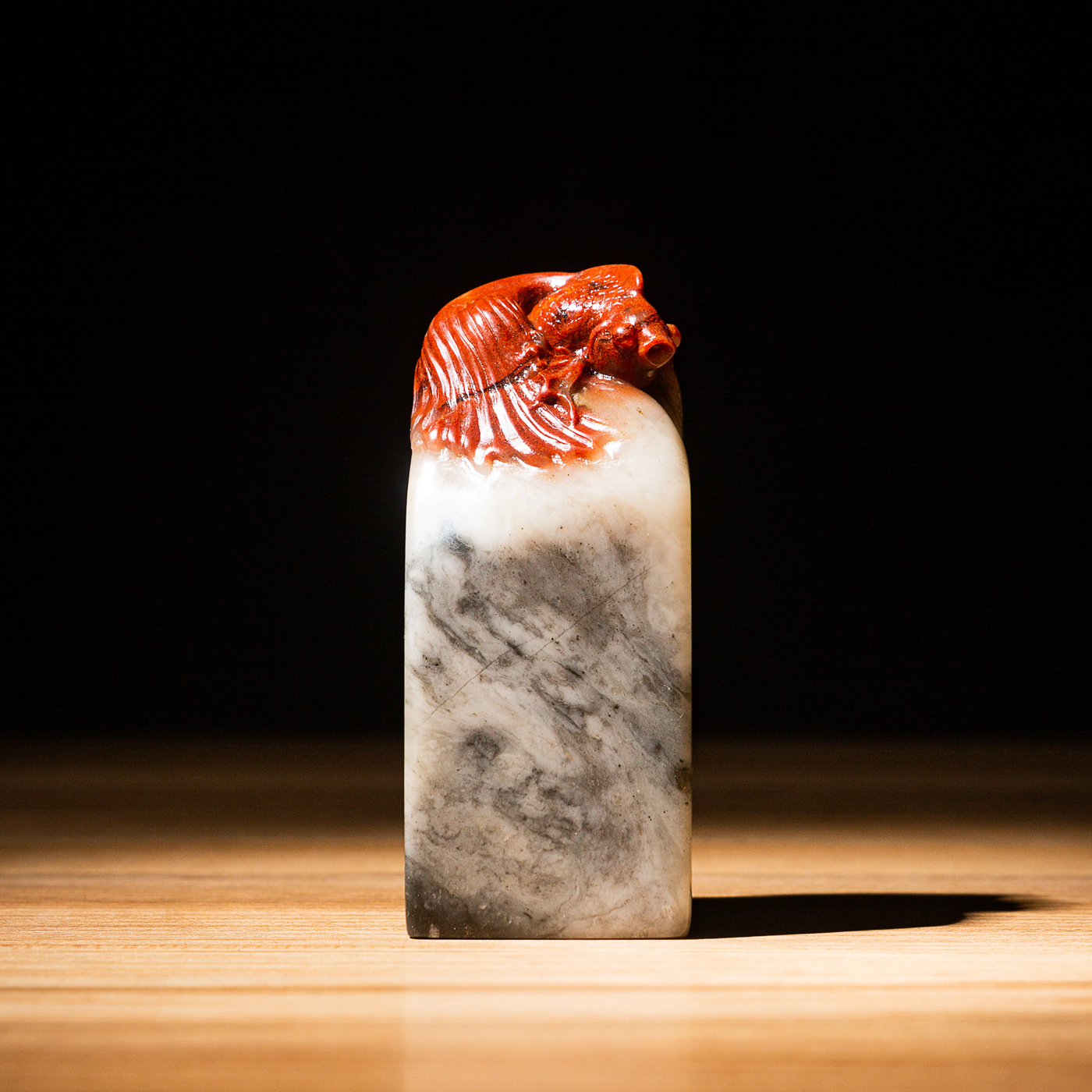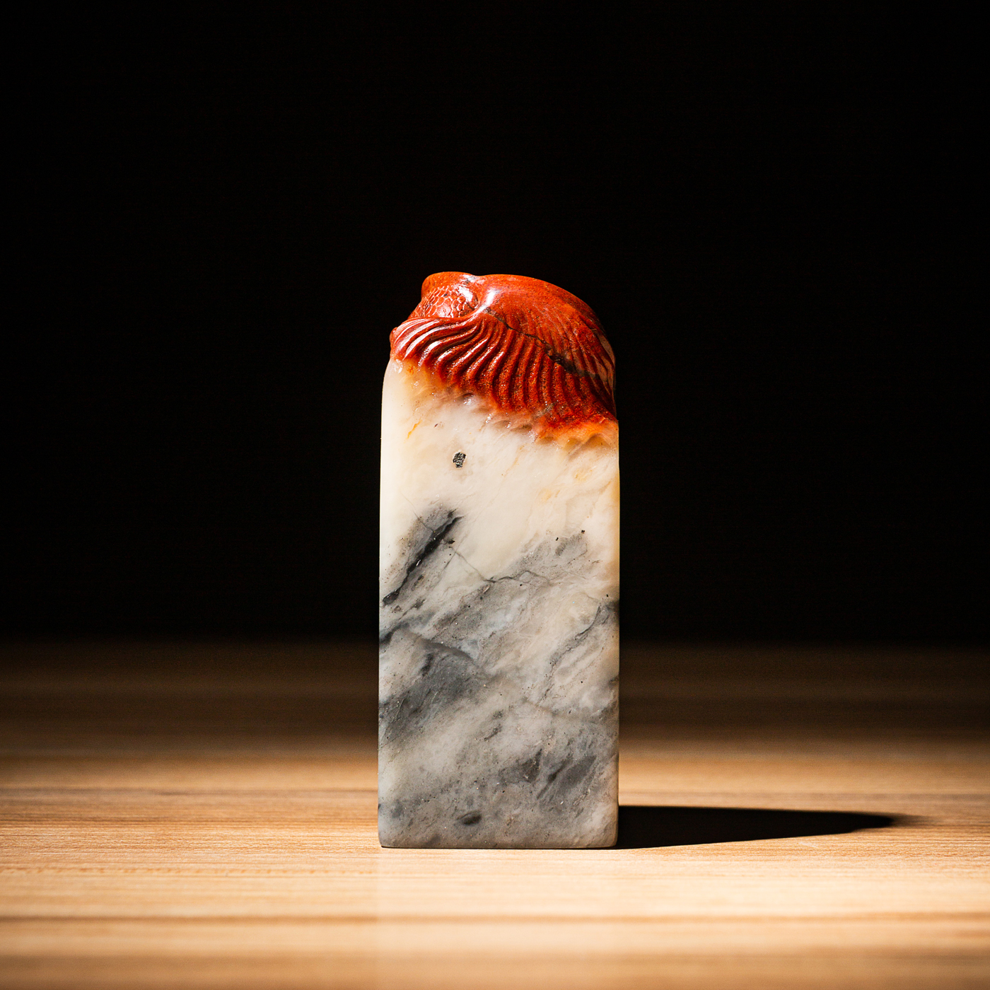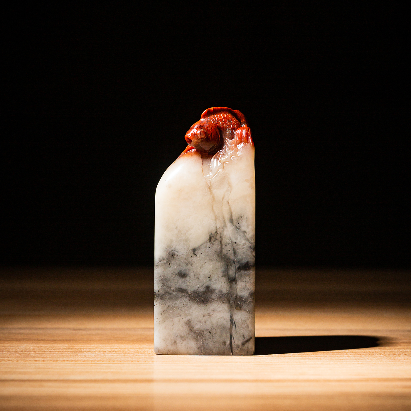 寿山石芙蓉老料雕“蝶尾金鱼”方章,选料为存放几十年之老料,料质极佳。其雕工精细,题材刻画生动,极具艺术效果和实用性。