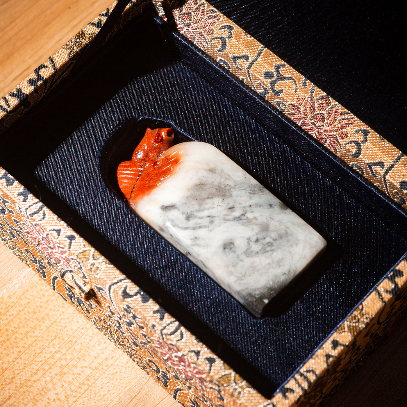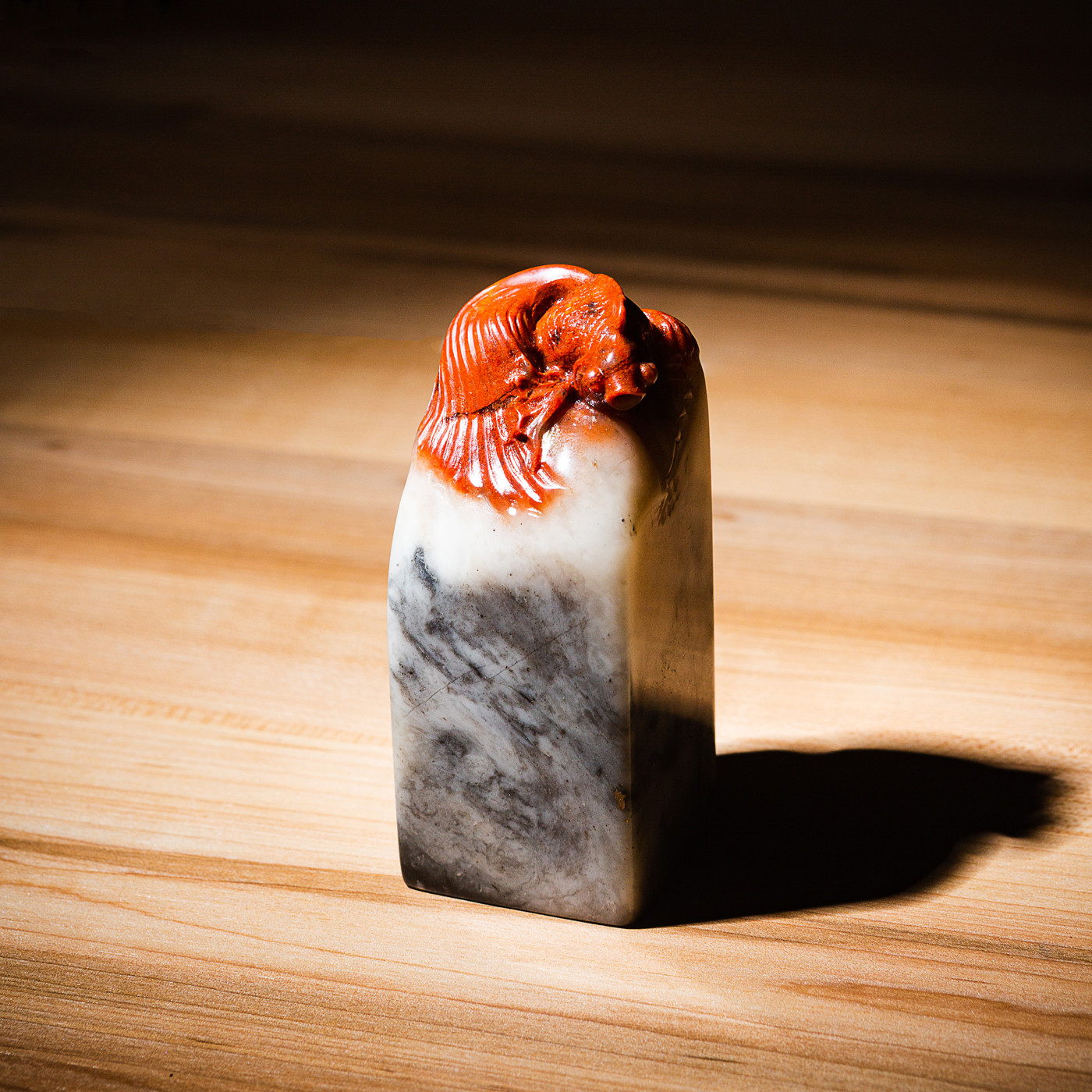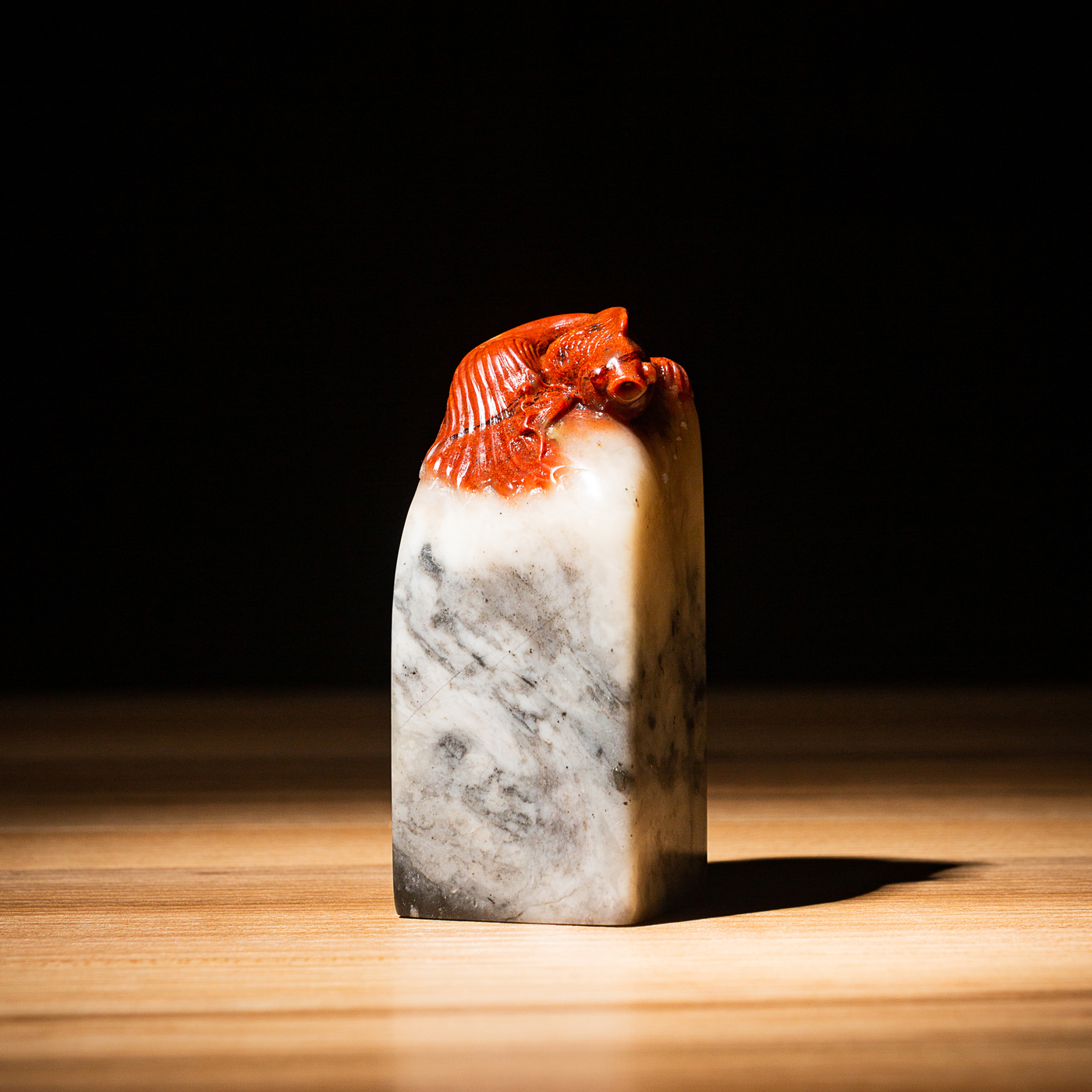 寿山石芙蓉老料雕“蝶尾金鱼”方章,选料为存放几十年之老料,料质极佳。其雕工精细,题材刻画生动,极具艺术效果和实用性。