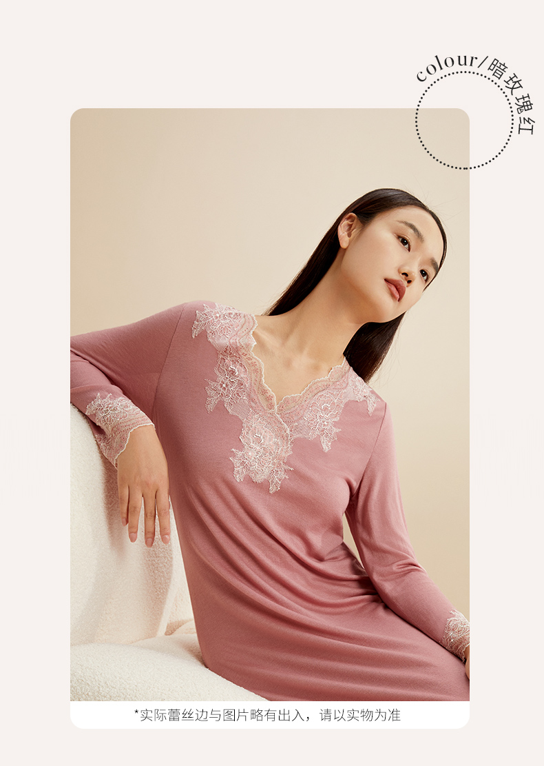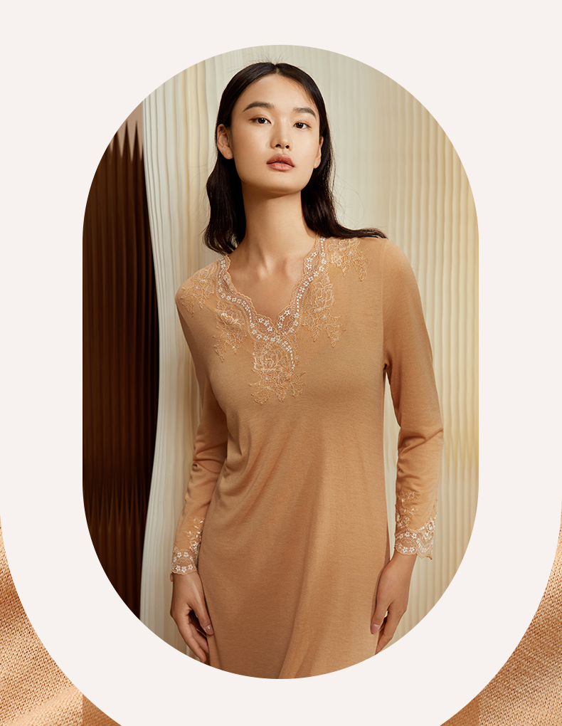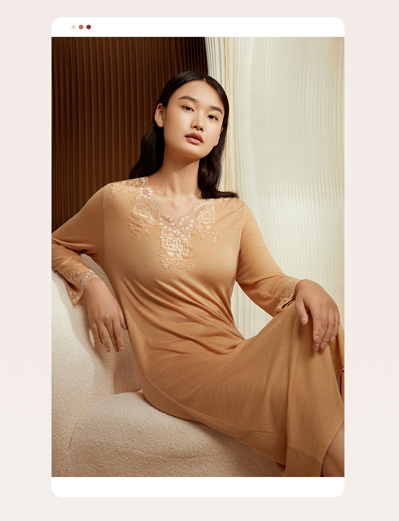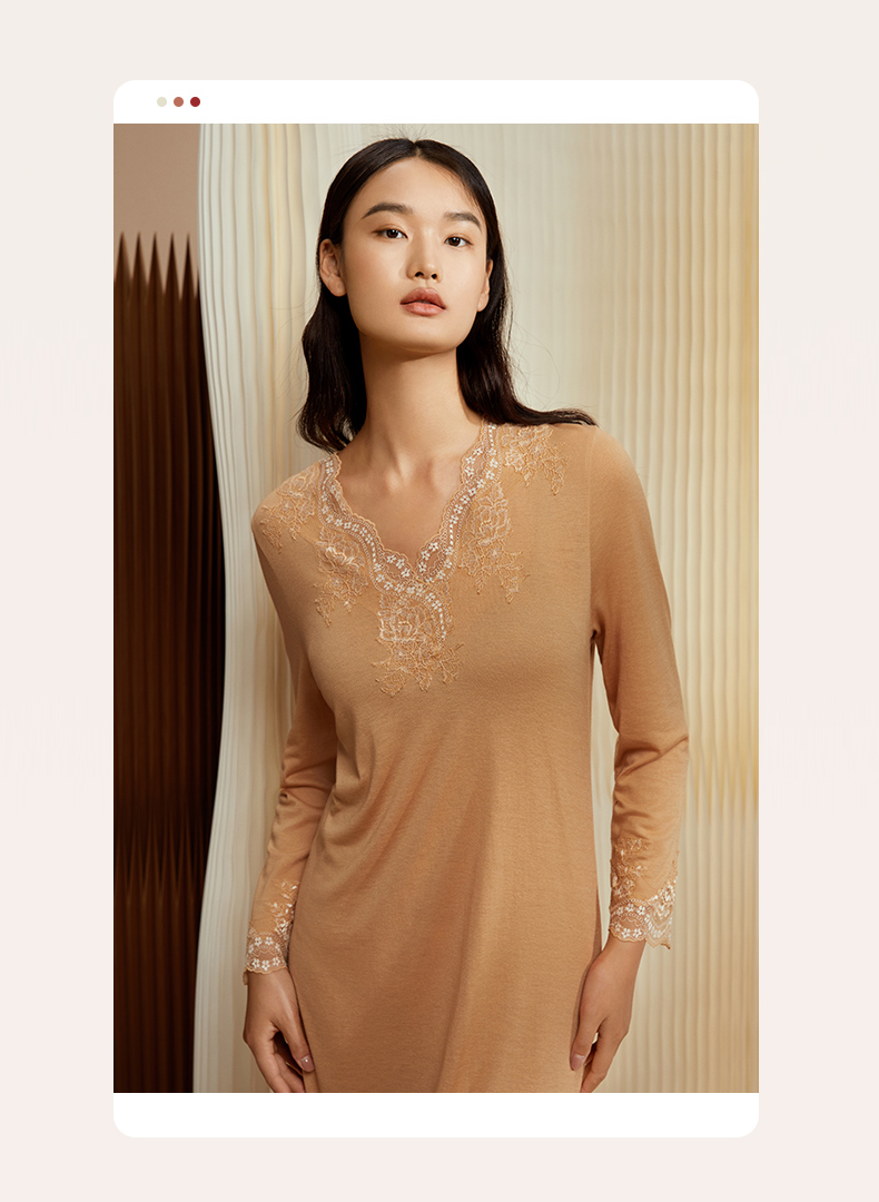 金三塔桑蚕丝&羊毛 温暖轻盈 舒适亲肤女士拼蕾丝优雅睡裙家居服 YZFCD301