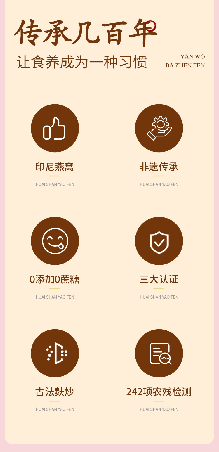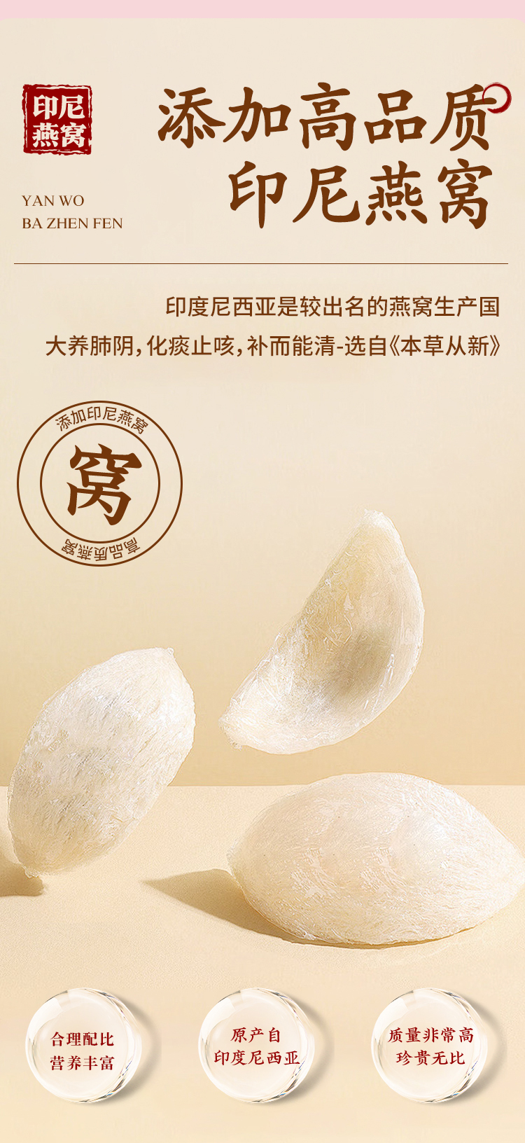 1.甄选高品质印尼燕窝≥1200mg+42%怀山药粉。