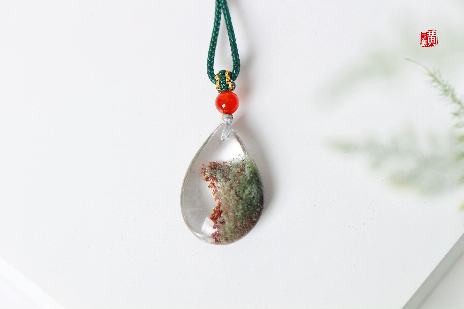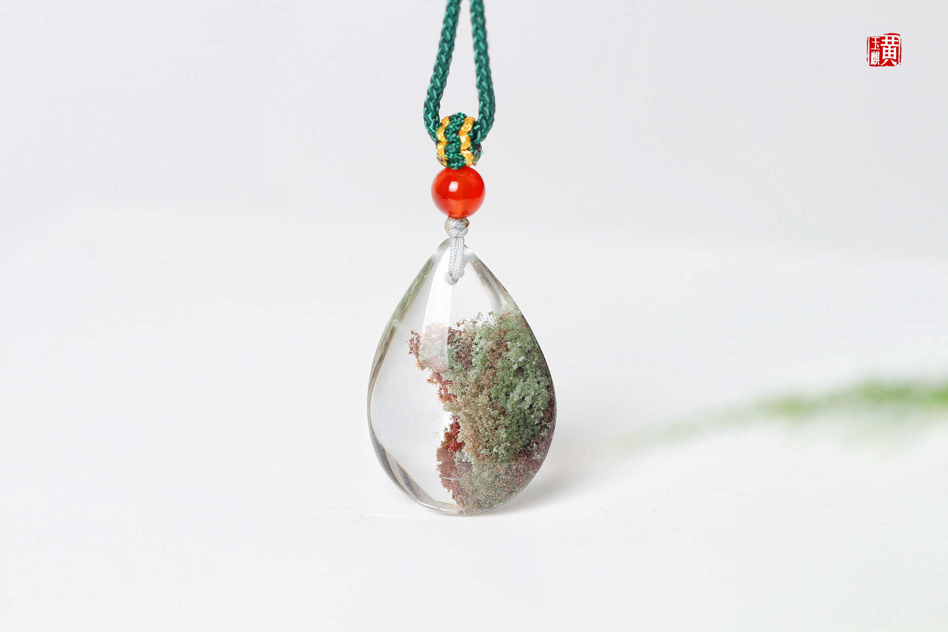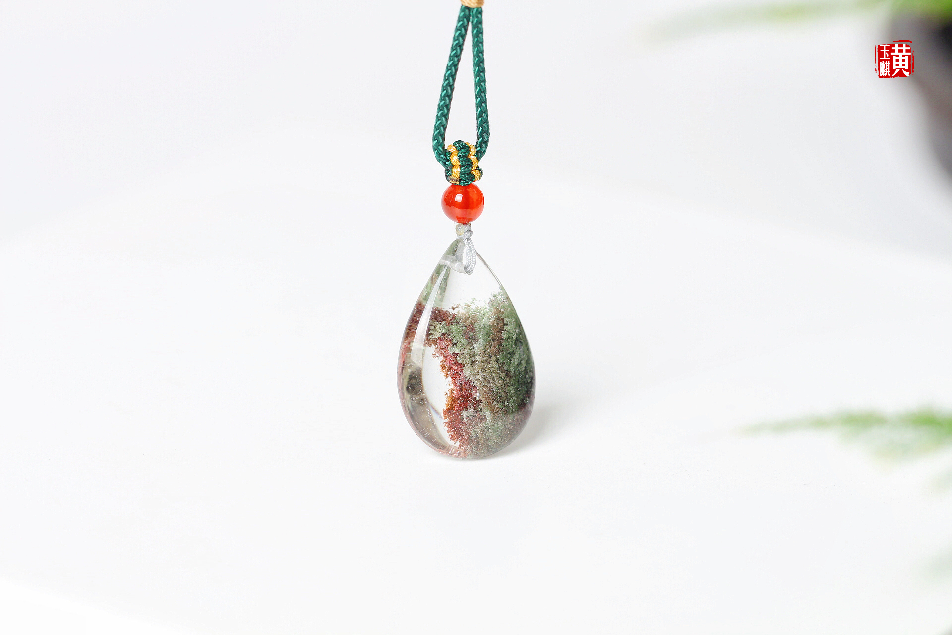 绿幽灵水晶吊坠,一半白水晶一半幽灵,晶体通透干净,红幽灵和绿幽灵相交,层次分明,色泽鲜艳亮丽,寓意事业红火、财富如山。
