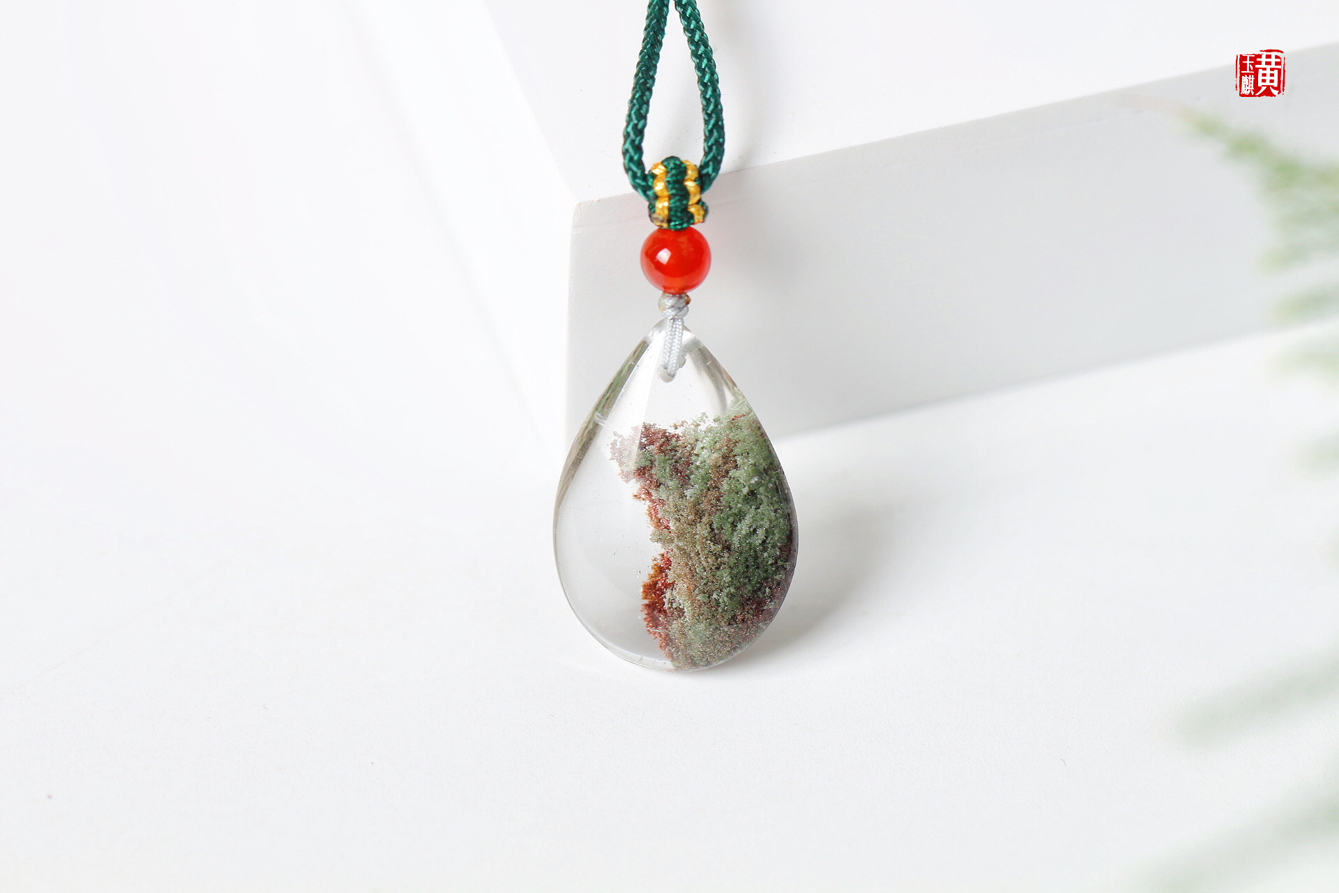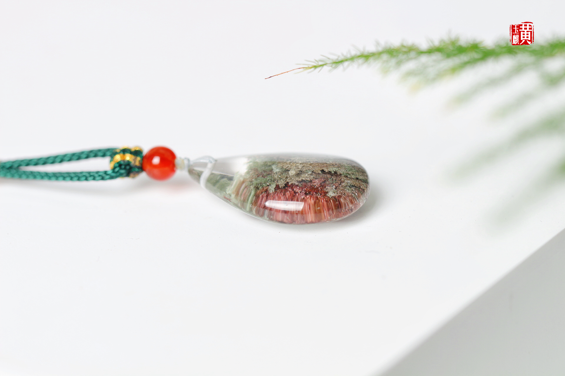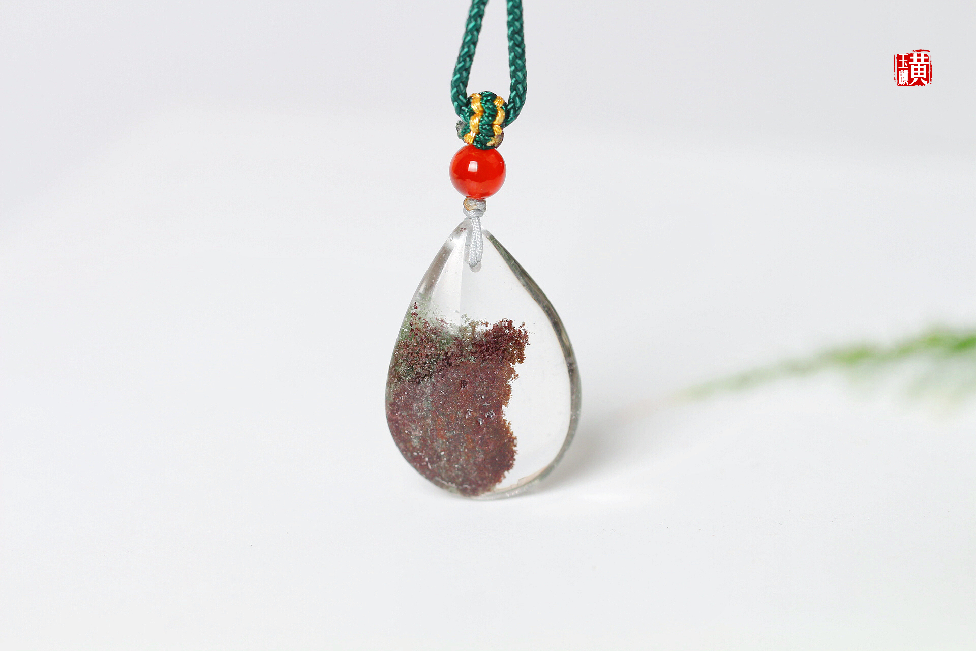 绿幽灵水晶吊坠,一半白水晶一半幽灵,晶体通透干净,红幽灵和绿幽灵相交,层次分明,色泽鲜艳亮丽,寓意事业红火、财富如山。