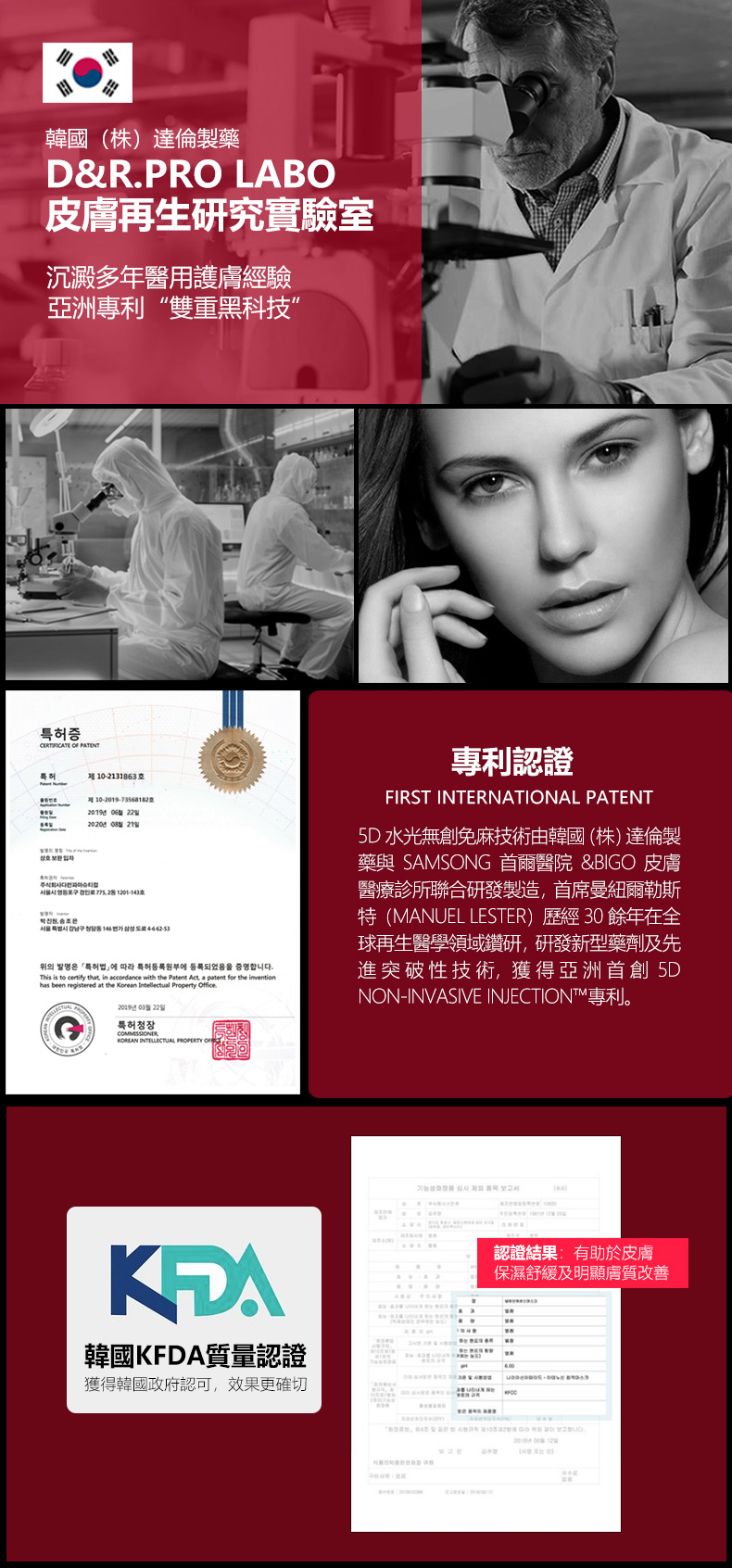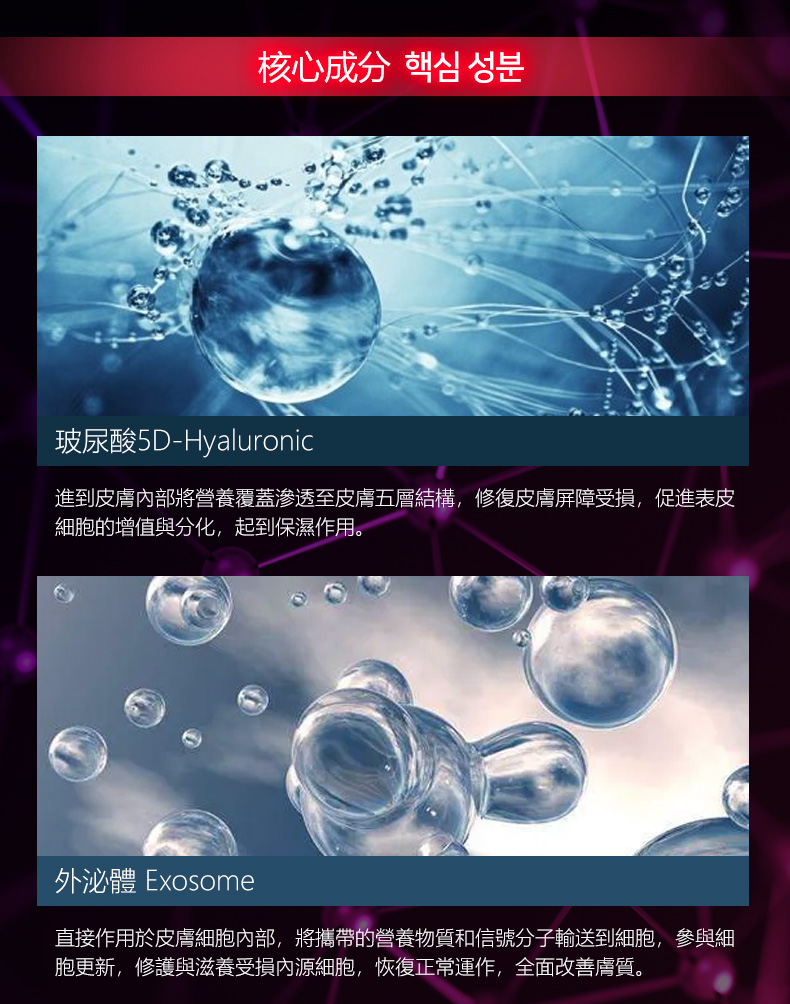 除此之外,还添加了大量最新科研成果的成分,比如直接参与到细胞更新,修复受损的内源细胞的外泌体; 减少凋亡细胞,促进DNA修复,对抗光老化的二裂酵母;促进伤口愈合和延缓衰老的蓝铜胜肽。可以说院线的基础版的注射式水光针都没有这么华丽的成分。