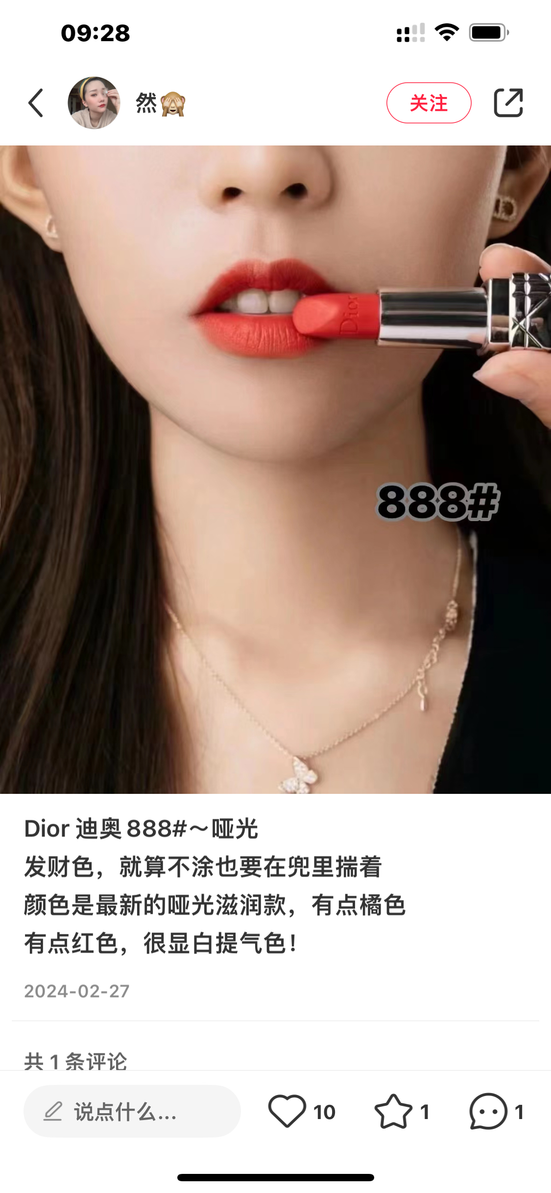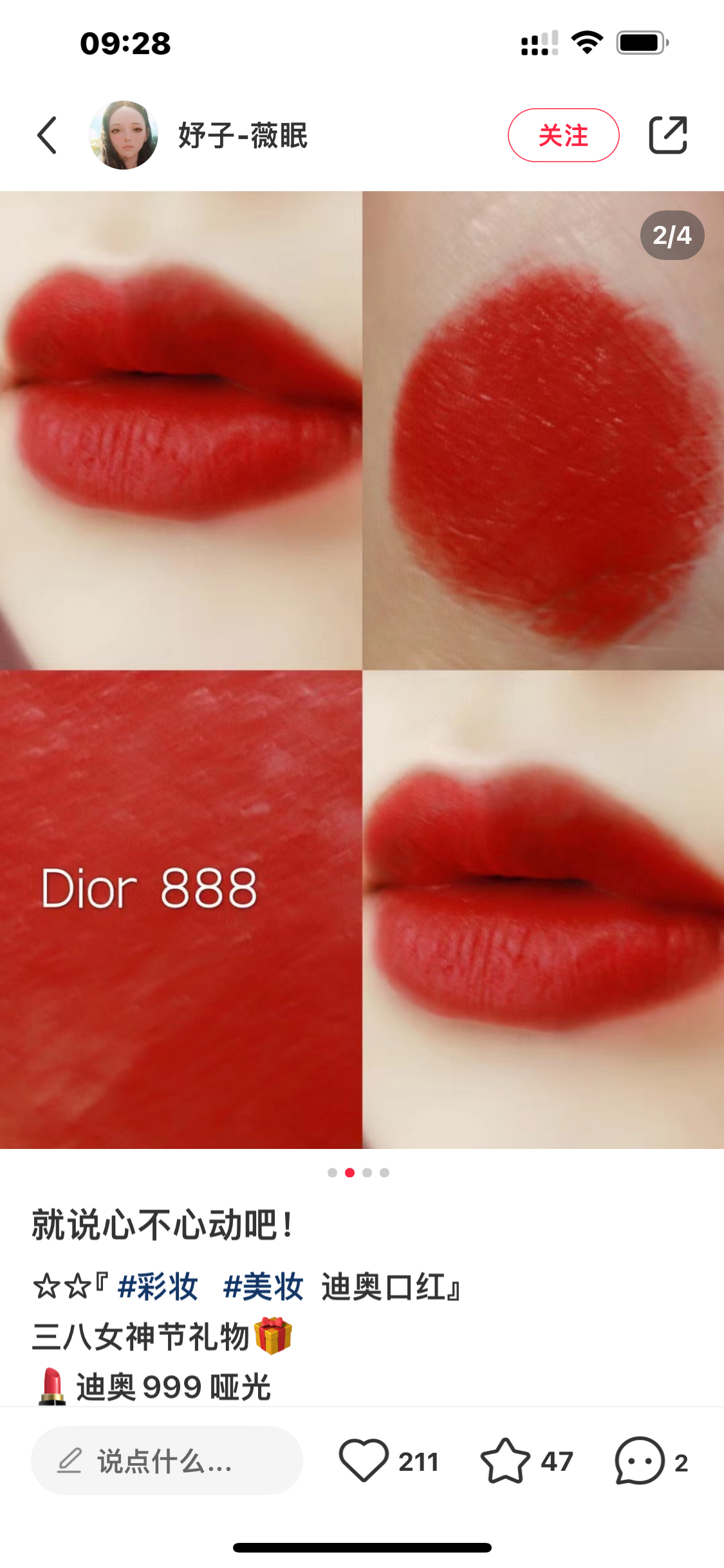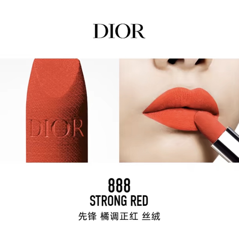 号称"幸运发财色",相比迪奥最火的999来说会更偏橘一点,薄涂日常很,对黄皮也很友好哦~说一下上嘴的感觉,这只是哑光质地,不用唇膏打底直接上嘴也不拔干!总体来说颜色、质地都很不错的一只,可以放心入,不会踩雷的颜色,如果纠结999和888,平时不化妆的话,我比较推荐888,个人感觉偏橘会更日常一些,也更适合黄皮的小仙女一点哟~